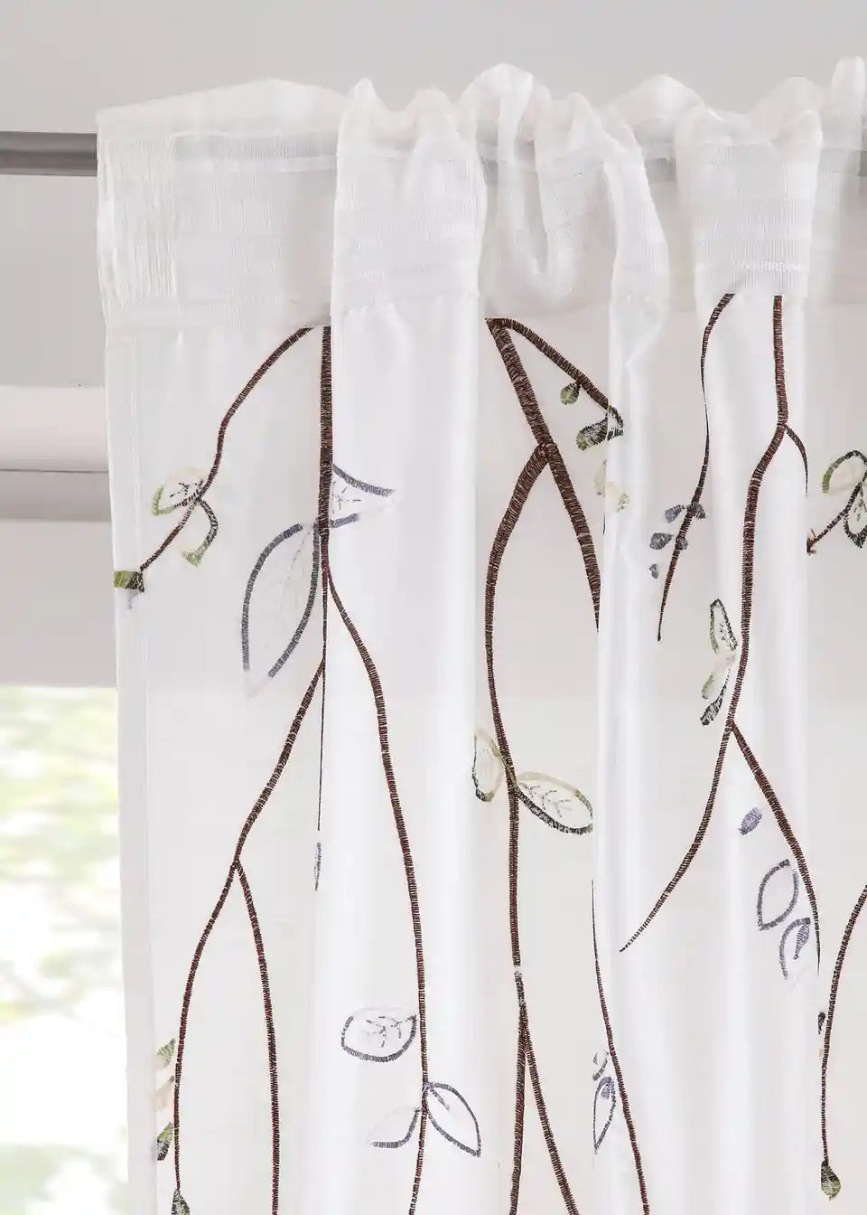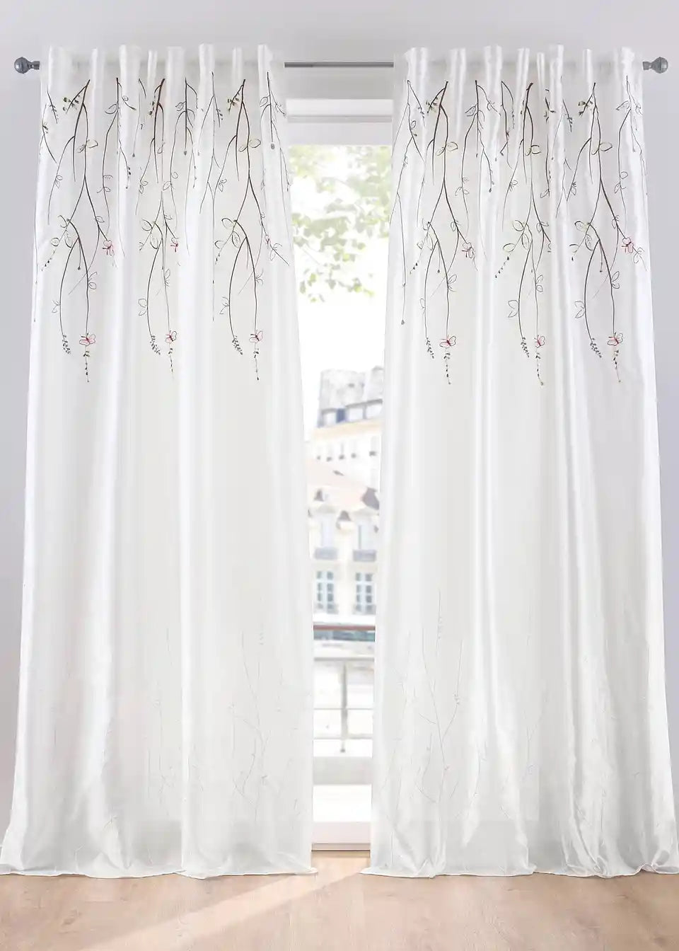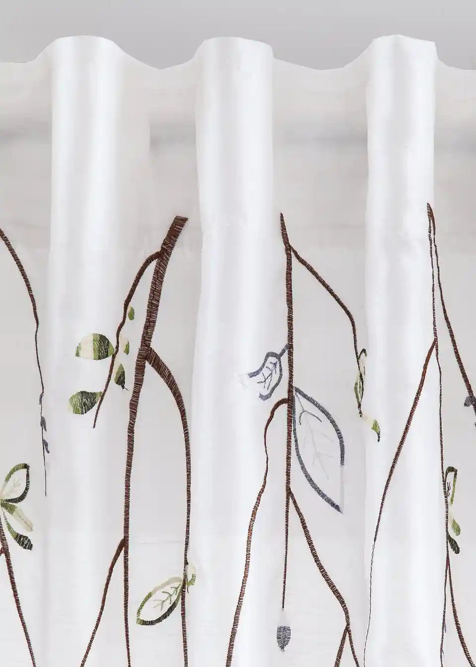Ova zavjesa je nešto sasvim posebno. Izrađena je od fino sjajne tkanine u svilenom izgledu i ima razigrani nježni vez koji je nanesen i odozdo i odozgo. Boje se izvrsno usklađuju, tako da je cjelokupni izgled jednostavno očaravajući.