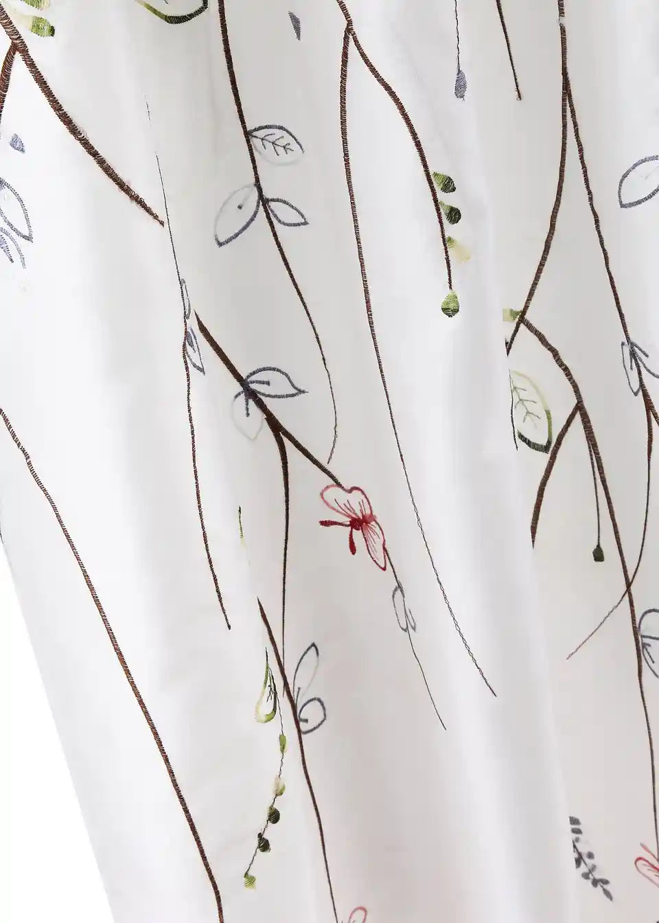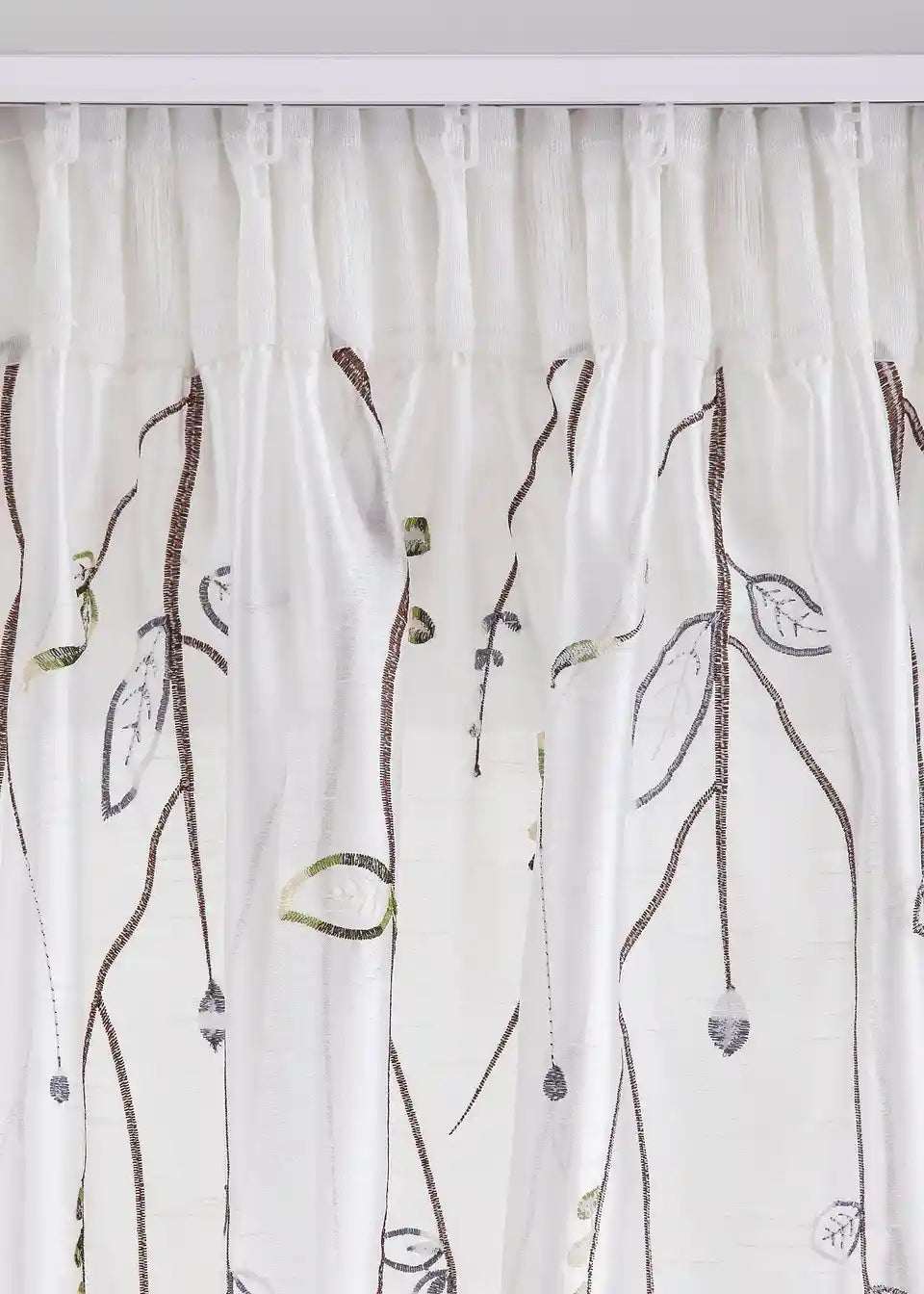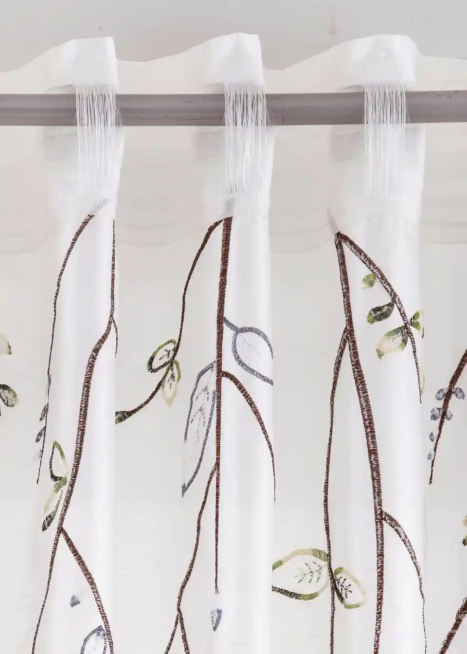 Ova zavjesa je nešto sasvim posebno. Izrađena je od fino sjajne tkanine u svilenom izgledu i ima razigrani nježni vez koji je nanesen i odozdo i odozgo. Boje se izvrsno usklađuju, tako da je cjelokupni izgled jednostavno očaravajući.