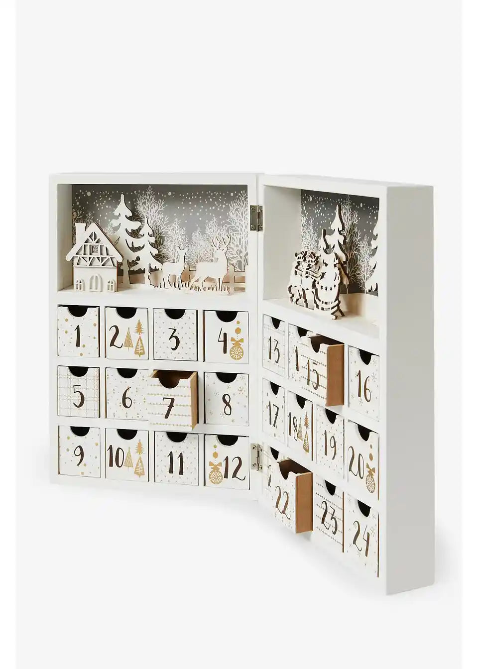 Otkrij naš čarobni adventski kalendar! Sa zimskim motivom jele i srne te ugodnom kućicom poziva na svakodnevno čuđenje. Iza 24 male ladice krije se svakog dana novo, malo iznenađenje koje povećava iščekivanje Božića. Idealan za otvaranje i postavljanje, krasi tvoj dom tijekom adventskog vremena.