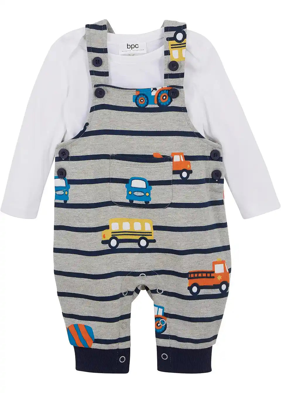 Ovaj prekrasni dvodijelni baby set savršen je za vaše malo zlato u vrtiću i slobodno vrijeme. Kod praktičnih latzhosen naramenice se mogu zakopčati na dvije različite visine, tako da "rastu s djetetom". Slatki detalji su mali otisnuti automobili. Uz to dolazi jednostavni bodij s dugim rukavima koji se može zakopčati u području prepone za lakše mijenjanje pelena.