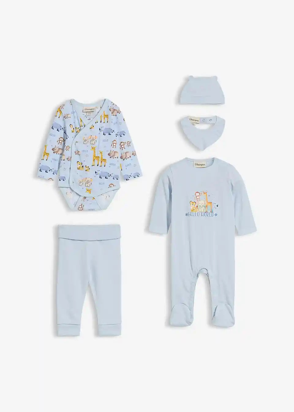 Ovaj 5-dijelni baby starter set u plavim tonovima sadrži body, hlače, kapu, pidžamu i podbradnik, te je savršeno usklađen. Body s preklopnim otvorom olakšava oblačenje i skidanje, dok su hlače udobne i pružaju veliku slobodu kretanja. Pidžama s nogavicama grije Vašu bebu, sprečava hladne noge i ima praktične drukere te simpatičan otisak s motivom životinja po cijeloj površini. Elastična kapa se savršeno prilagođava glavici i s malim ušima pažljivo je dizajnirana. Podbradnik je široko krojen, pouzdano štiti odjeću i idealno upotpunjuje set za svaki dan.