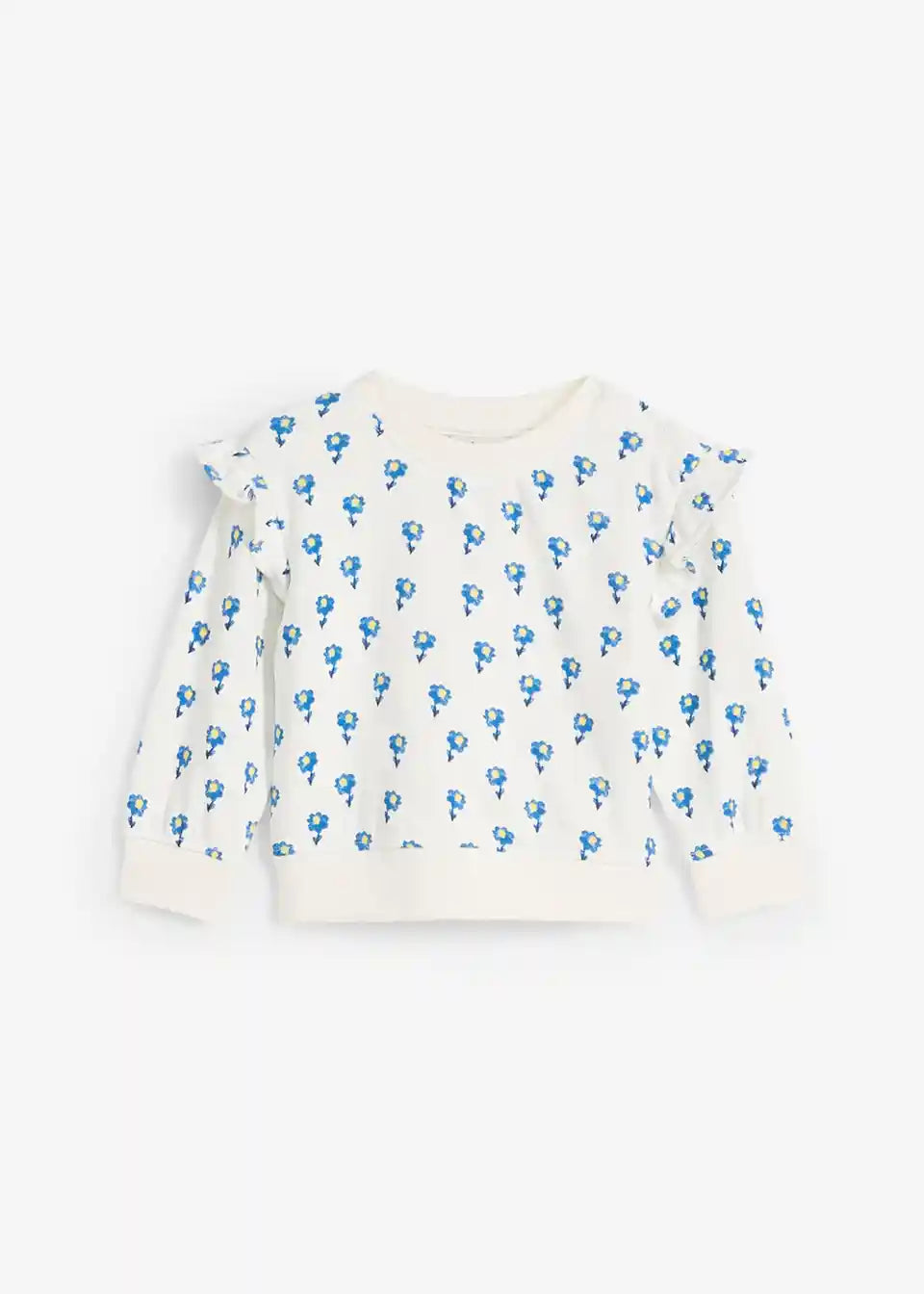 Mekani baby sweatshirt od nježne organske Pamuka s preslatkim cvjetnim motivom. Nježni volani na ramenima daju razigran izgled, dok praktični gumbi olakšavaju oblačenje i svlačenje. Udoban kroj osigurava optimalnu udobnost nošenja – savršen za svaki dan.