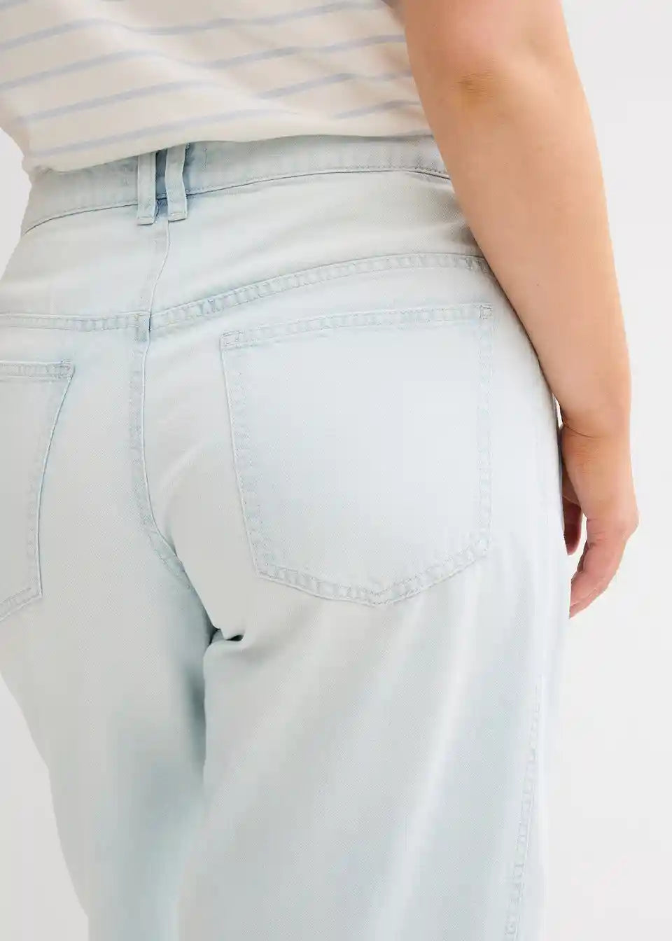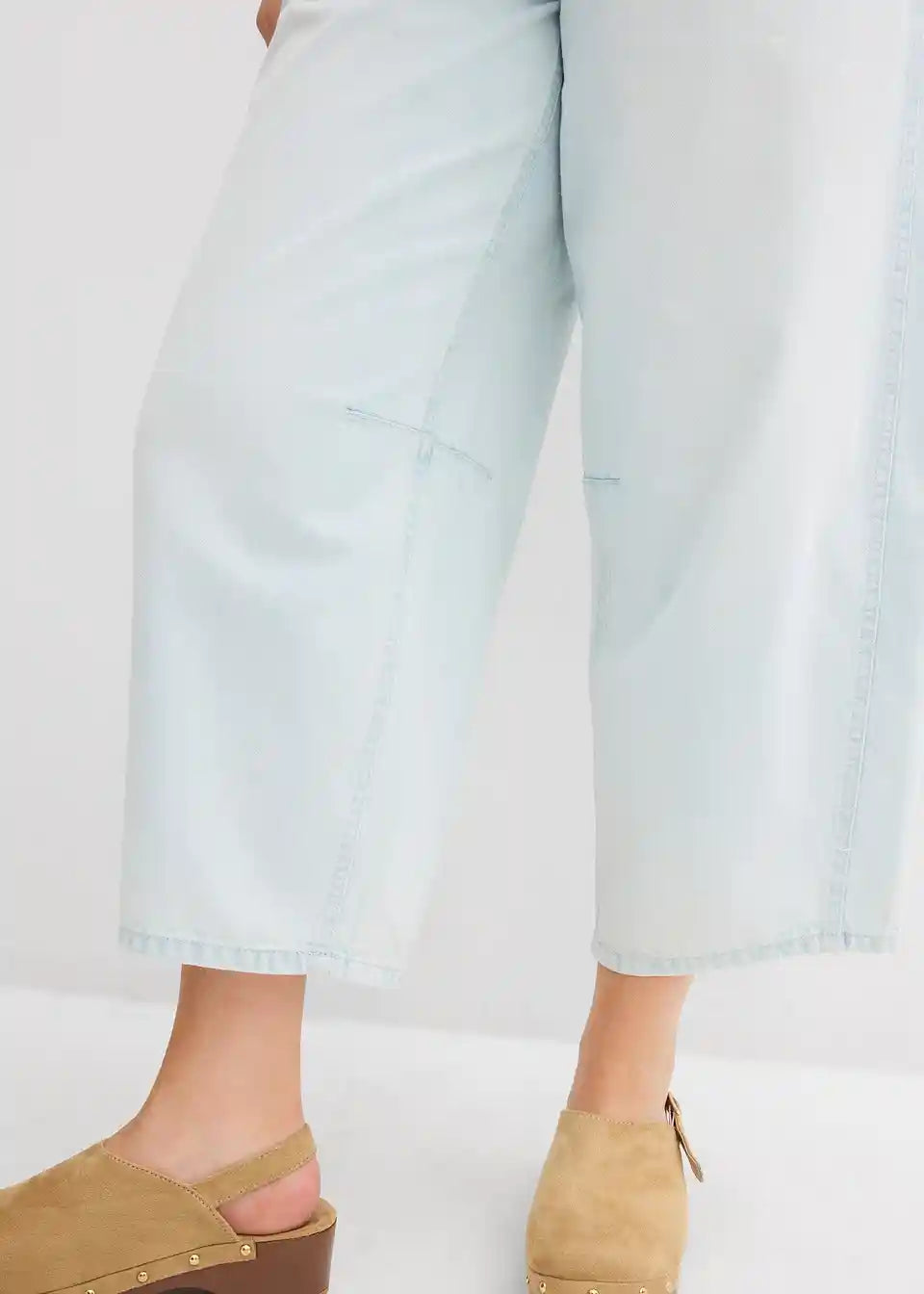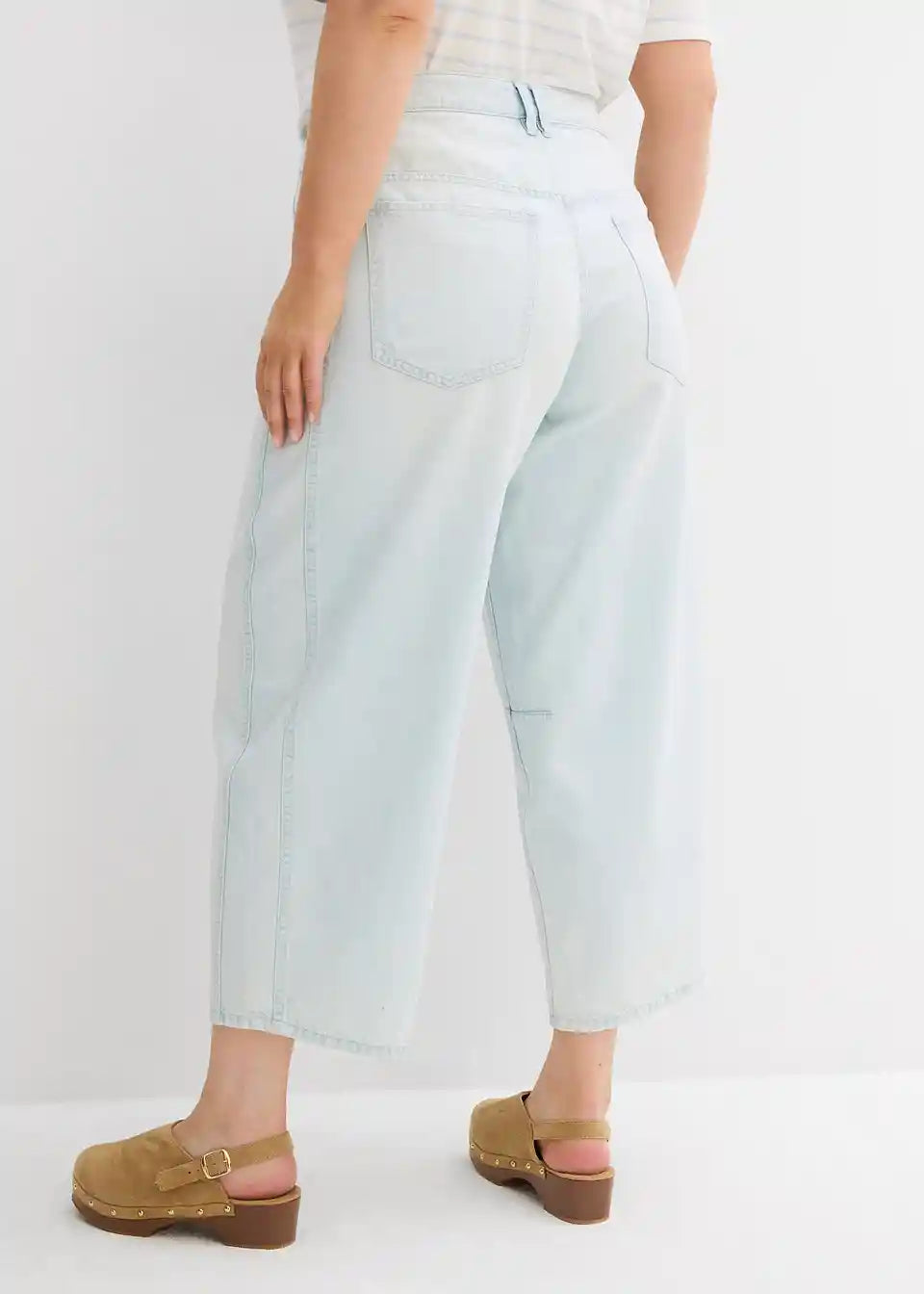 5-džepne traperice od izuzetno laganog low Stretch denima. Ležeran kroj s voluminoznom, zaobljenom nogavicom od bokova do bedara i suženjem prema dolje. Srednje visok struk i skraćene nogavice. Unutarnja duljina nogavice u vel. 42 cca 70,5 cm, perivo u perilici rublja.