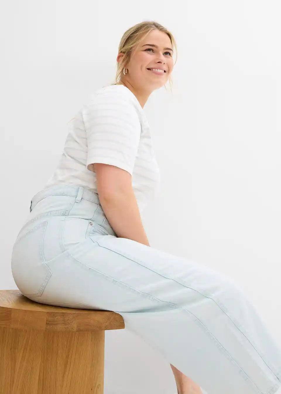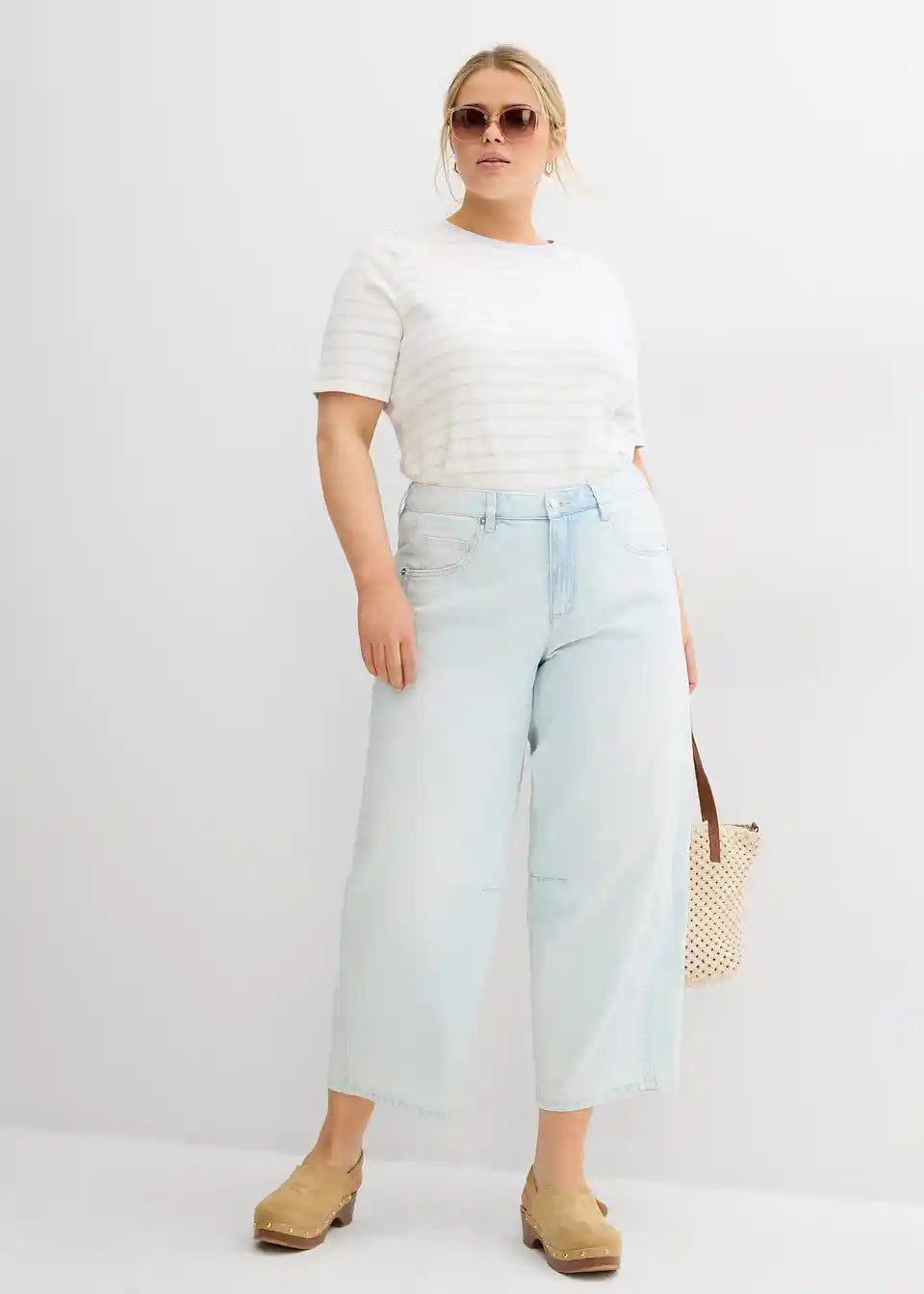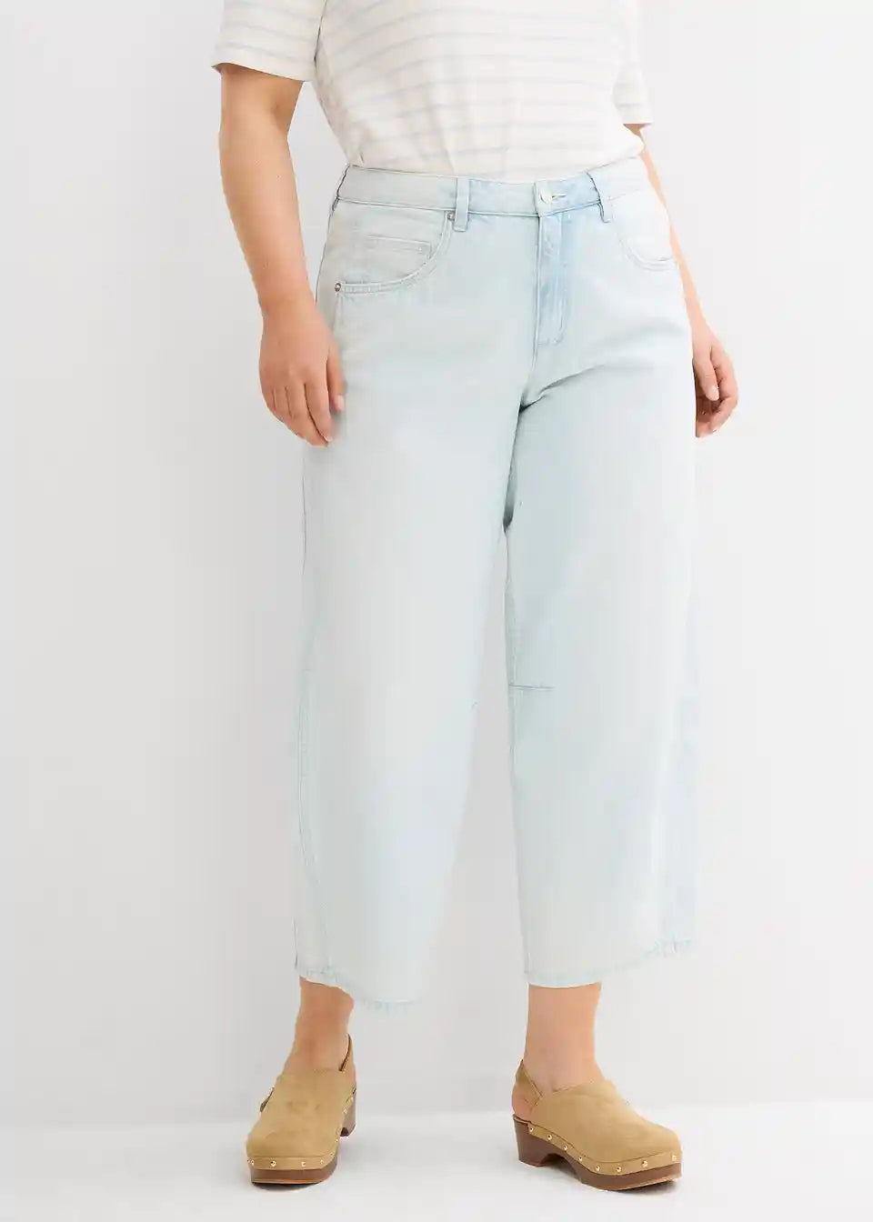 5-džepne traperice od izuzetno laganog low Stretch denima. Ležeran kroj s voluminoznom, zaobljenom nogavicom od bokova do bedara i suženjem prema dolje. Srednje visok struk i skraćene nogavice. Unutarnja duljina nogavice u vel. 42 cca 70,5 cm, perivo u perilici rublja.