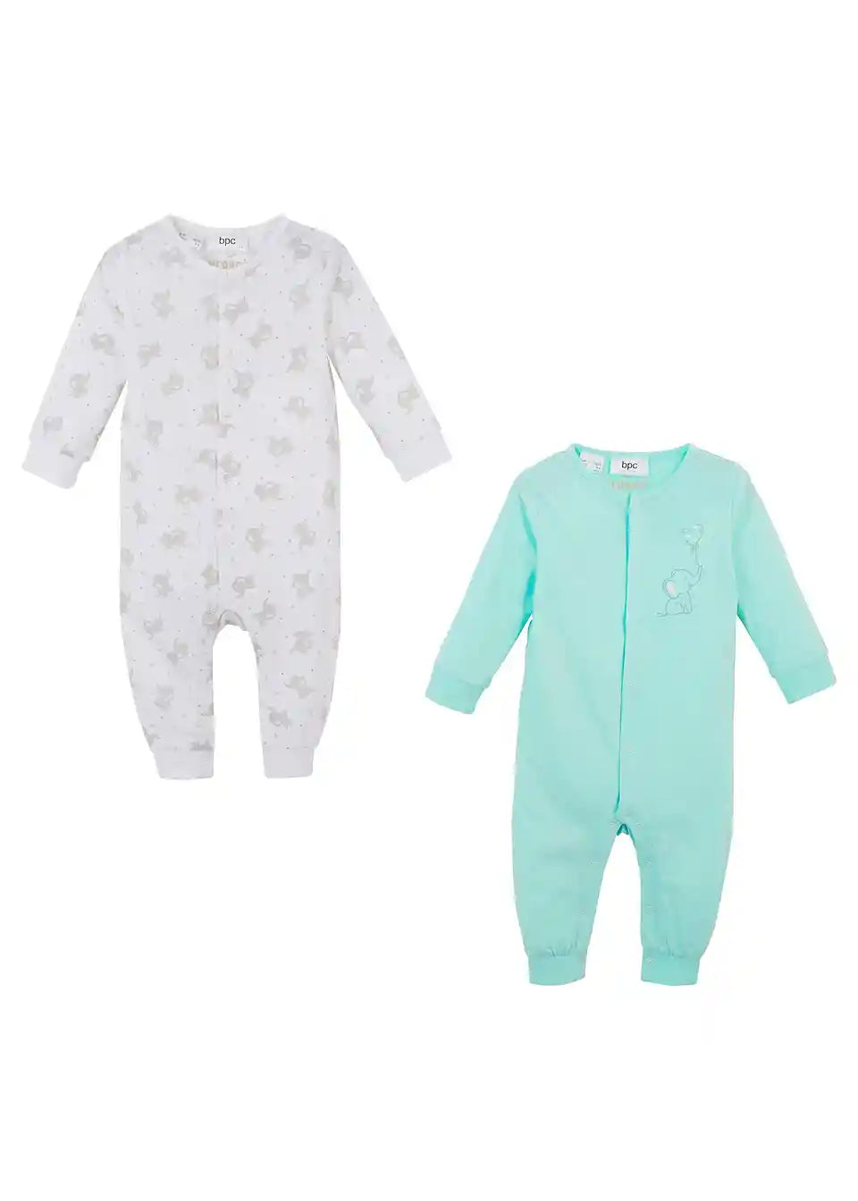 Slatki paket od 2 kombinezona. Sprijeda i na međunožju zatvaraju se drukerima. Jedan s allover printom slonova, a drugi s printom na prednjem dijelu. Na završecima rukava i nogavica s elastičnim manžetama.