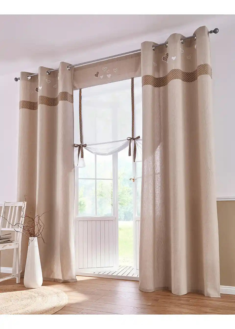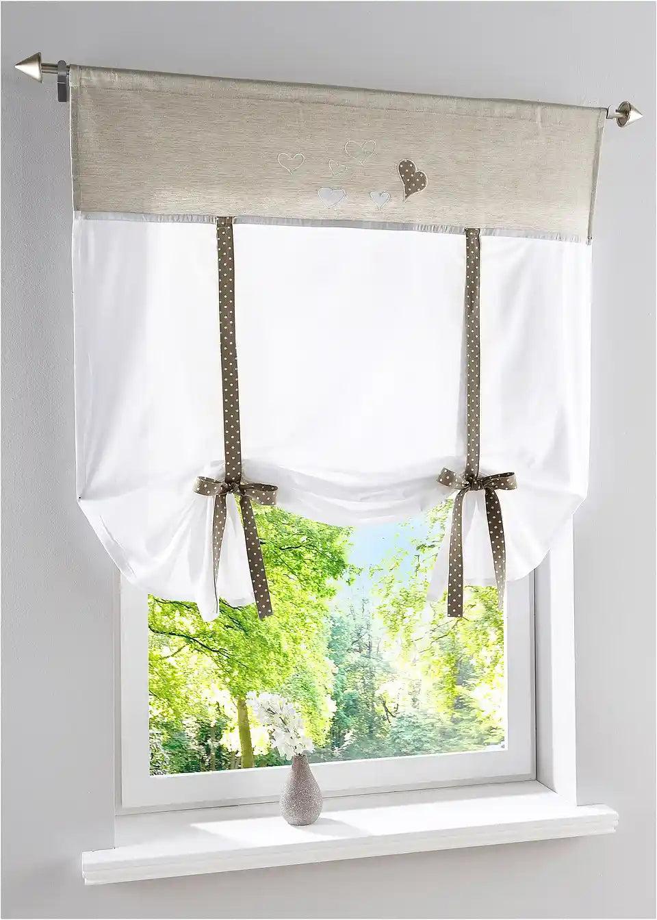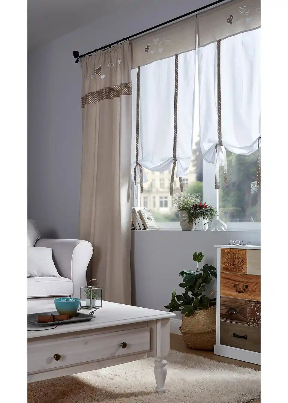 Zavesa na vezivanje unosi u trenu ugodnu atmosferu u tvoje prostorije. Savršeno se uklapa u rustikalni stil i sastoji se od čiste pamuka. Gornji rub je ukrašen malim srcima. Prikladno uz to, trakice za vezivanje su točkaste. Jednostavno dekoriraj na željenu visinu, zaveži mašne i tako fiksiraj. Zahvaljujući prirodnoj tonskoj kombinaciji boja, zavesa na vezivanje je lako kombinirati.