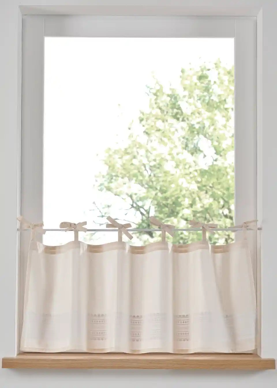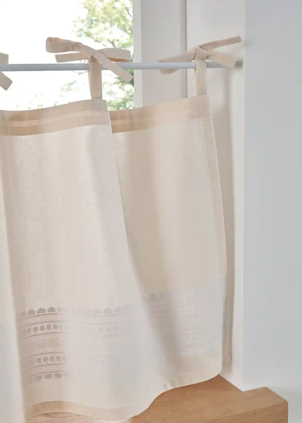 Suzdržana kuhinjska zavjesa u krem boji od visokokvalitetnog bio pamuka s otisnutim dizajnom. Vješanje se vrši pomoću vezica koje su ušivene nakon 10 cm i tako služe kao petlja.