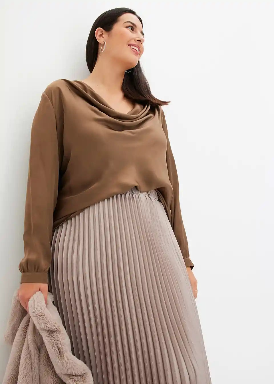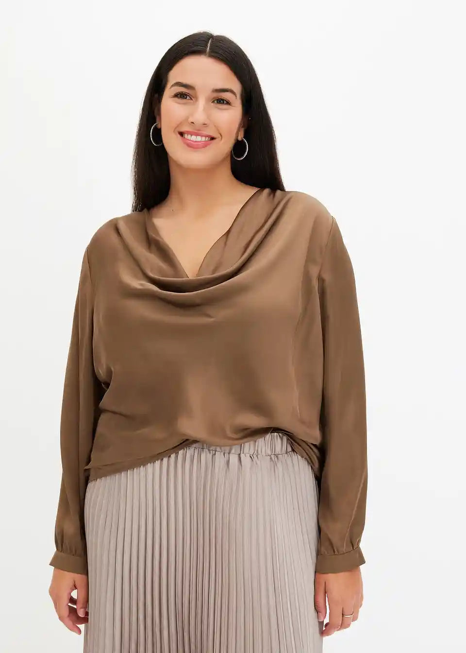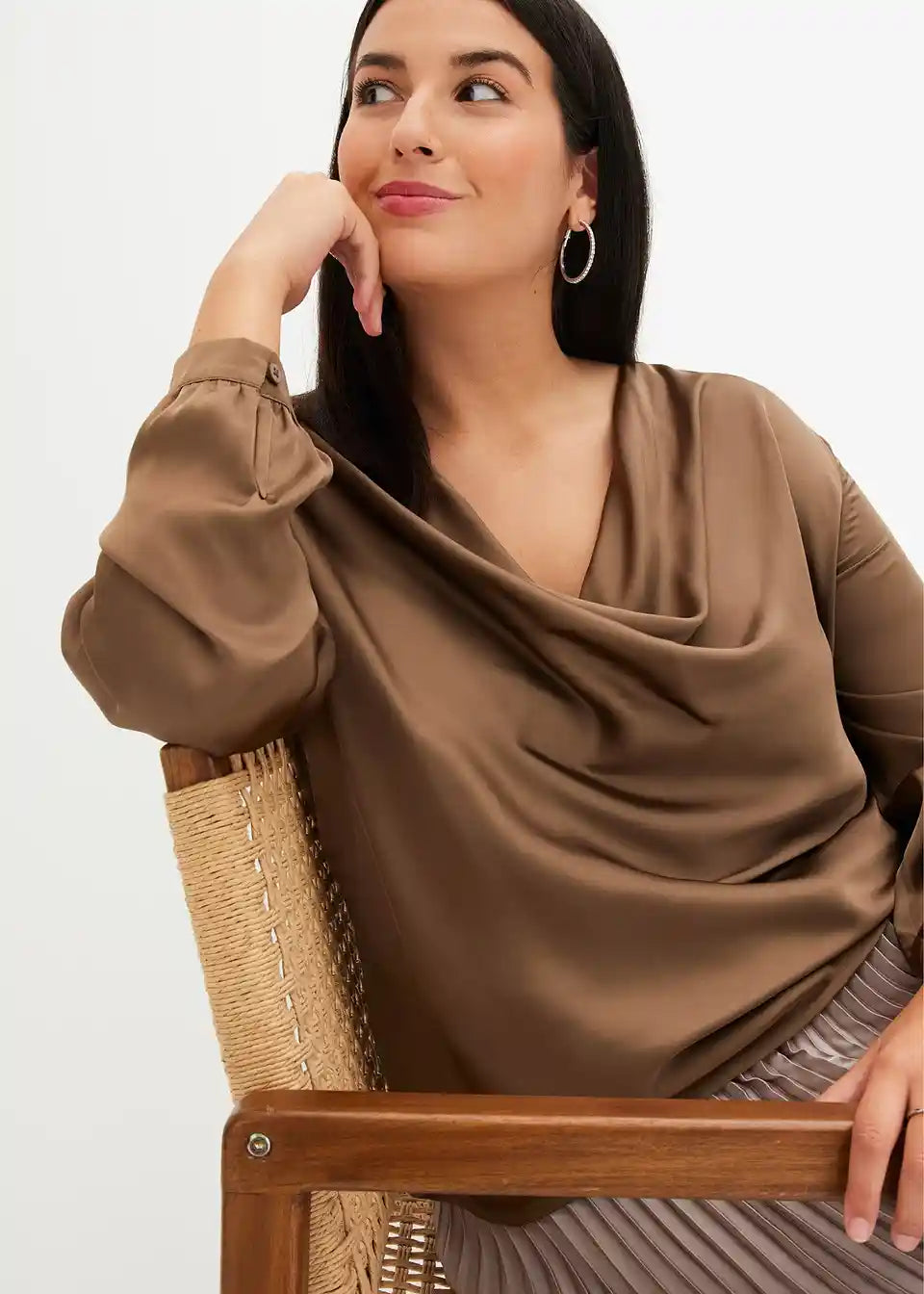 moderna bluza od satena s kaskadnim izrezom sprijeda