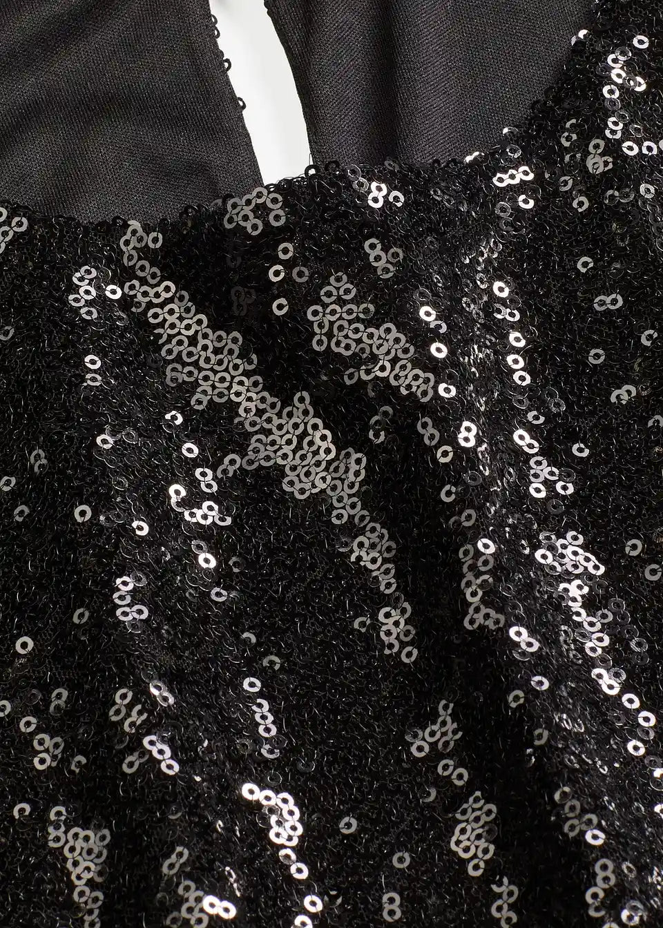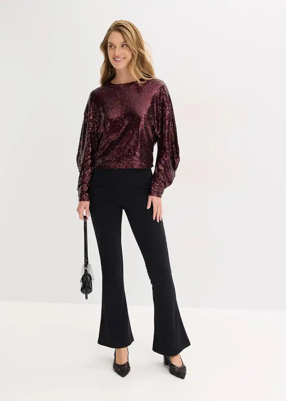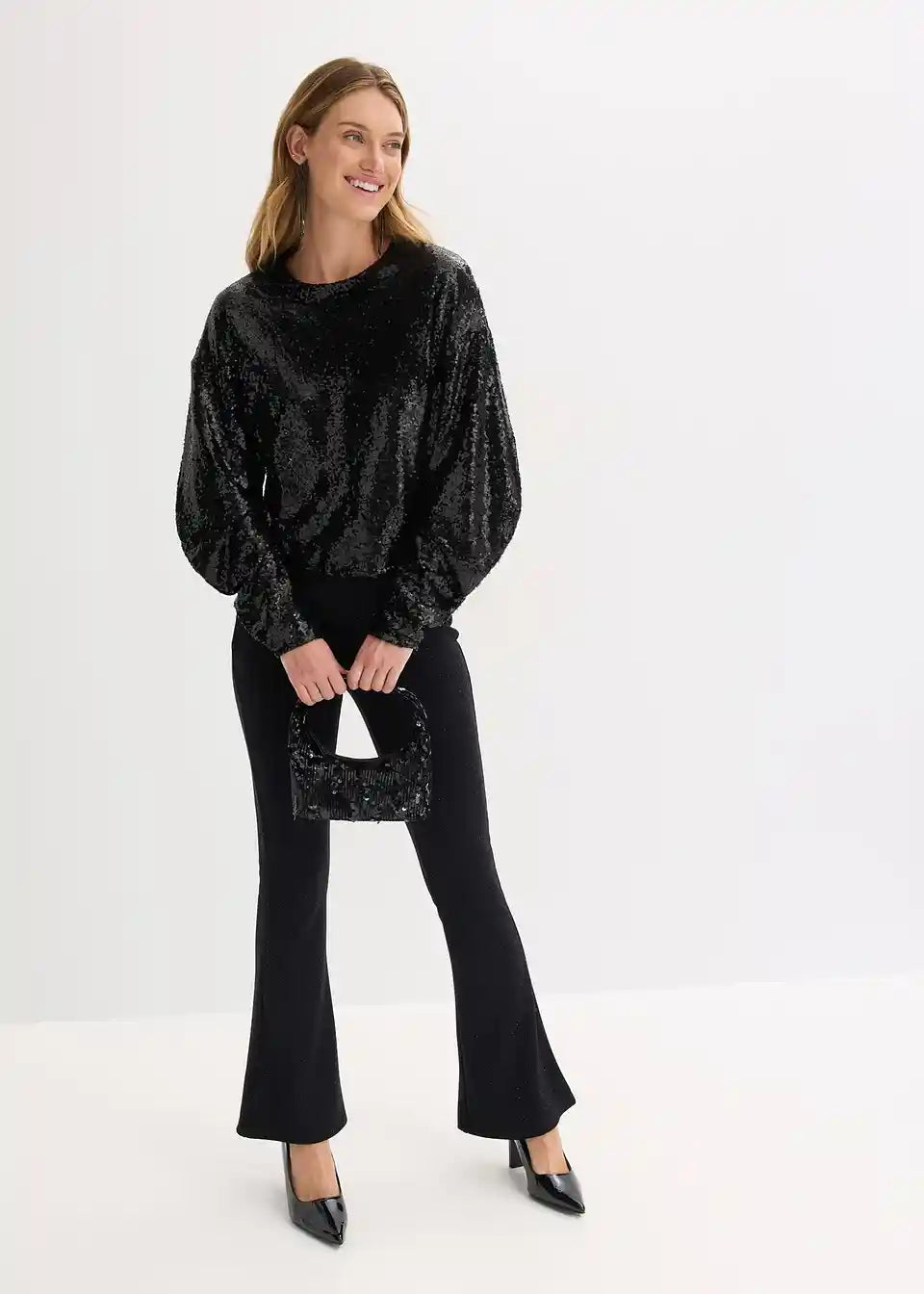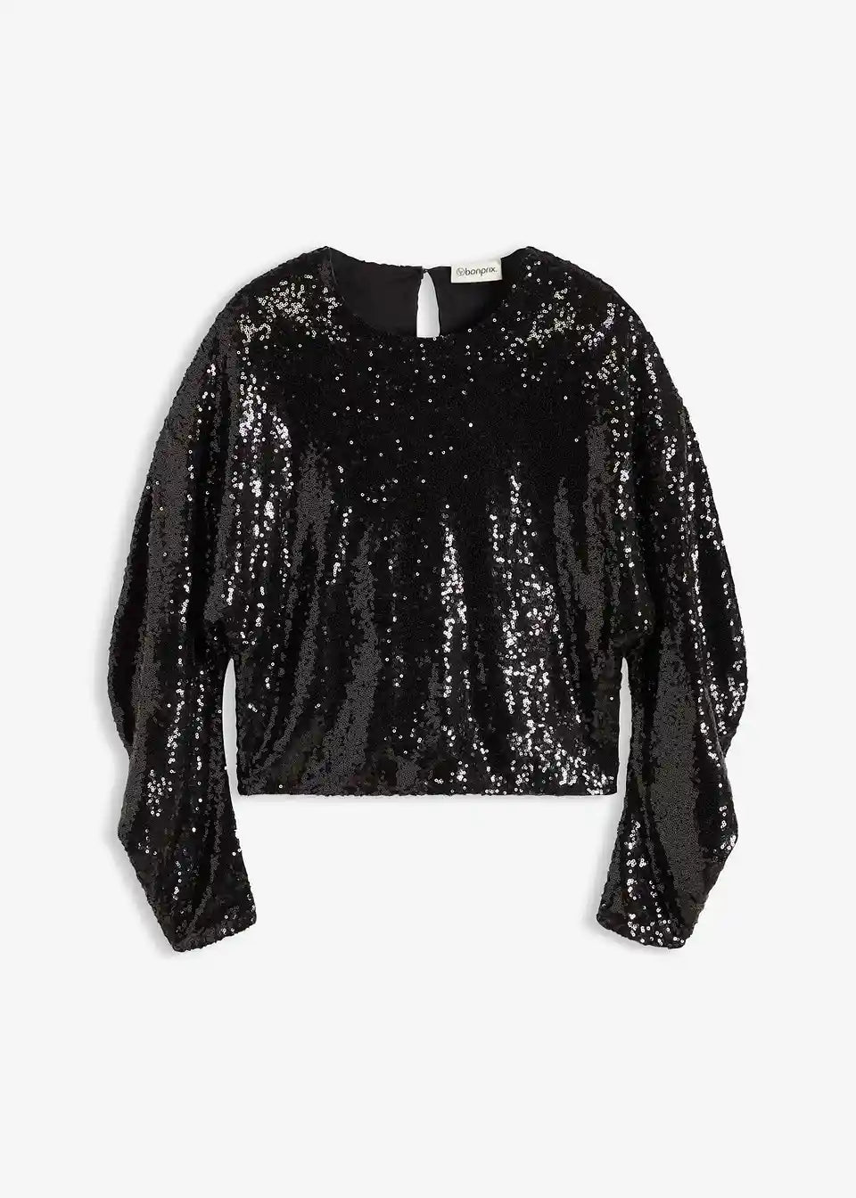 moderna bluza s dugim rukavima s paillettama s voluminoznim rukavima u O-kroju i kopčanjem na gumb straga na izrezu