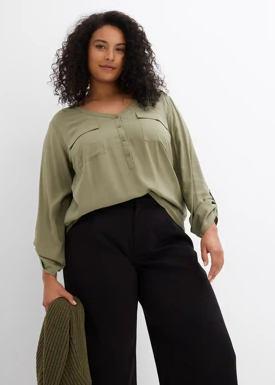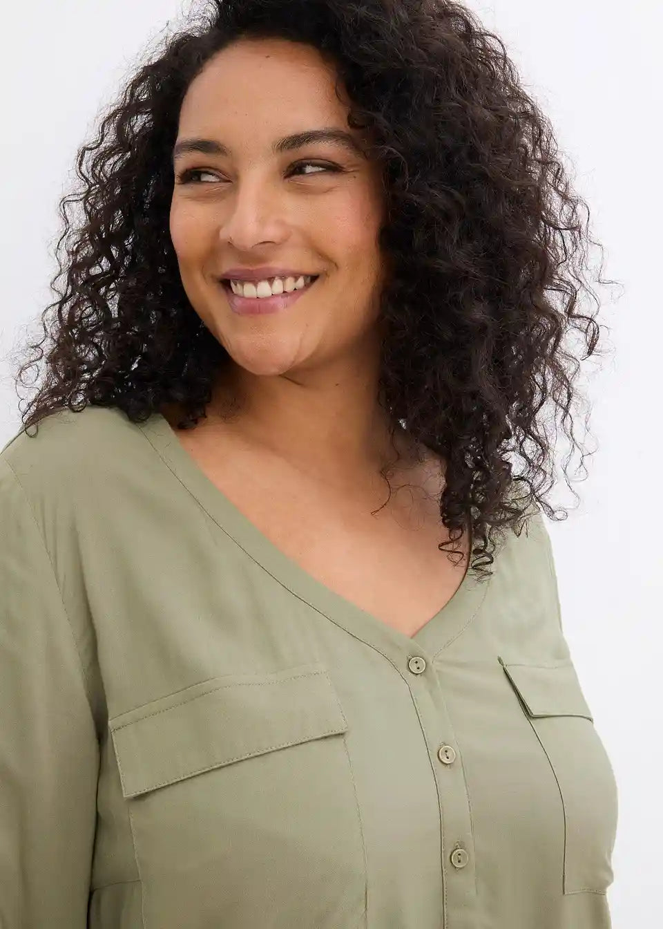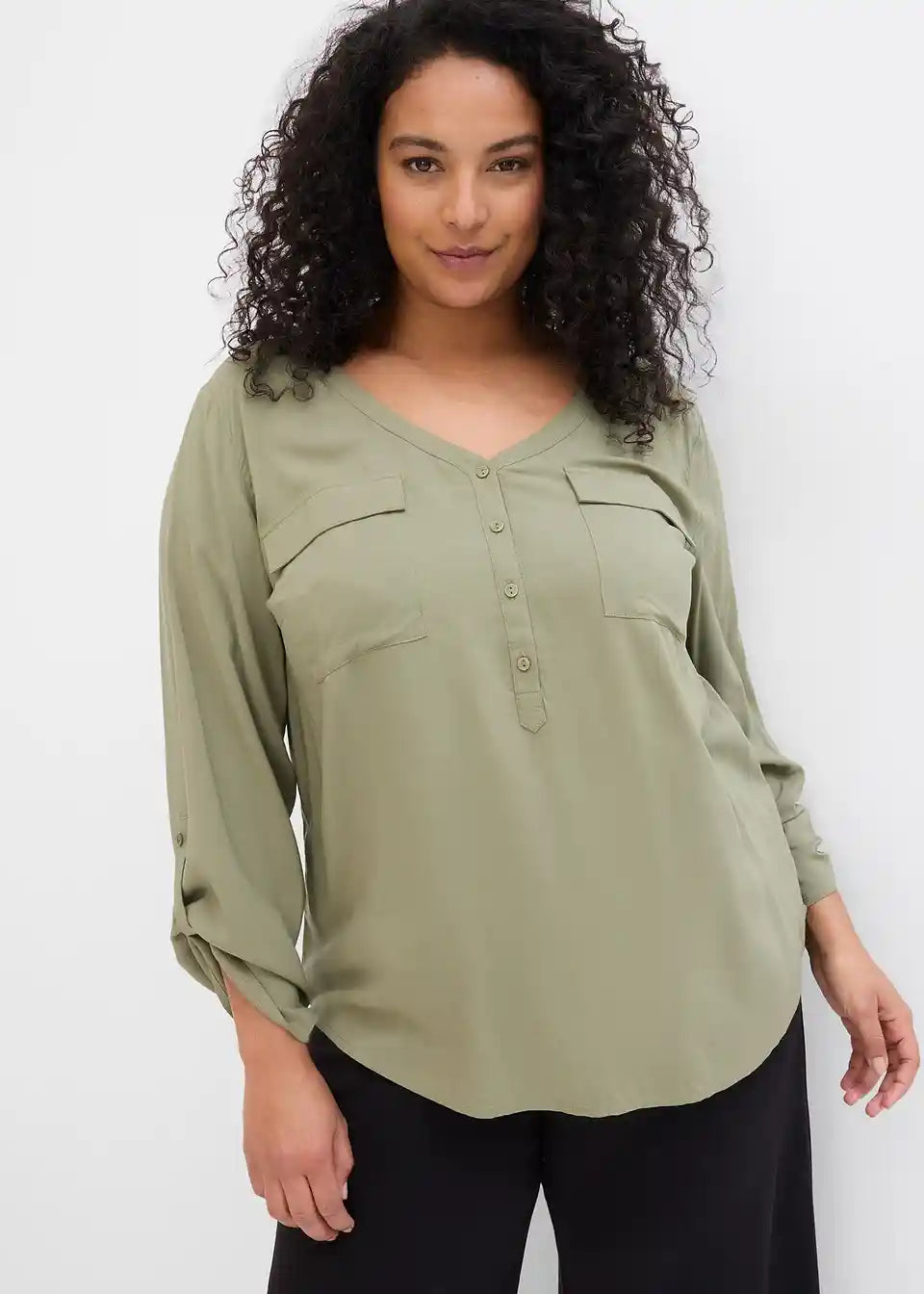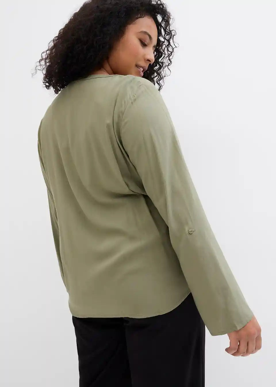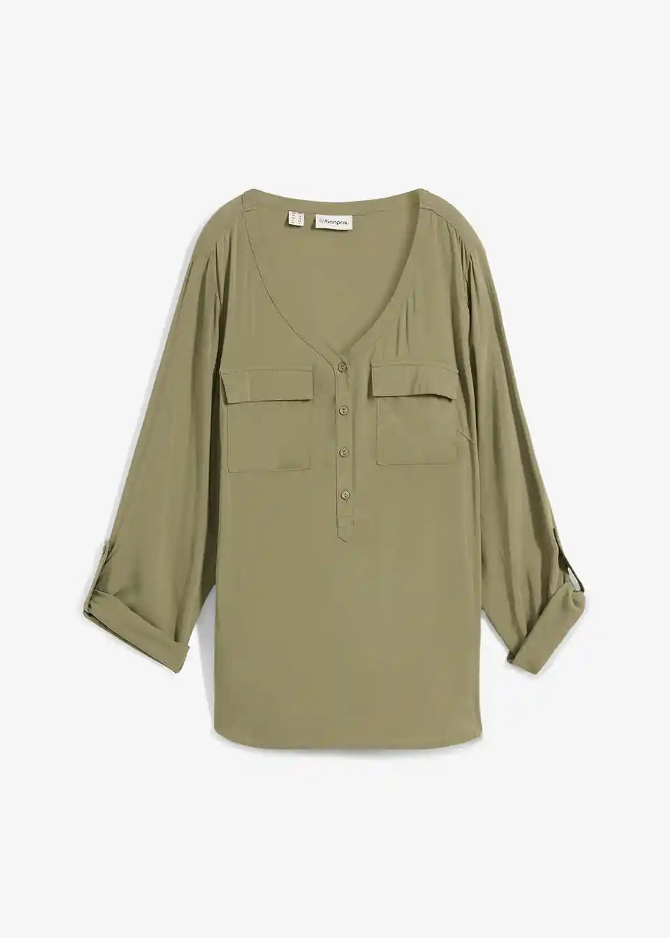 Maskirna bluza s dugim rukavima od viskoze. Rukavi se mogu zavrnuti i pričvrstiti trakom s gumbom.
