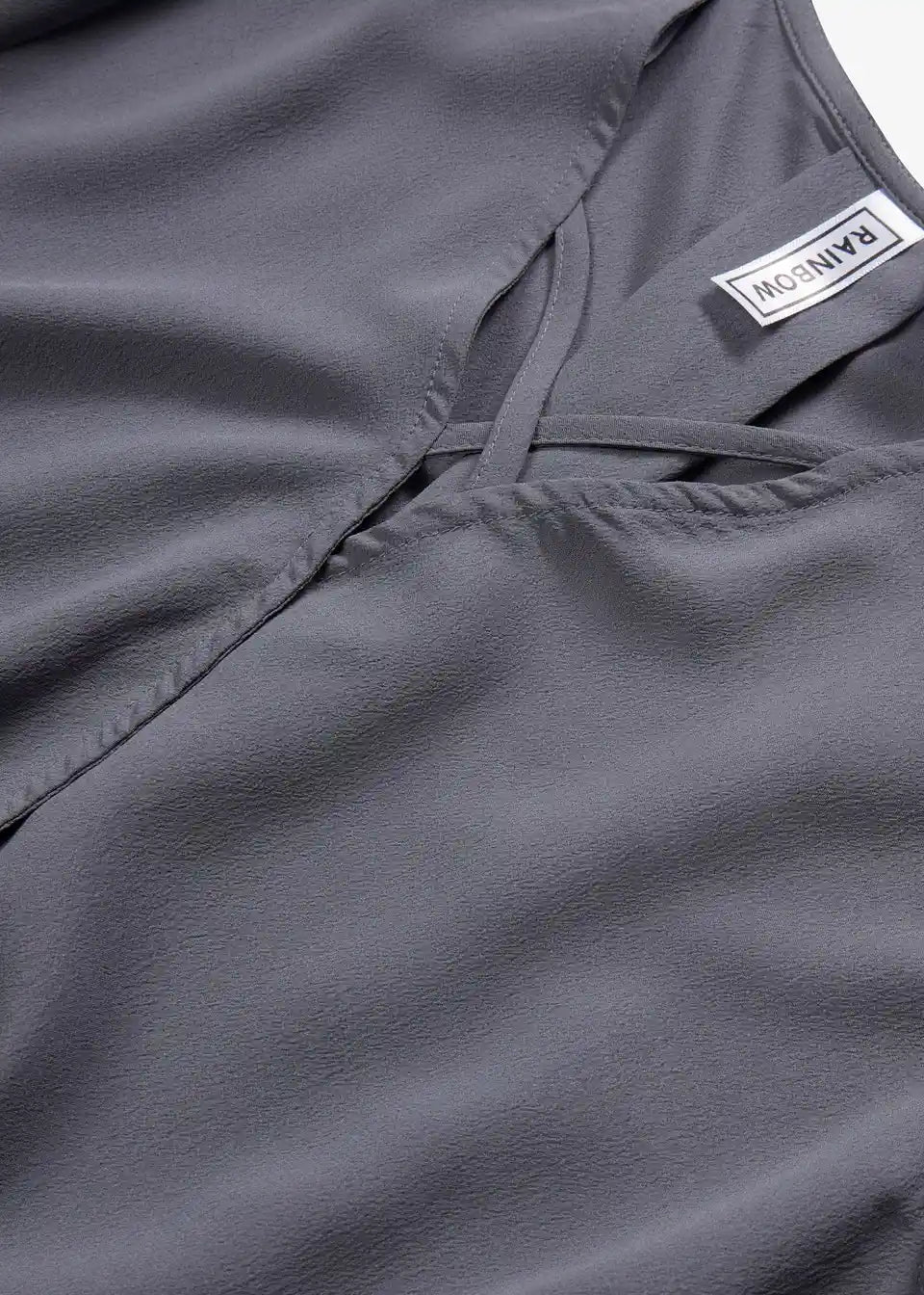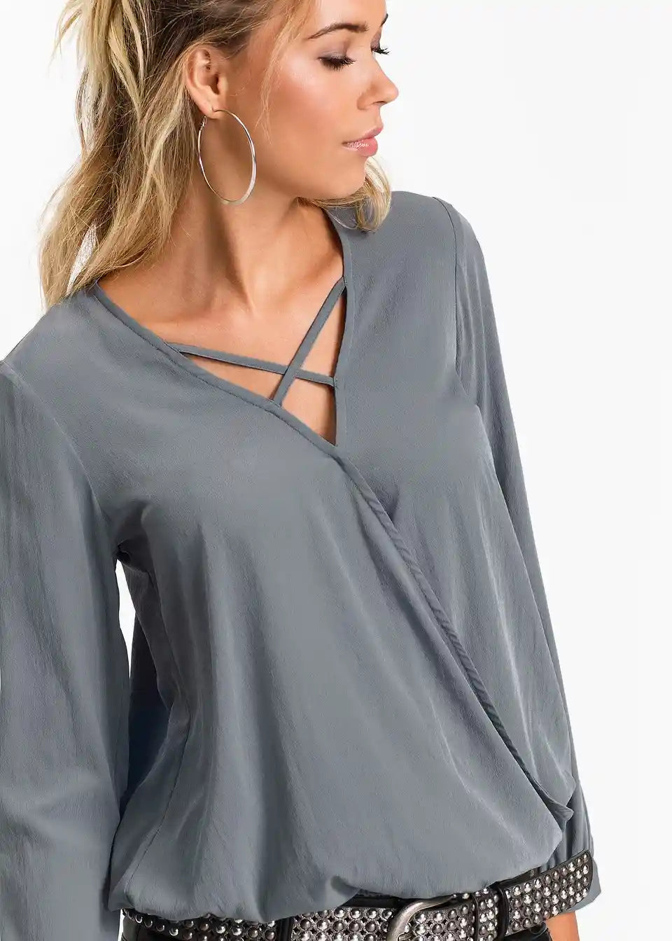 Lagani, meko padajući materijal i opušteni kroj čine ovu bluzu s omotanim izgledom modernim laskavcem za figuru. Duboki V-izrez s profinjenim ukrasnim trakama osigurava poseban izgled. Mali nabori na manšetama rukava naglašavaju moderan dizajn dugih rukava. Idealna je za trendovske casual outfite ili stajlinge za zabave.