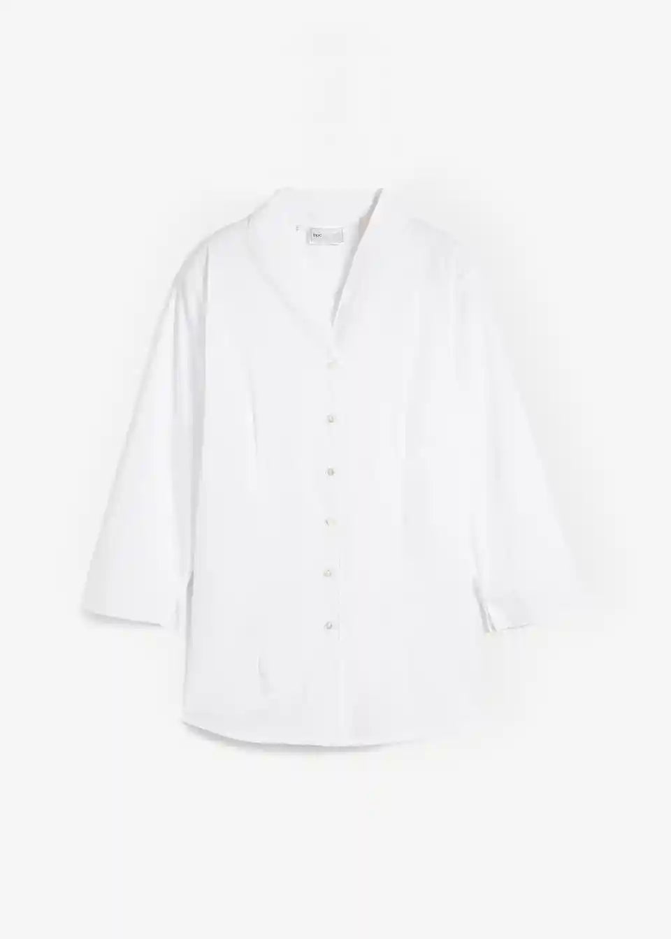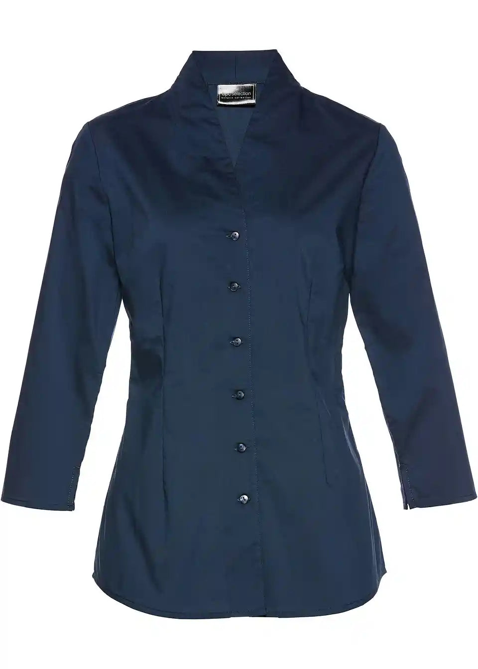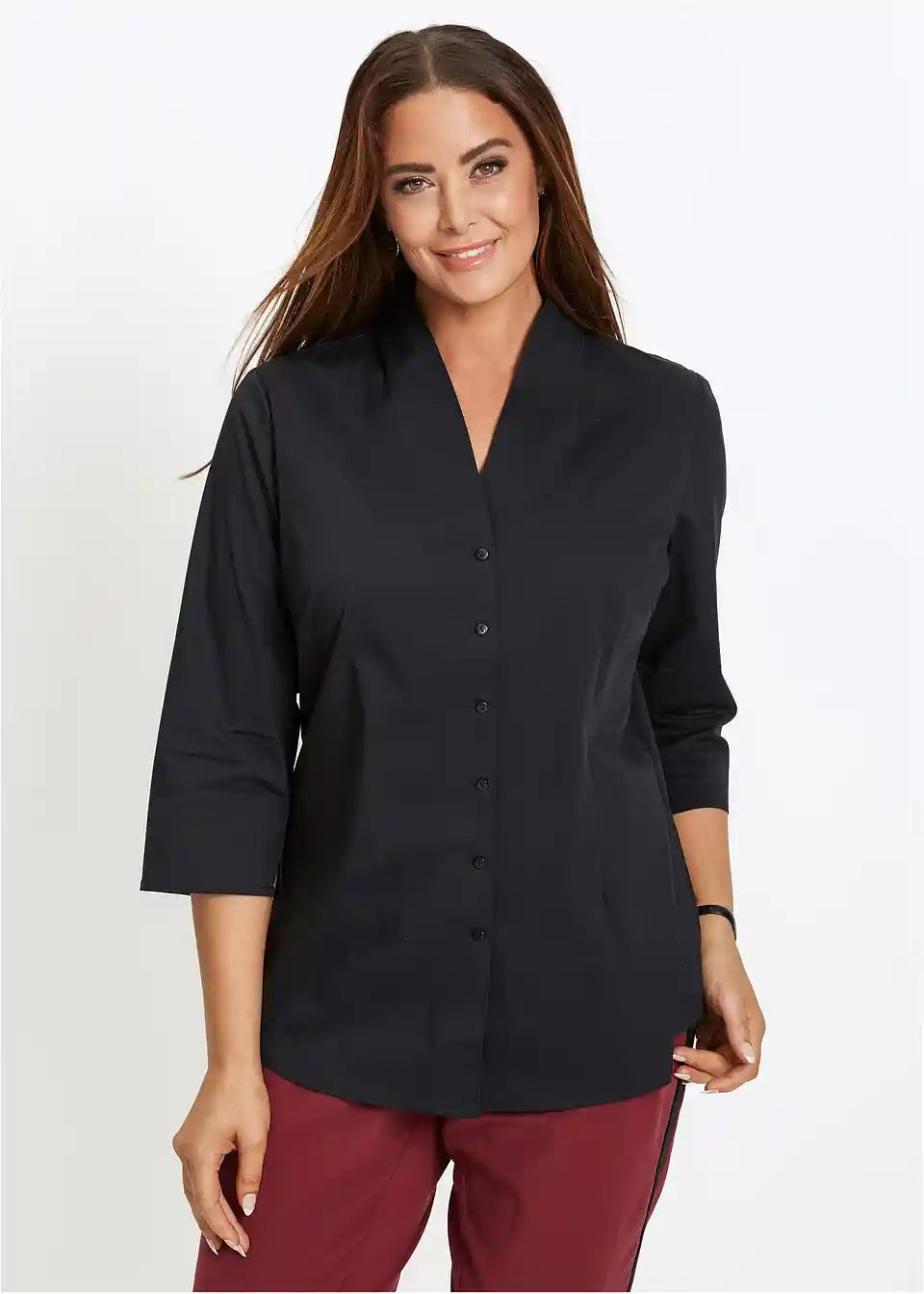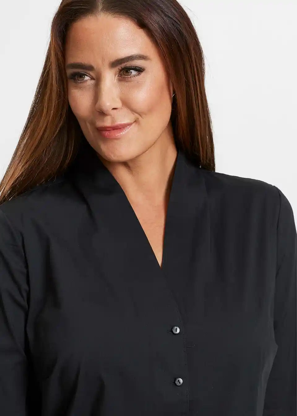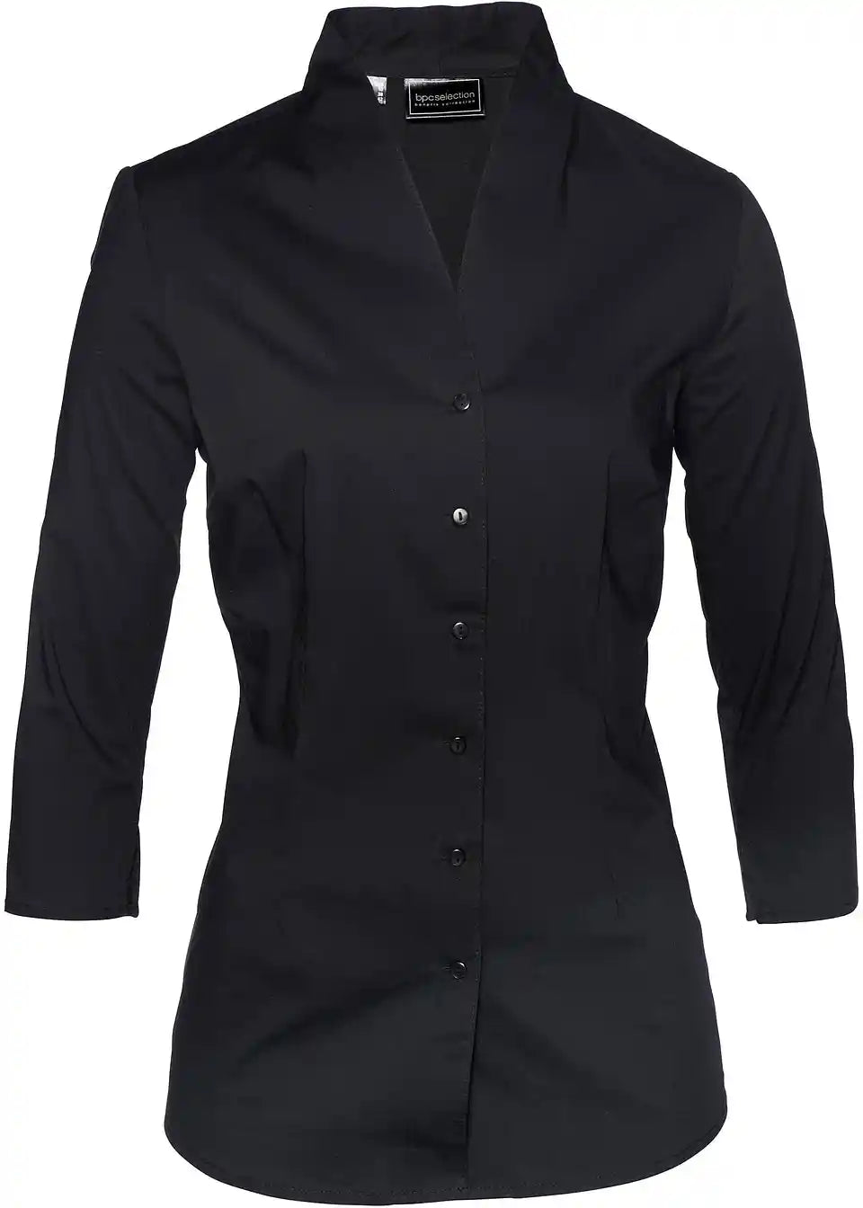Ova bluza s ovratnikom u stilu šal-ovratnika izgleda elegantno i ženstveno zahvaljujući lagano strukiranom kroju i mekanom, tekućem materijalu. Diskretni V-izrez s postavljenim ovratnikom naglašava ekskluzivan izgled modela sa zaobljenim bočnim rubom. Zanimljivi detalji su mali bočni prorezi na rubu 3/4 rukava. Bluza brenda bpc selection zatvara se sprijeda ukrasnom kopčom s dugmićima.
