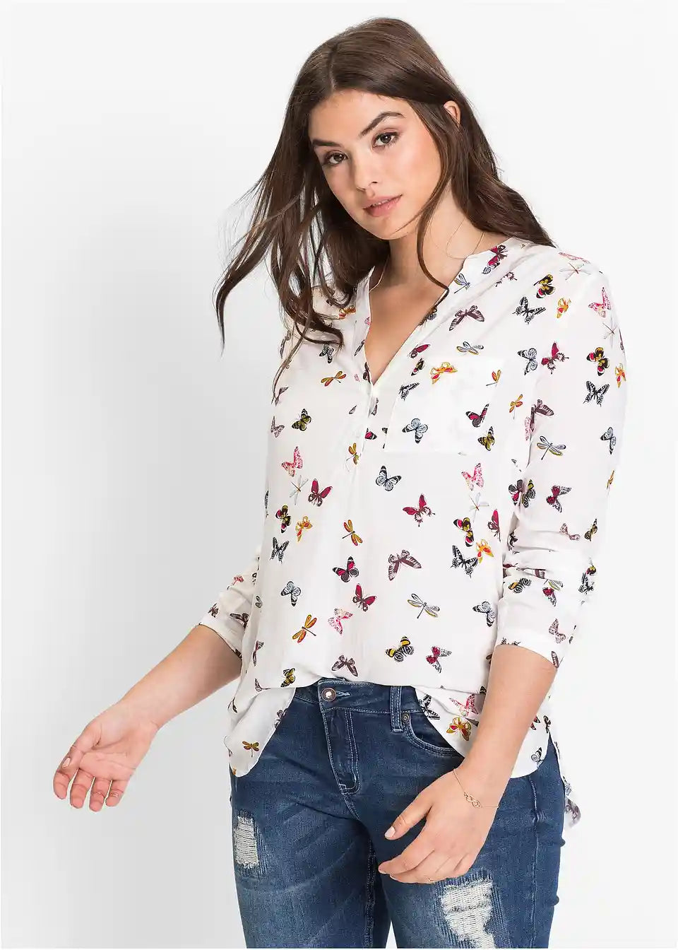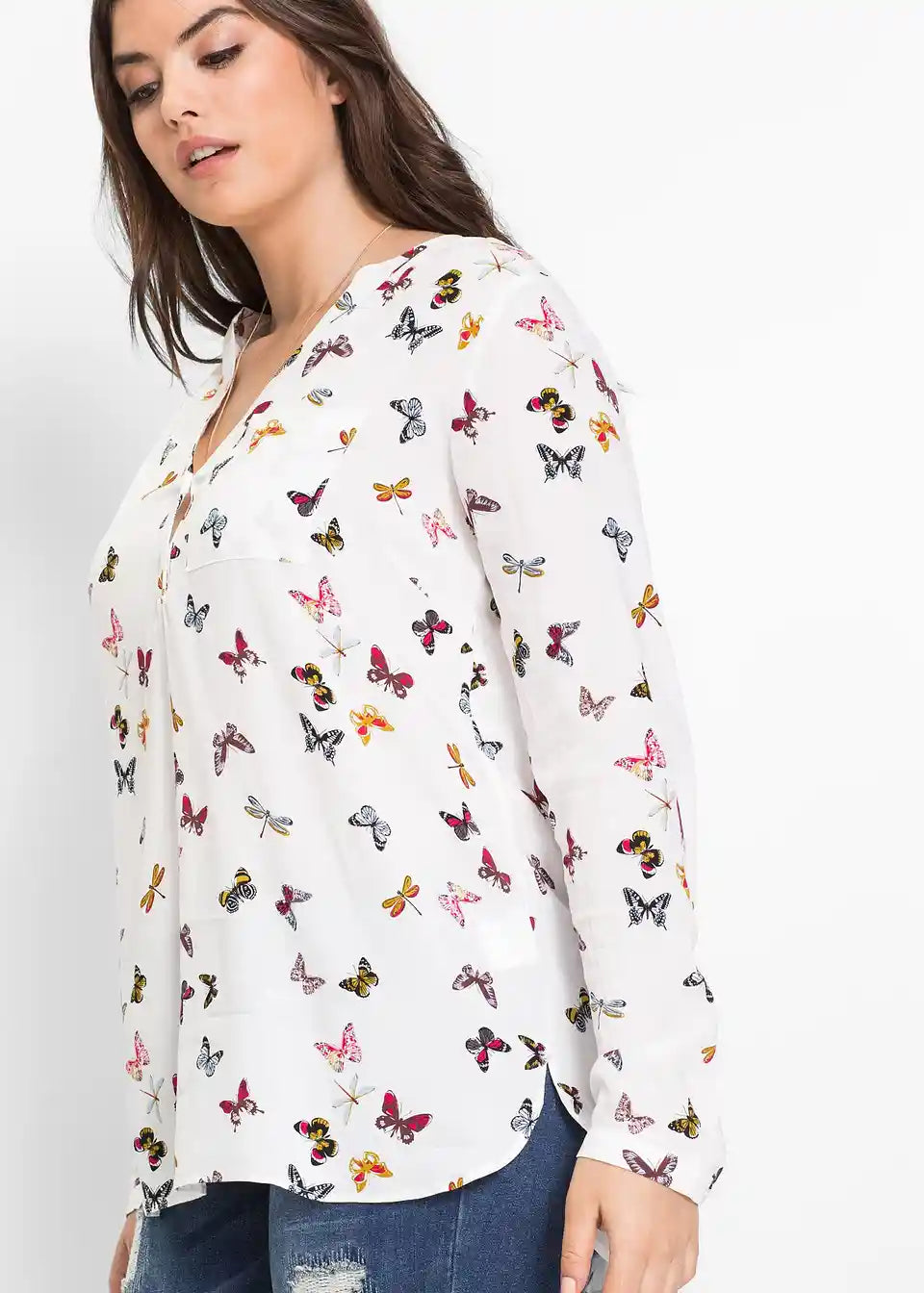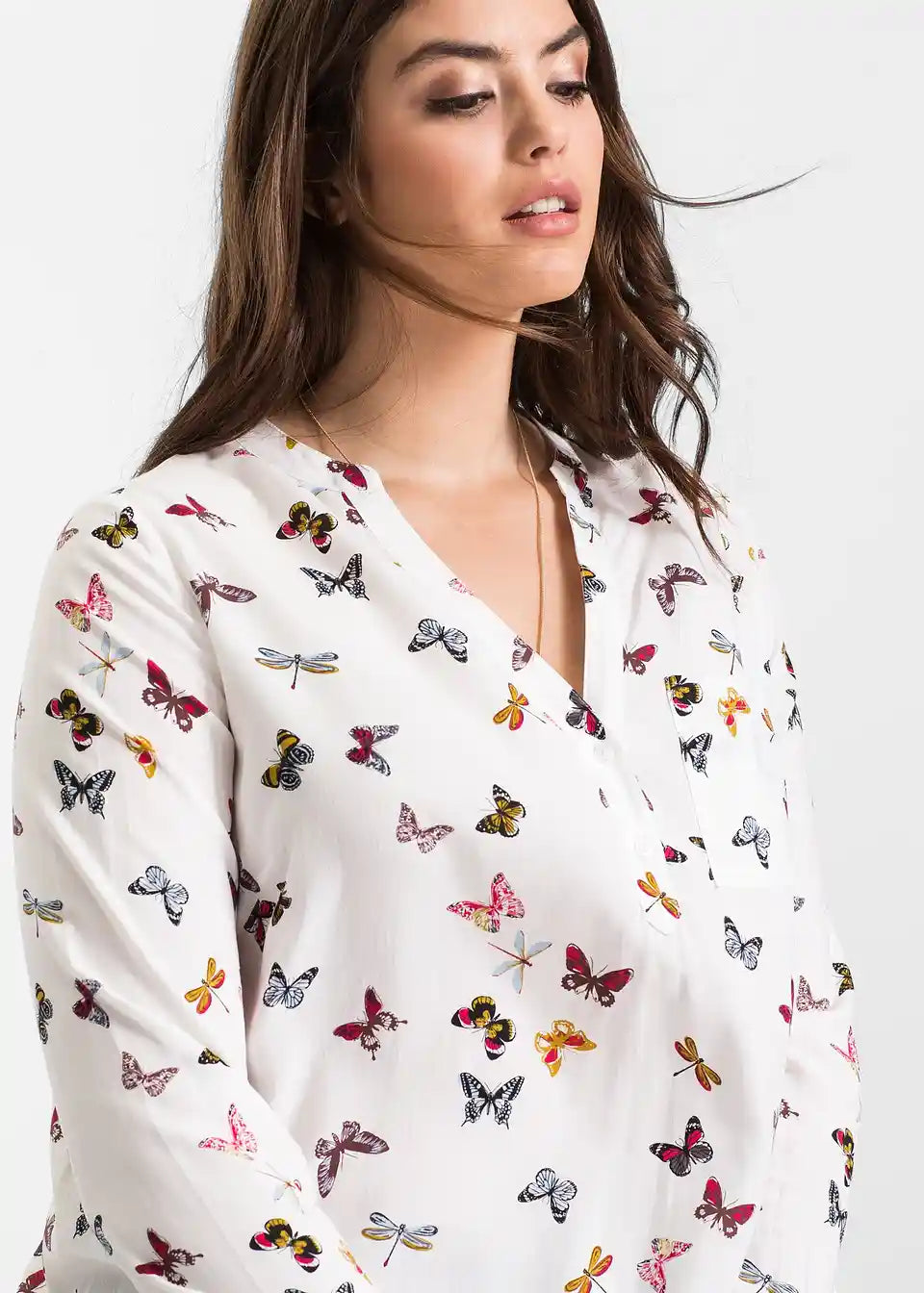 S mnogo ženstvenog šarma ističe se ova bluza s allover uzorkom od BODYFLIRT-a. Romantičan uzorak leptira u privlačnim bojama daje modelu očaravajuću eleganciju. Posebno profinjen dojam ostavlja V-izrez s kratkom nizom gumba. Stražnja strana šarmantne bluze od laganog materijala dulja je od prednje strane. Lagano zaobljeni rub, mali bočni prorezi i našiveni džep na prsima dodatni su lijepi detalji.