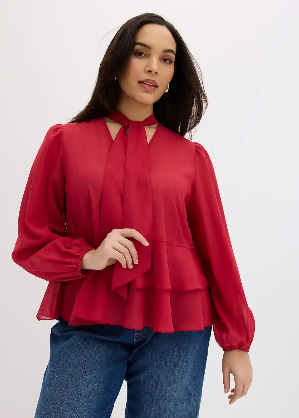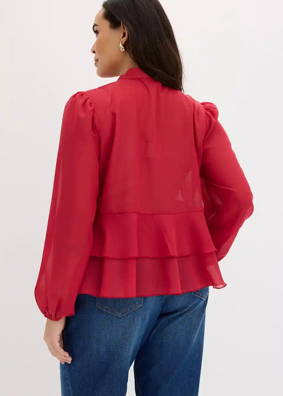moderna šifonska bluza s vezanjem s volanima na rubu