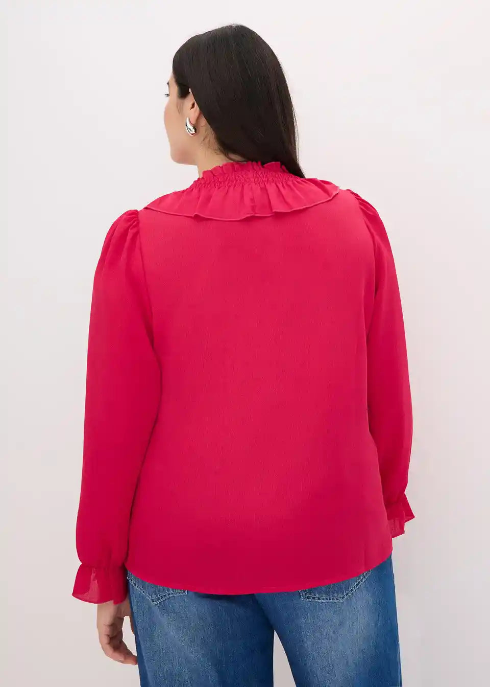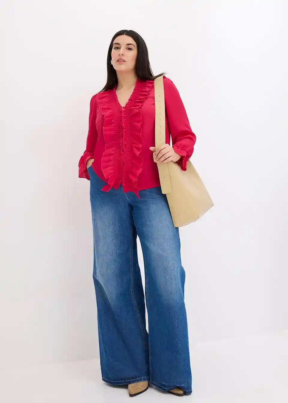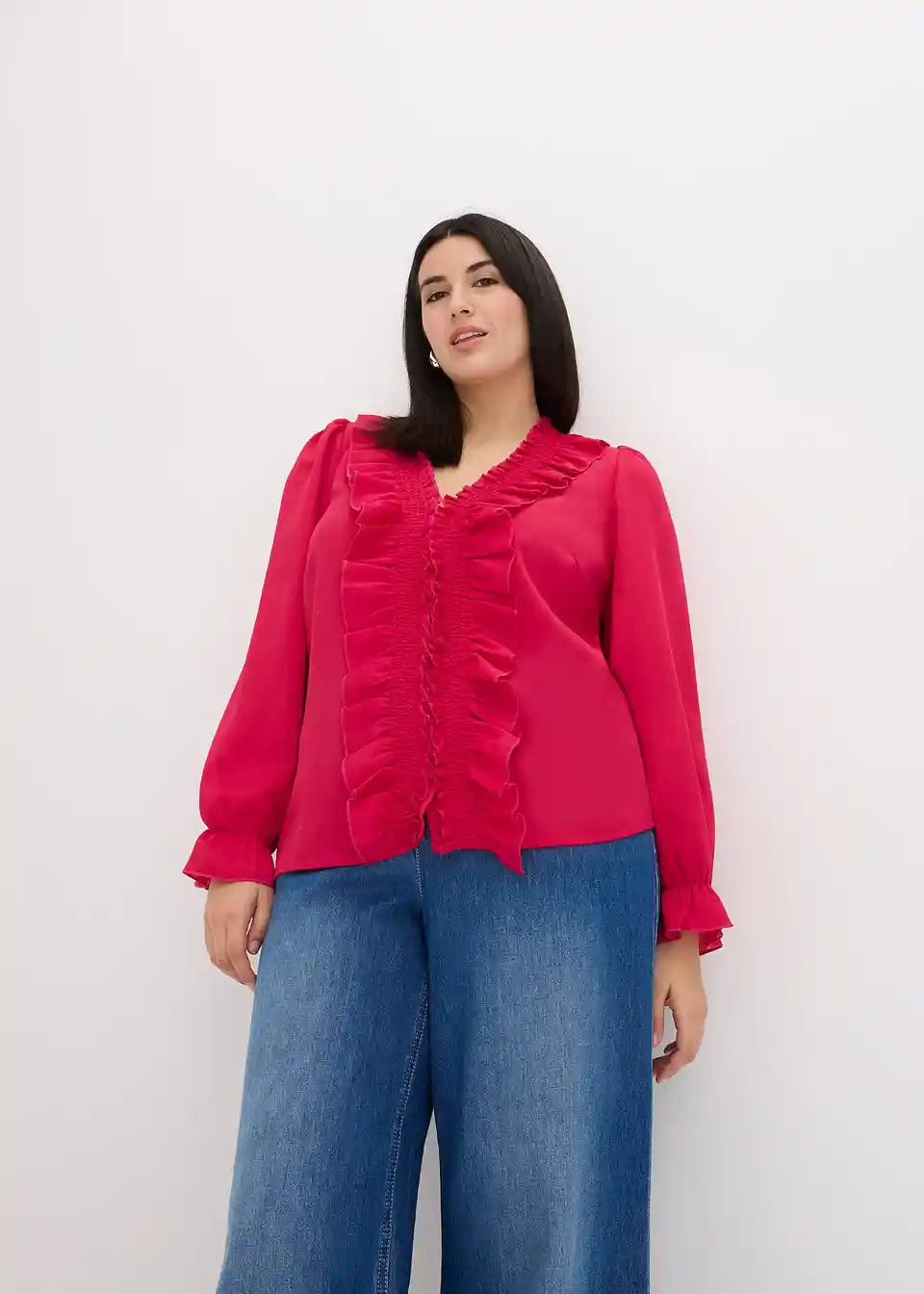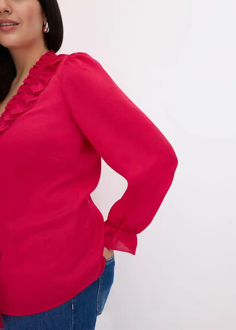 moderna bluza s volanima na izrezu i duž prednjeg reda gumba