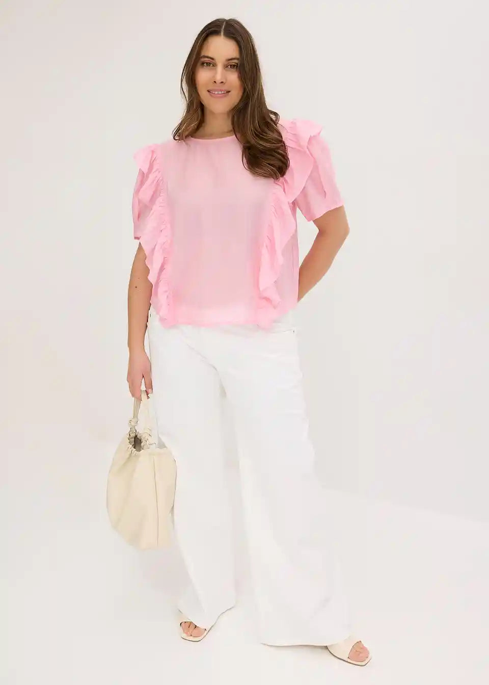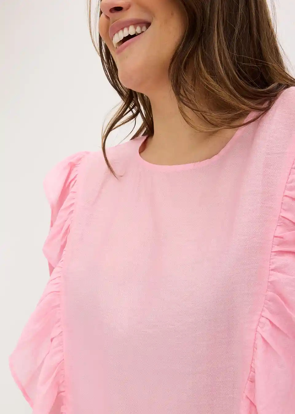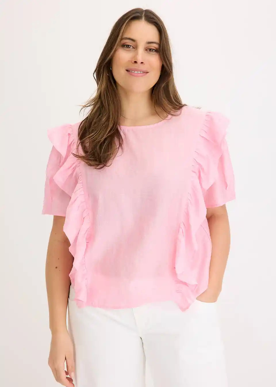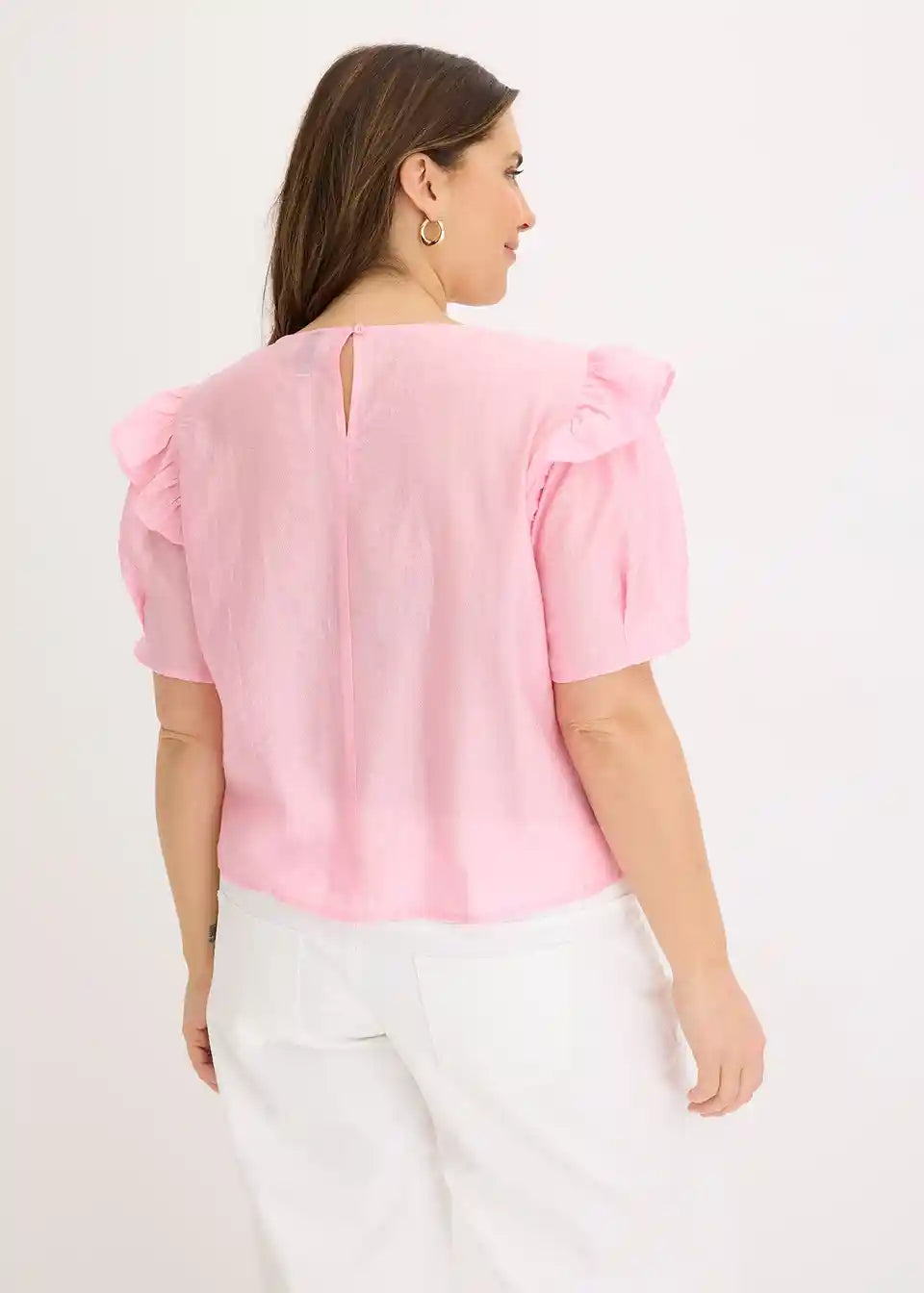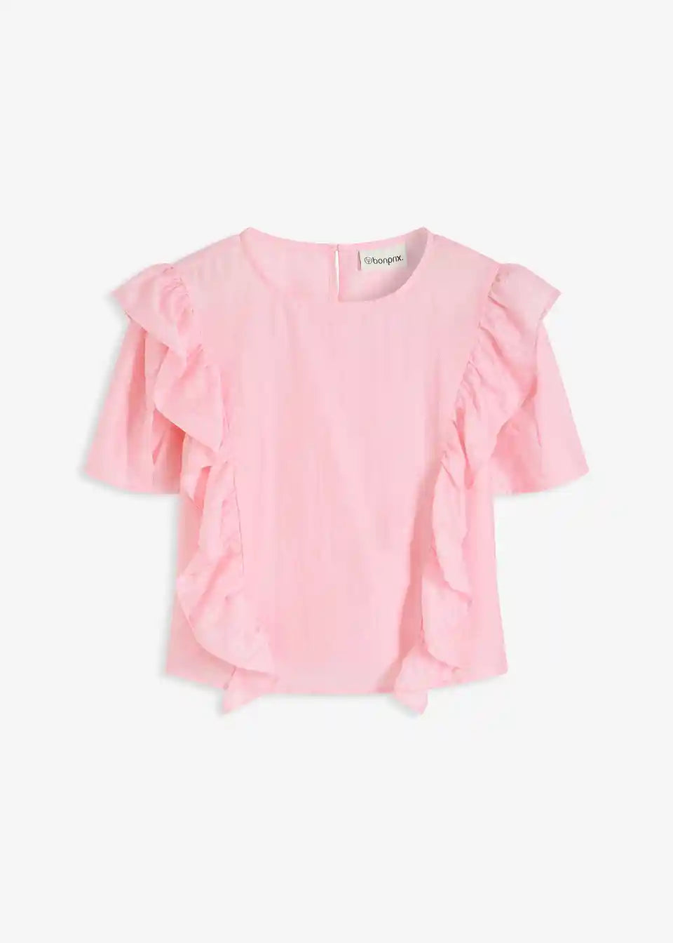 moderna bluza s volanima sprijeda i kopčanjem na gumb straga na izrezu