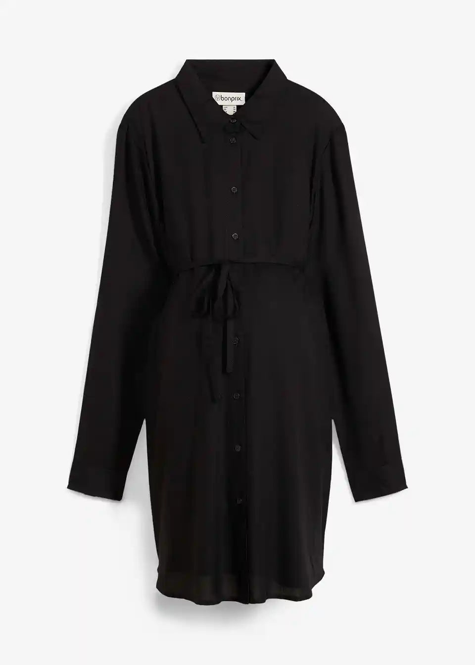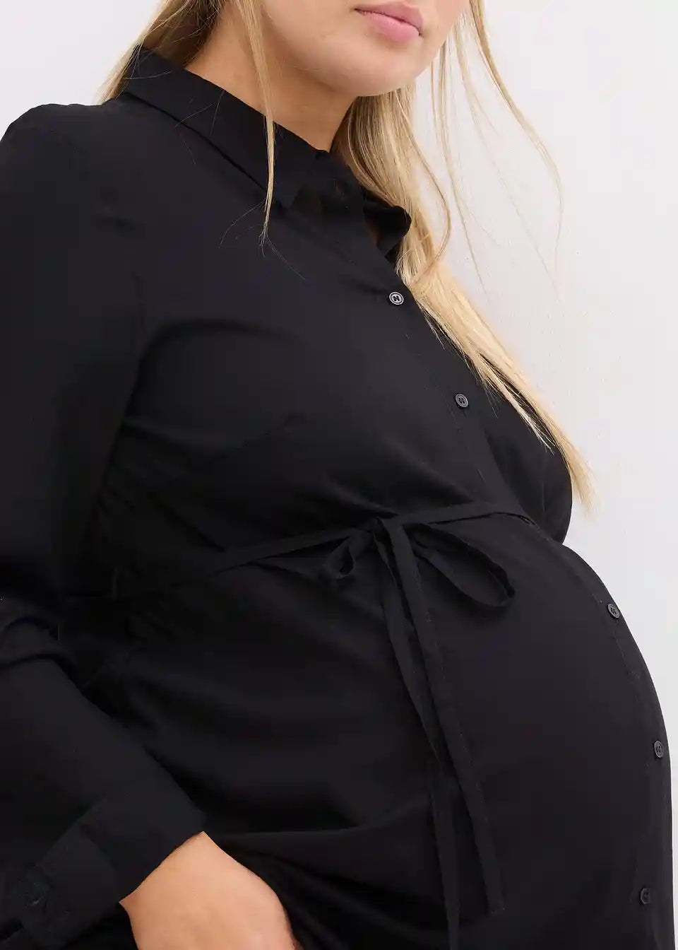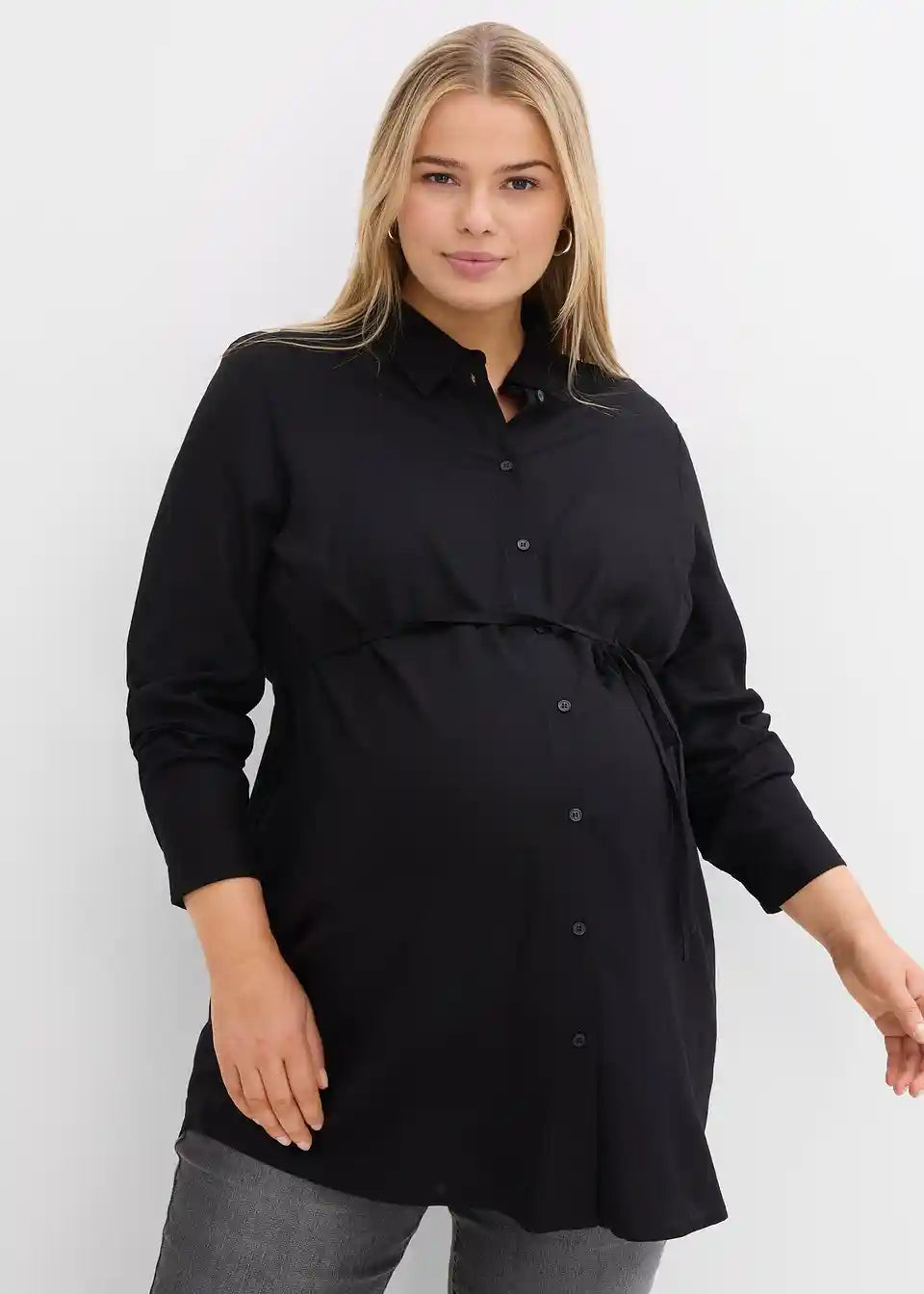 Dugorukavna bluza od viskoze, koja prekriva bokove, s cjelovitom dugmadi i uskom, odvojivom vezicom ispod grudi. Blago zaobljeni rub.