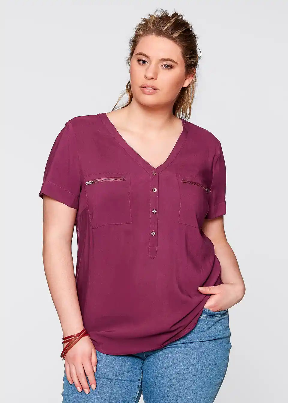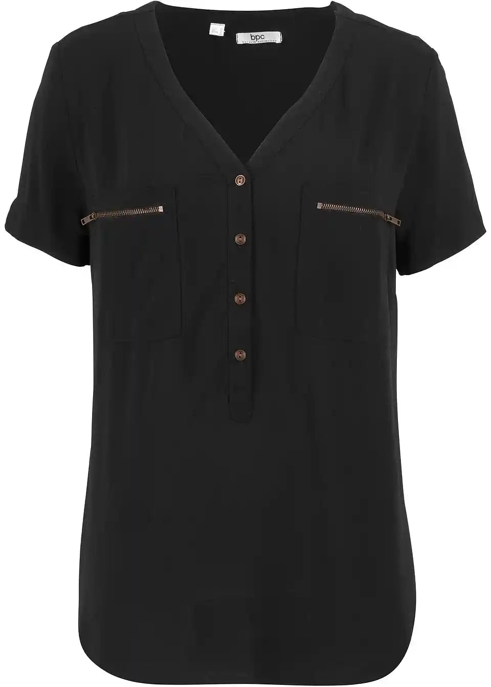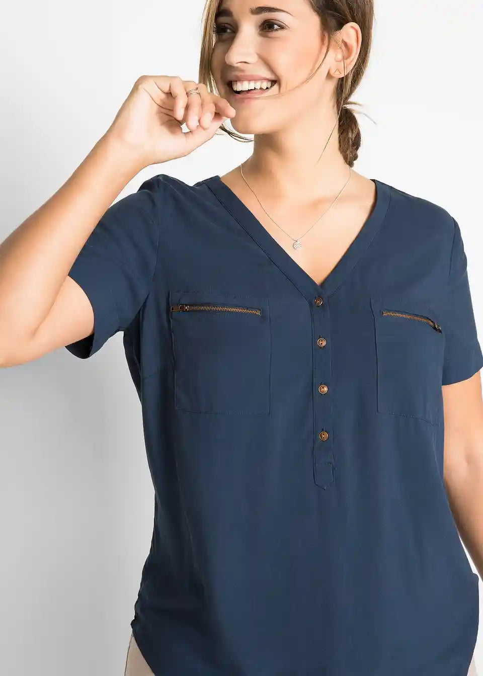 Ležerni kroj i ugodna viskozna kvaliteta čine ovu bluzu iz bpc-a omiljenim komadom za svakodnevno nošenje. Privlačni V-izrez nastavlja se u mali niz gumba, pomoću kojih se može individualno regulirati. Kao dodatni vizualni detalji ističu se dva prsna džepa s patentnim zatvaračem. Lagano zaobljeni donji rub na stražnjoj strani zaokružuje atraktivan dizajn viskozne bluze s rukavima do polovice dužine.