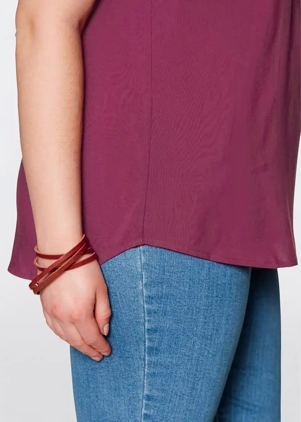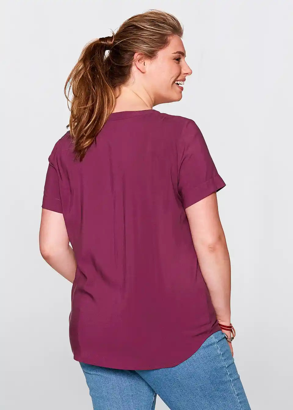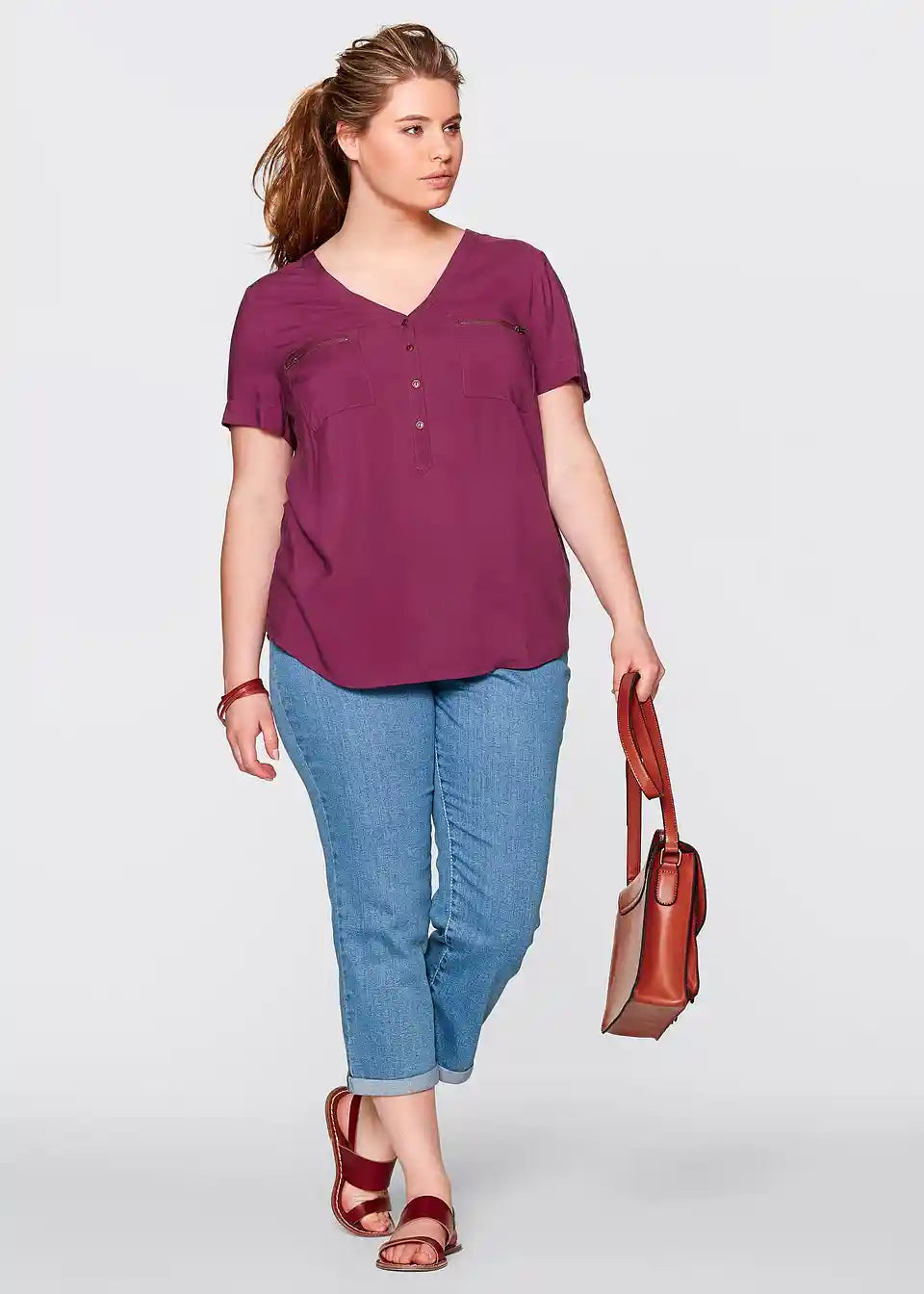 Ležerni kroj i ugodna viskozna kvaliteta čine ovu bluzu iz bpc-a omiljenim komadom za svakodnevno nošenje. Privlačni V-izrez nastavlja se u mali niz gumba, pomoću kojih se može individualno regulirati. Kao dodatni vizualni detalji ističu se dva prsna džepa s patentnim zatvaračem. Lagano zaobljeni donji rub na stražnjoj strani zaokružuje atraktivan dizajn viskozne bluze s rukavima do polovice dužine.