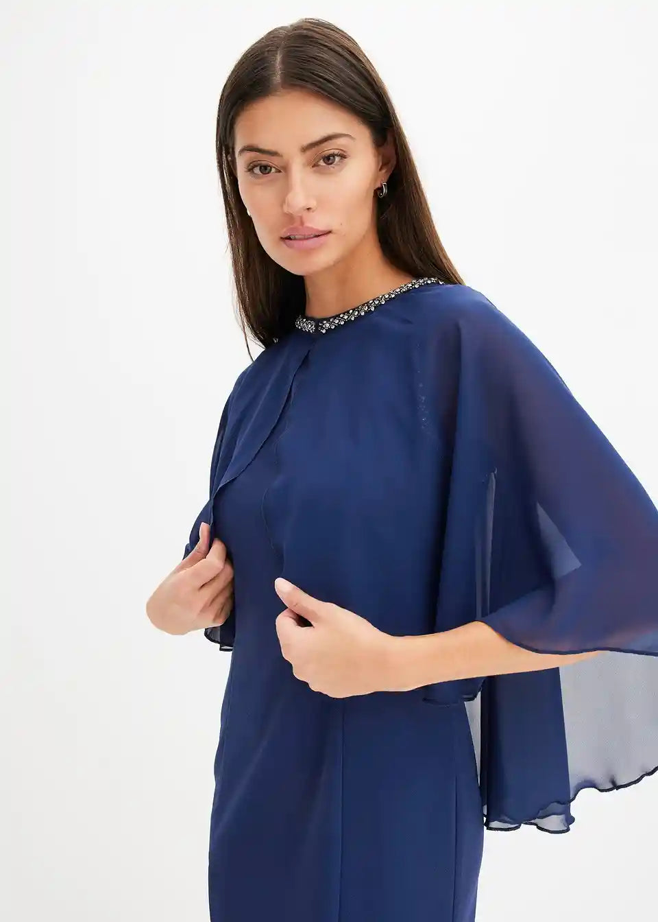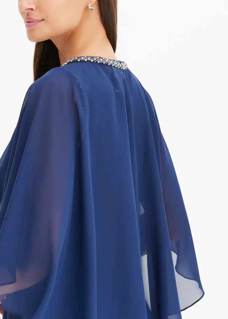 Haljina od strukturiranog krepa s ukrasnim kamenčićima na otvoru za ruke te odvojivim plaštom s ukrasnim kamenčićima na izrezu