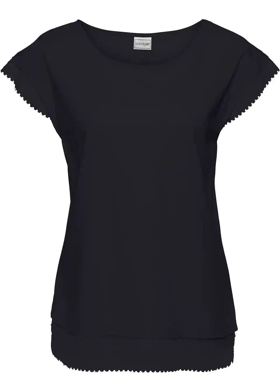 Feminilan i svestran dizajn čini ovu Boxy-majicu brenda BODYFLIRT pravim omiljenim odjevnim komadom. Majica je ukrašena finom čipkom na rukavima i donjem rubu, što stvara lijep slojevit izgled. Stražnja strana majice izrađena je središnjim šavom. Kratki, spušteni rukavi i okrugli izrez daju joj ležeran ton. Uz uske traperice, ova prekrasna Boxy-majica izgleda posebno dobro.
