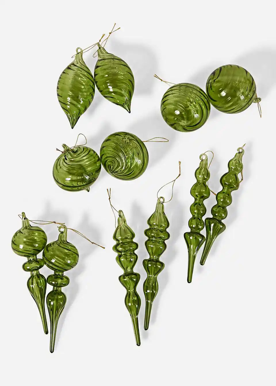 Set od 12 Božićnih kuglica donosi stiliziran i raznovrstan izbor dekorativnih elemenata za božićno drvce. S skladnom kombinacijom zelenih i amber tonova, ovaj set unosi svečanu eleganciju i sjaj u blagdansko vrijeme. Različiti oblici, od klasičnih kuglica do zavijenih dizajna, pružaju raznovrstan i atraktivan izgled. Svaka kuglica je pažljivo izrađena i opremljena čvrstom kukicom za jednostavno postavljanje na bor. Idealne za korištenje na božićnom drvcu ili kao dio blagdanskih aranžmana, kuglice unose vedre naglaske i daju svakoj prostoriji ugodnu atmosferu. Bezvremenski ukras koji povećava iščekivanje Božića i stvara blagdanski ugođaj.