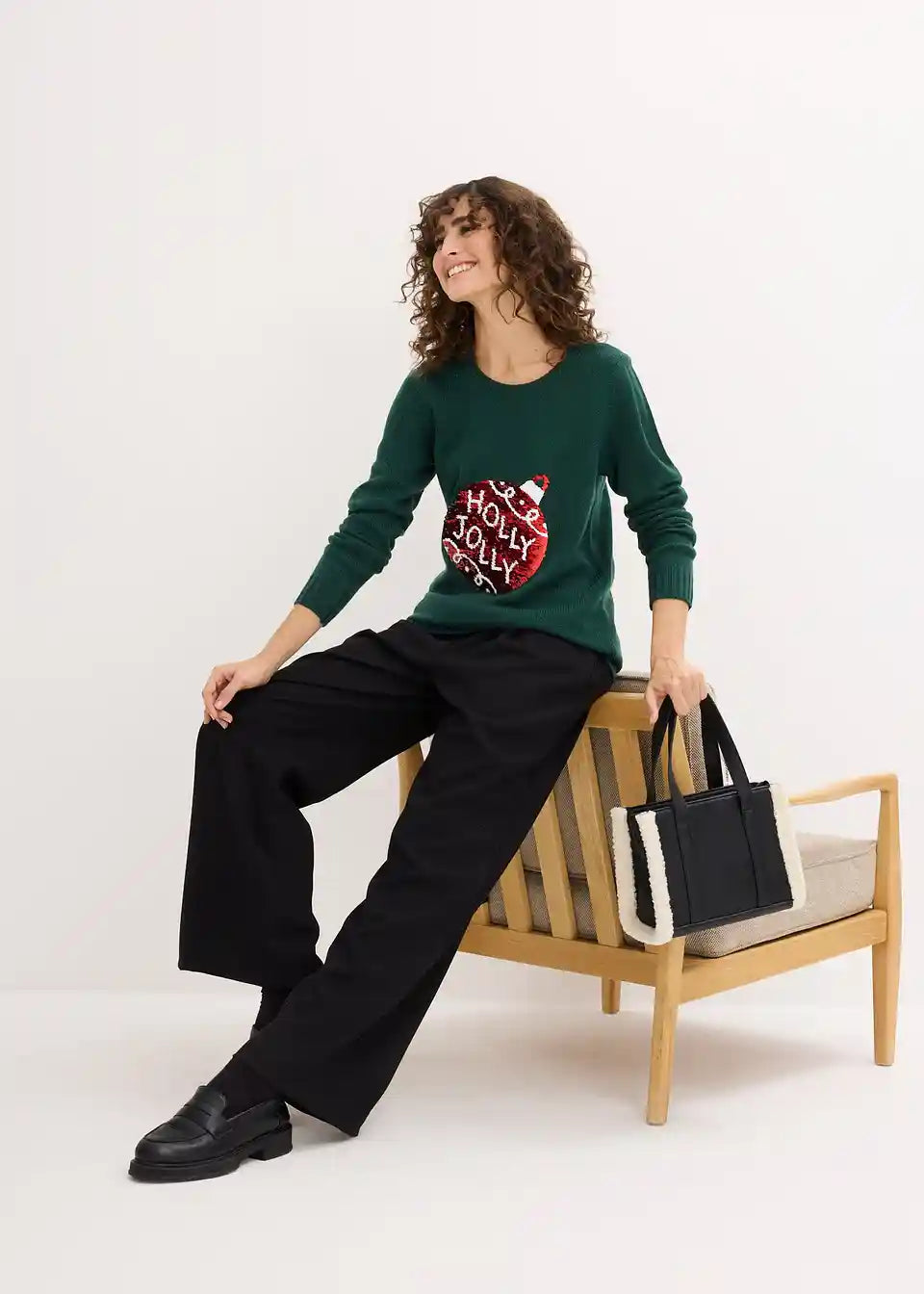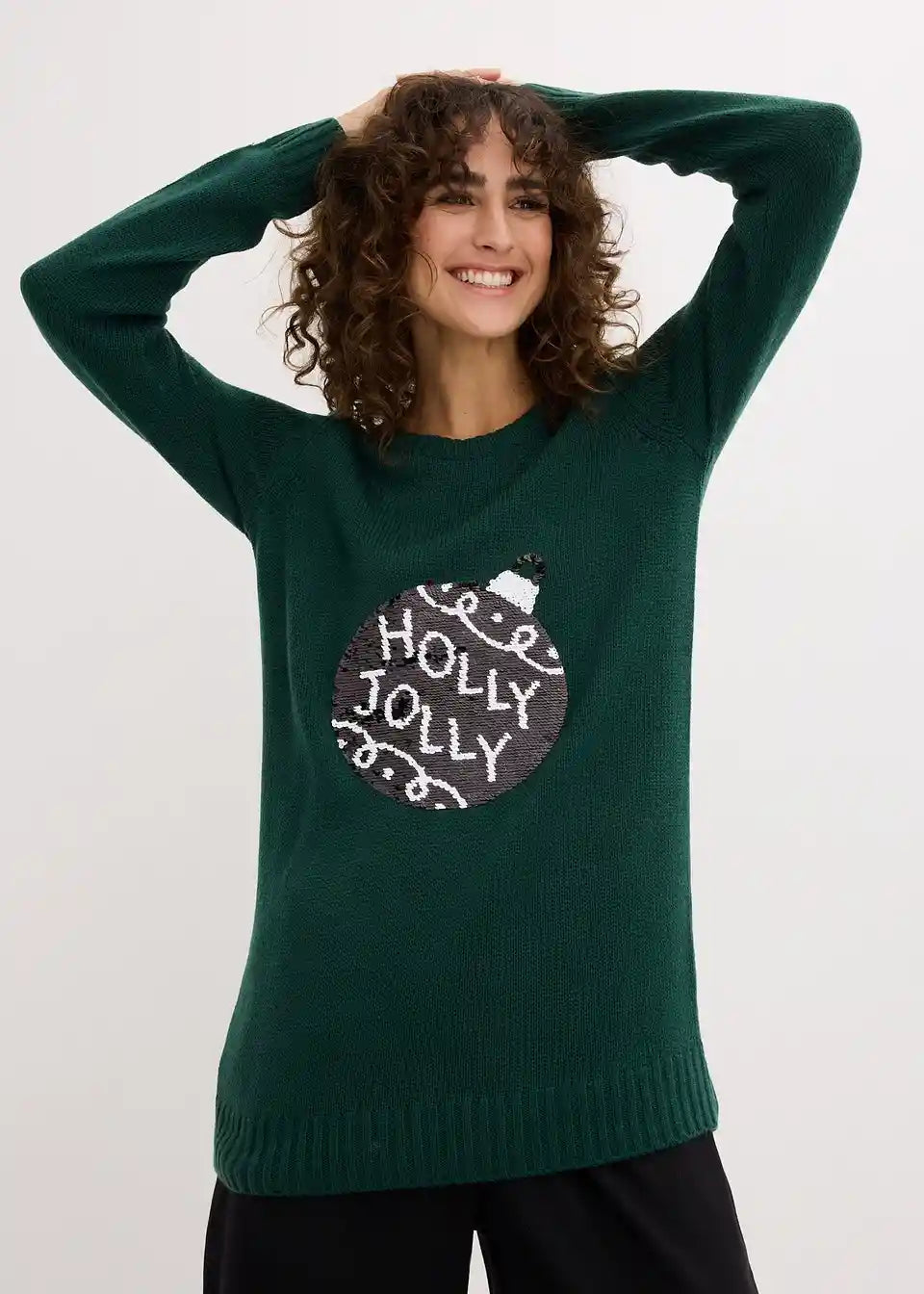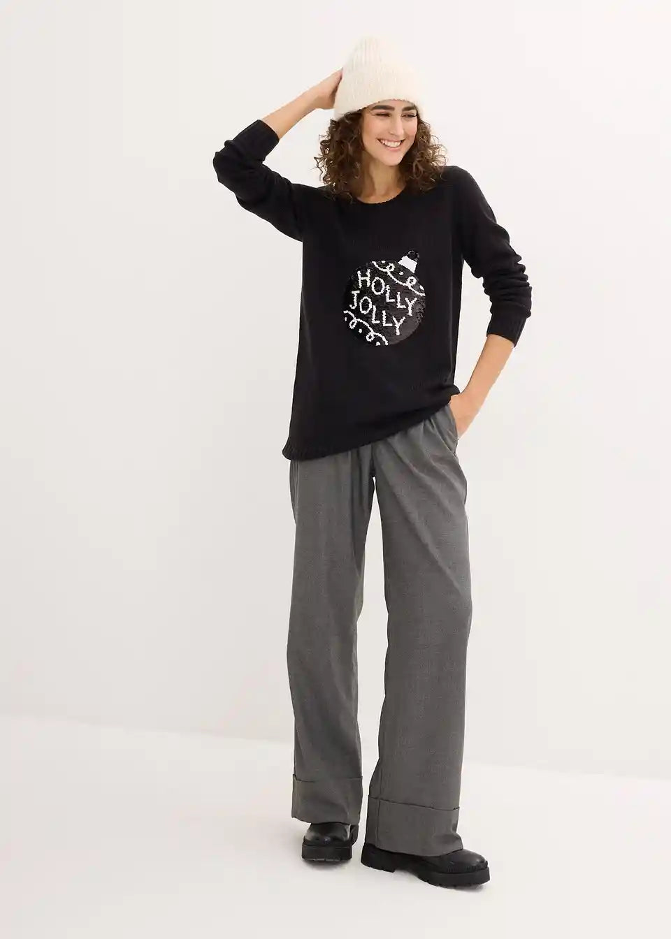 Udobno krojen božićni pulover s okruglim izrezom i reverzibilnim šljokicama