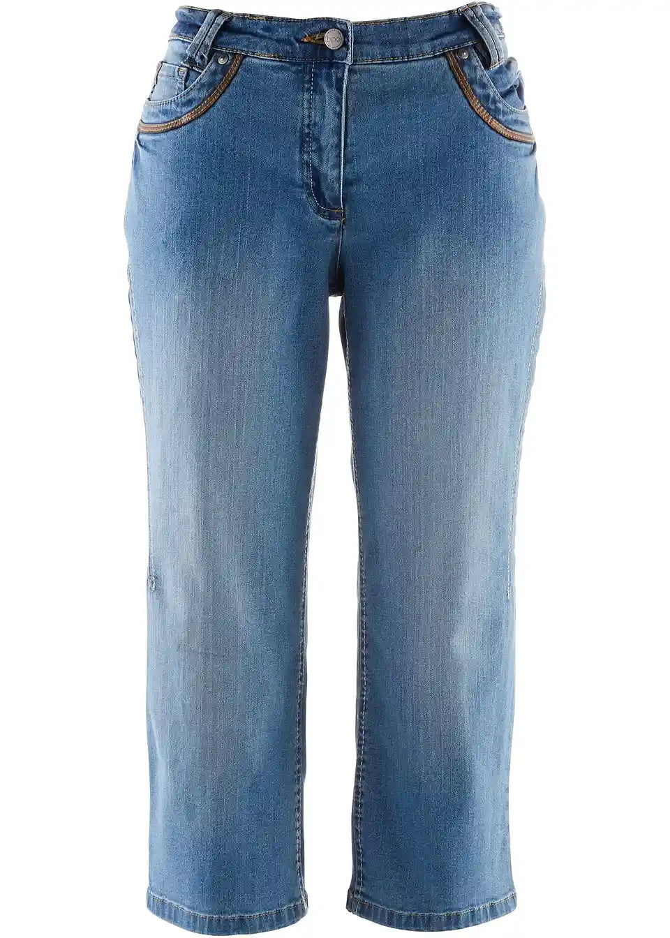 Privlačne Capri stretch traperice marke bpc stvaraju vitku siluetu zahvaljujući bočnim kosim šavovima koji se sužavaju prema unutra, dok elastični materijal ugodno leži na koži. Duple omče za remen omogućuju optimalno prianjanje u kombinaciji s remenom. Dva kosa džepa sprijeda uokvirena su imitacijom kože i pružaju lijep vizualni efekt. Dva stražnja našivena džepa zaokružuju raznovrstan izgled koji se lako kombinira.