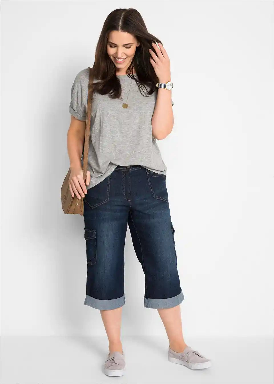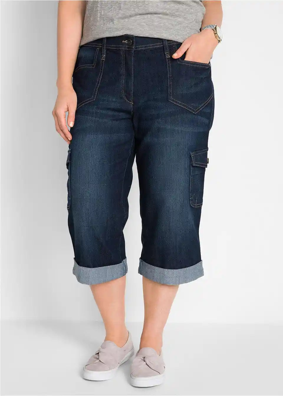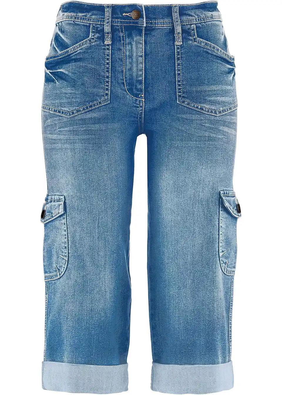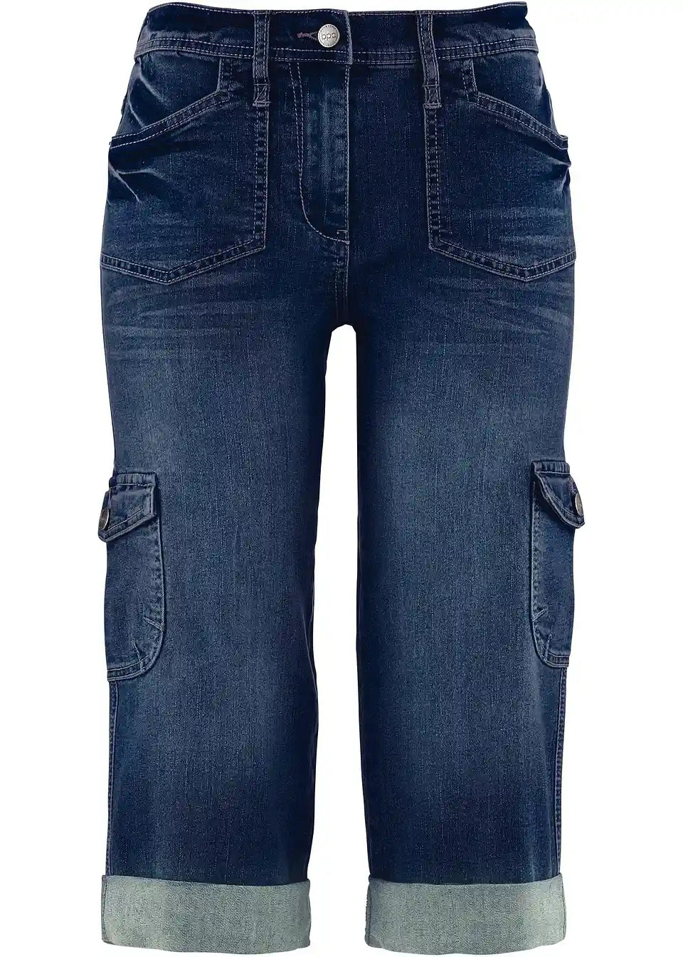 Privlačne cargo stretch traperice u capri dužini odlikuju se fantastičnom udobnošću. Bočna ugrađena elastika čini pojas fleksibilnim i osigurava ugodan osjećaj prilikom nošenja. Visoko postavljen struk i ravna, labava nogavica pridonose udobnom kroju. Dva stražnja našivena džepa i dva velika cargo džepa sprijeda daju trapericama marke bpc ležeran izgled. Porub modela je diskretno zavrnut.
