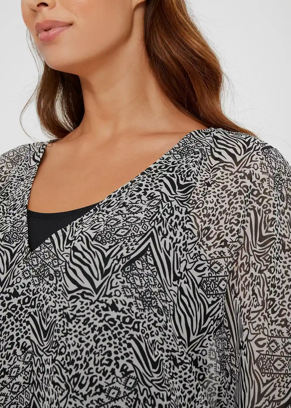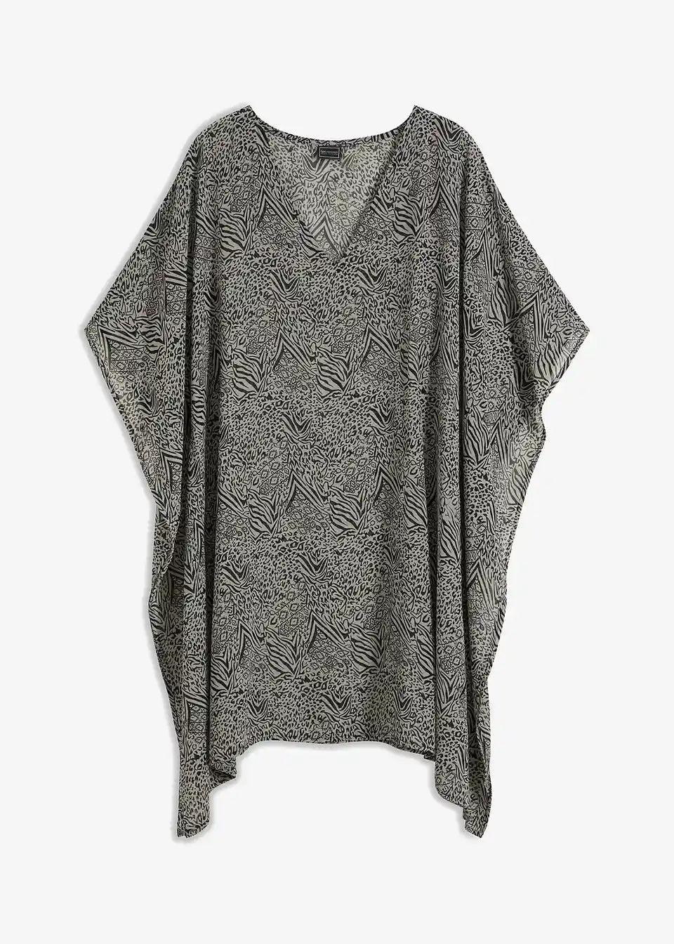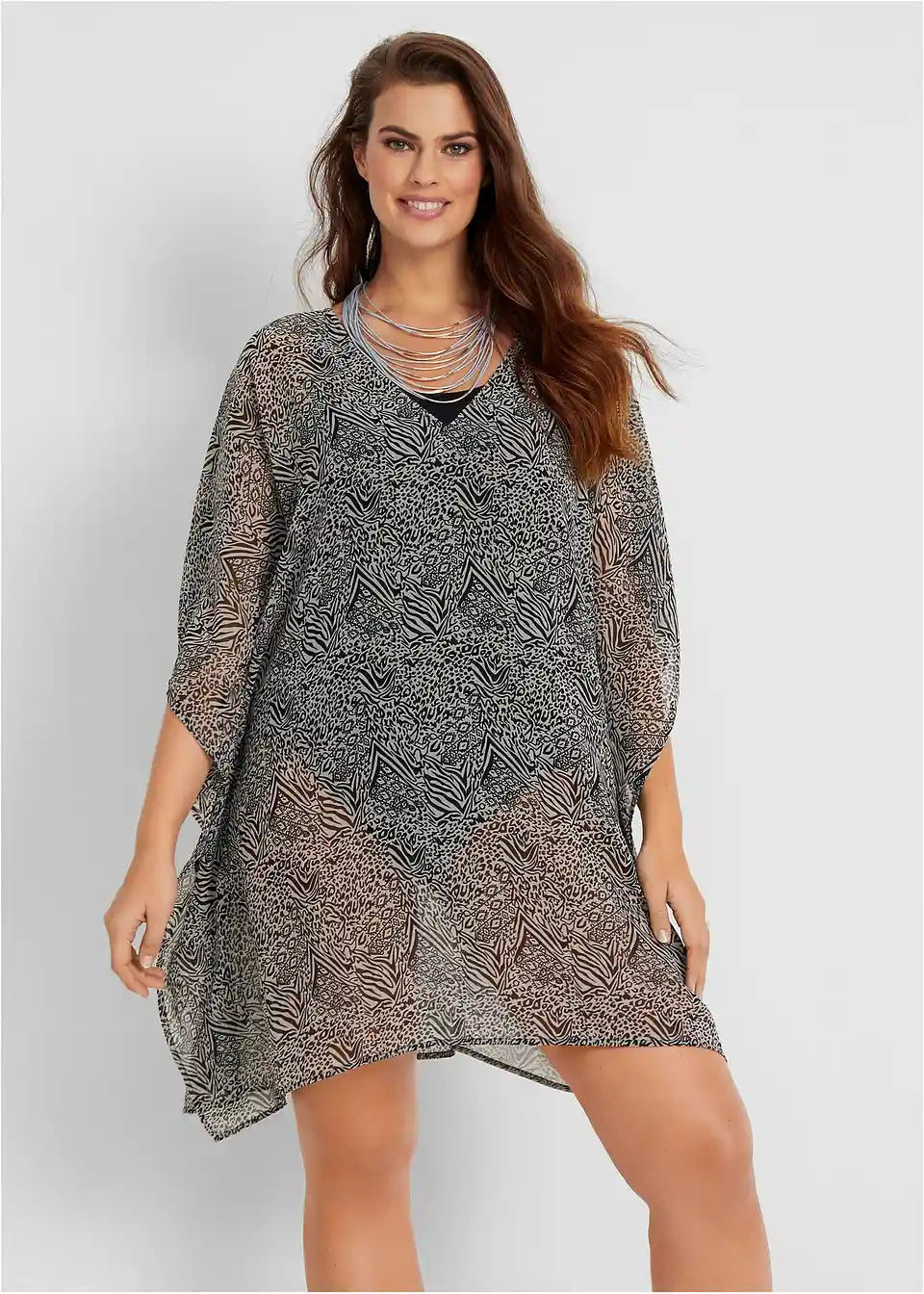 Ovaj model s V-izrezom prati dame tijekom šetnje plažom i osigurava elegantan izgled pri visokim temperaturama. Svojim ležernim krojem ova plaža haljina marke bpc selection laska ženskoj silueti. Ugodan materijal nježno prianja uz kožu i pruža prozračan osjećaj nošenja. Haljina je prozirna i na profinjen način stavlja naglasak na kupaći kostim ispod.