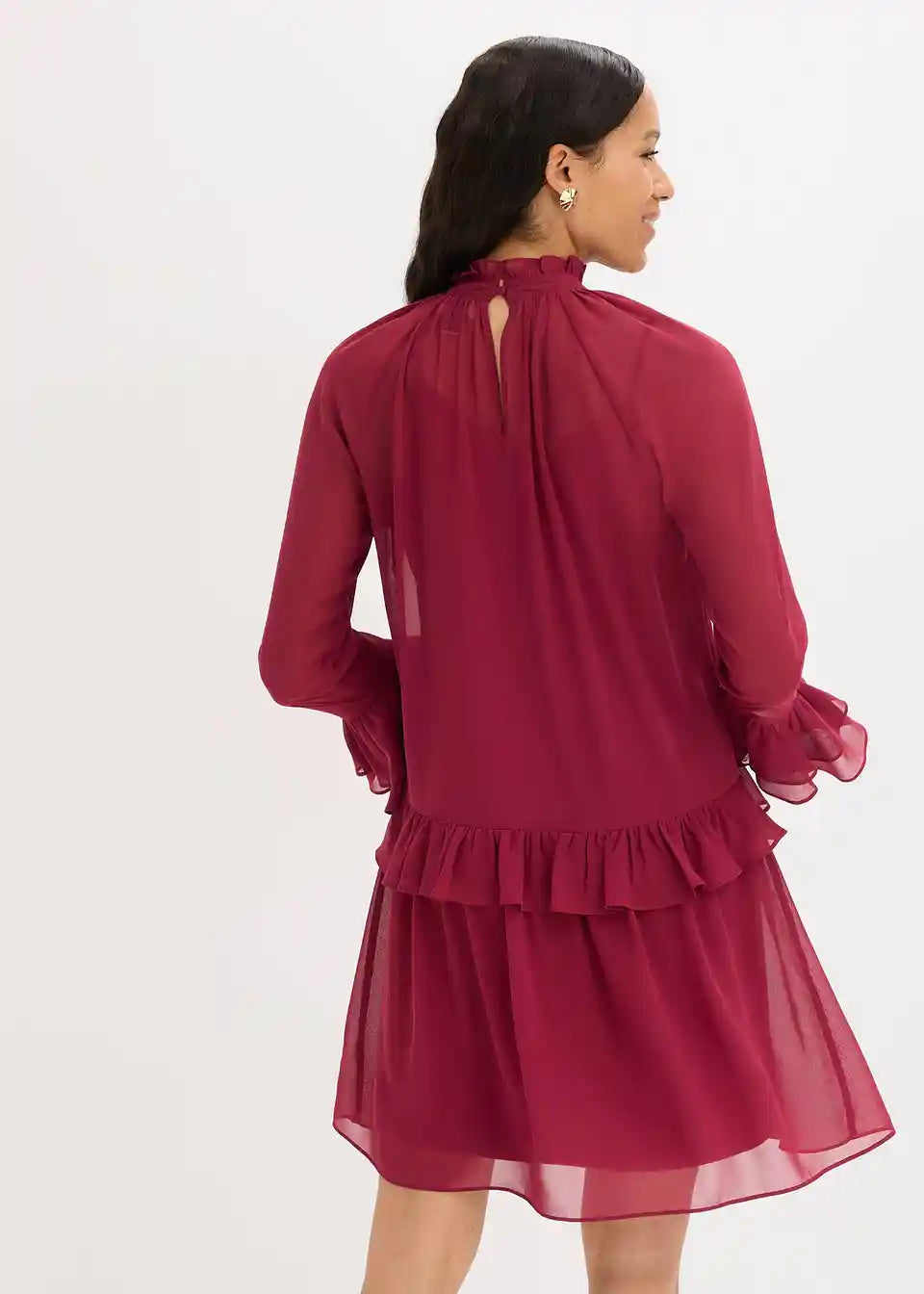moderna chiffonska haljina s volanima i stojećim ovratnikom