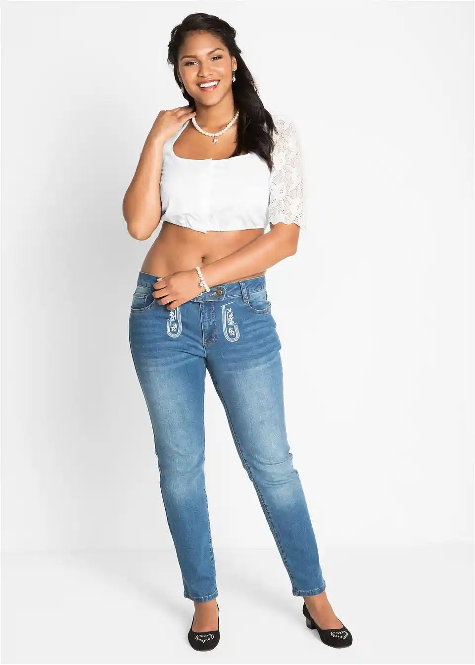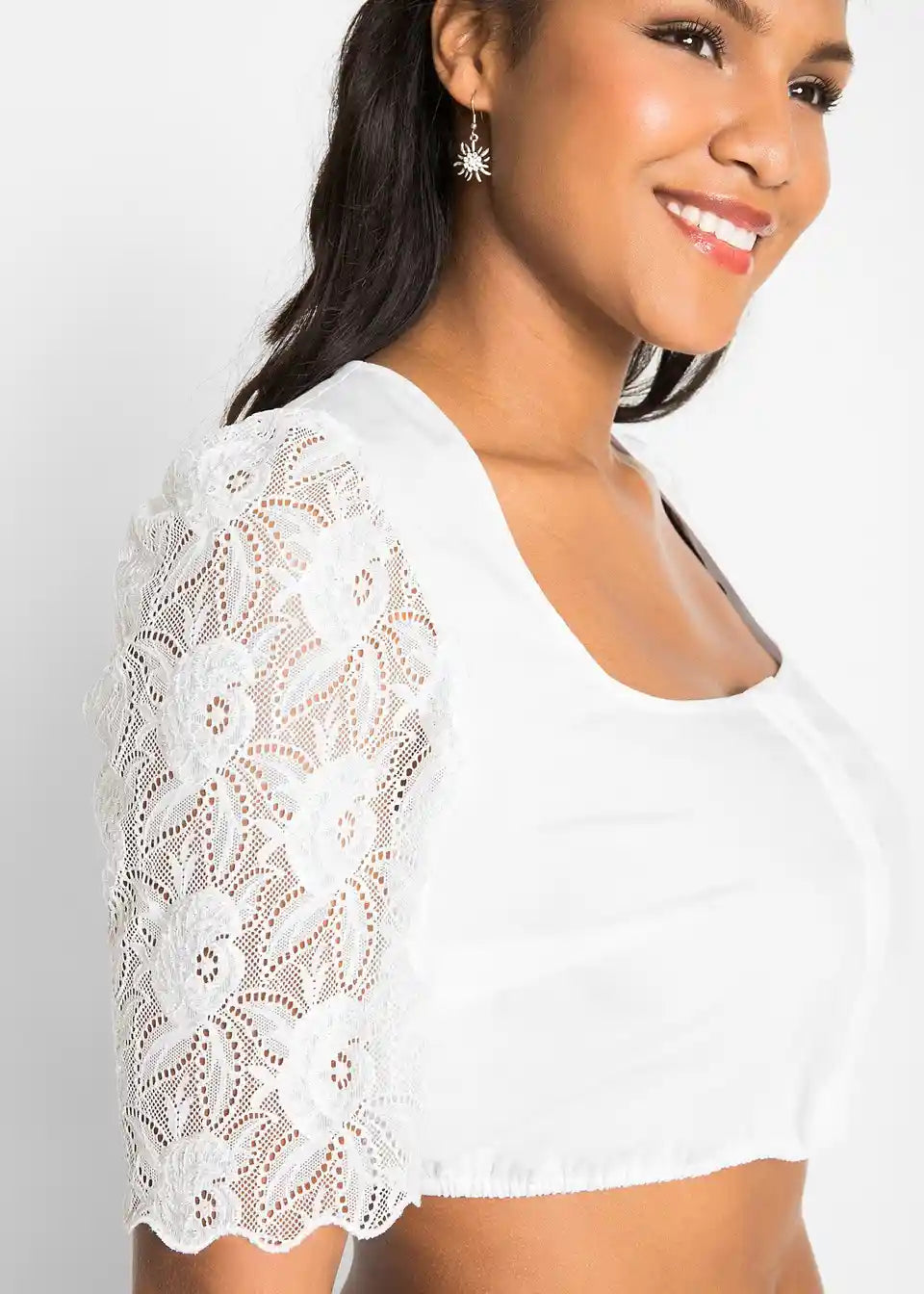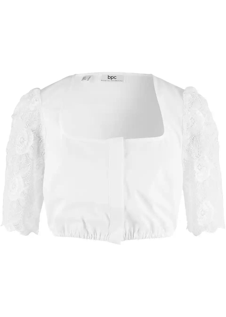 Lijepa Dirndl bluza sa čipkastim rukavima idealno upotpunjuje tradicionalnu odjeću. Zahvaljujući kratkom kroju, bluzu iz bpc kolekcije lako je nositi ispod dirndla. Na prednjoj strani bluza se kopča skrivenom dugmadi. Prozirni rukavi od nježne čipke daju modelu tradicionalan šarm. Tome doprinosi i široki kvadratni izrez koji lijepo ističe dekolte. Uz dirndl haljinu s pregačom, ova kratka podsuknja izgleda izuzetno šarmantno.