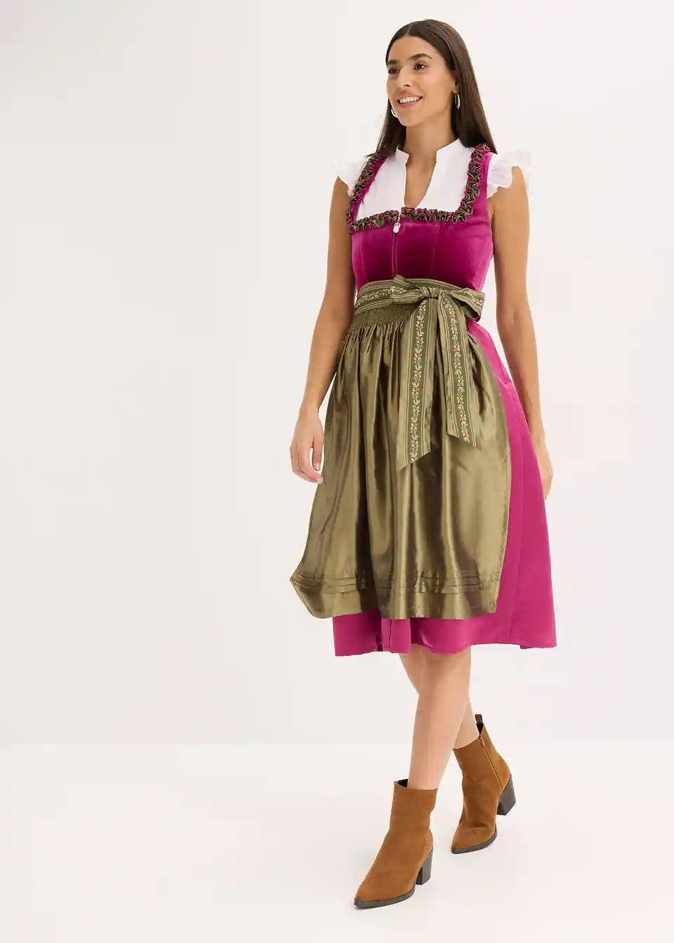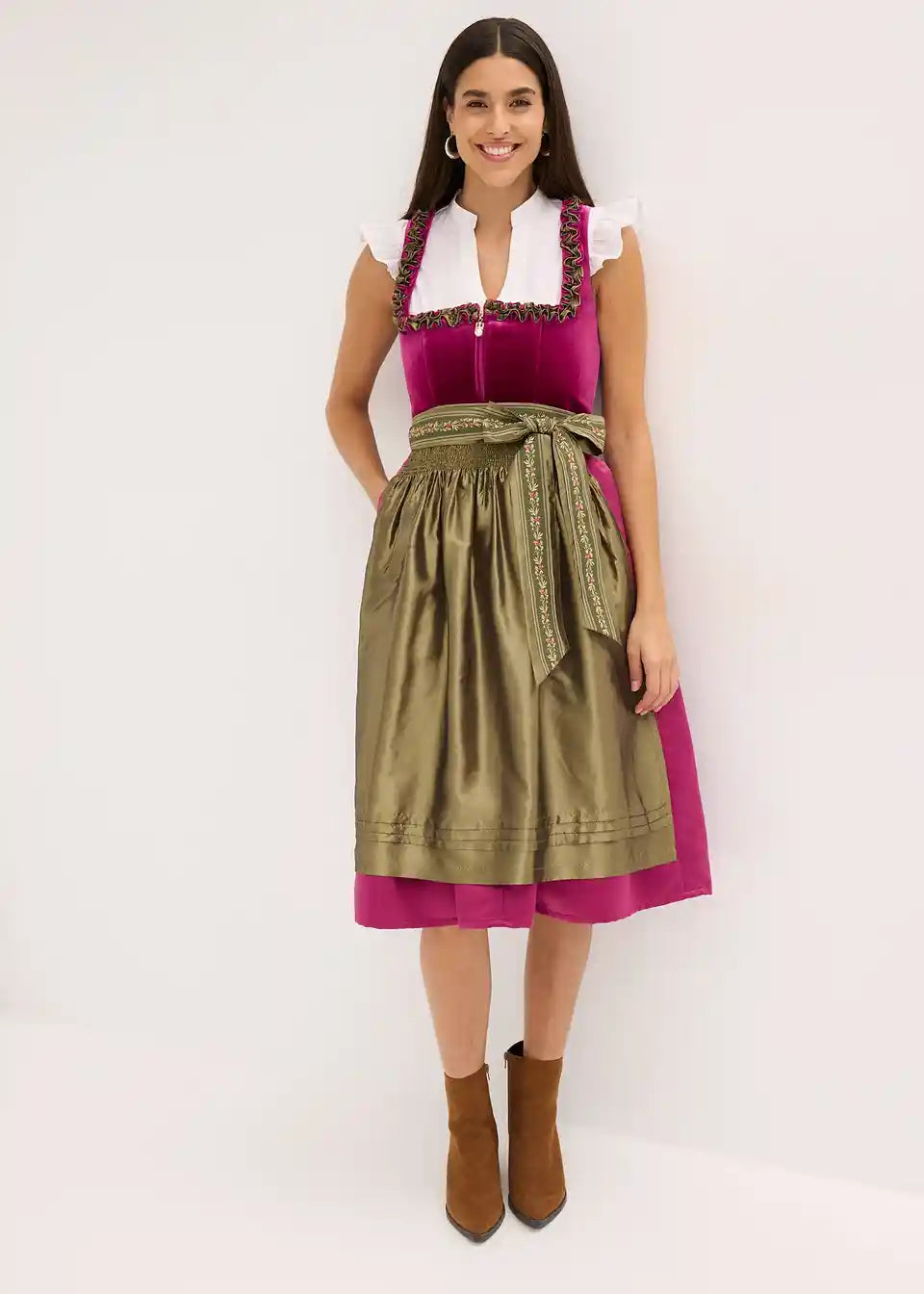 Tradicionalni Dirndl s visokokvalitetnim korzetom od baršuna i suknjom koja mijenja boje. Suknja je opremljena udobnom pamučnom podstavom.