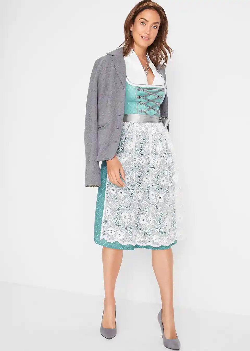 2-dijelni dirndl s čipkastom pregačom u dužini do koljena