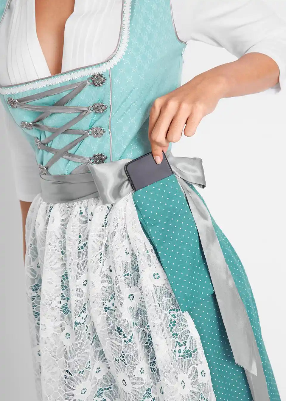 Prekrasan Dirndl s čipkastom pregačom i dekorativnim vezivanjem na prsluku