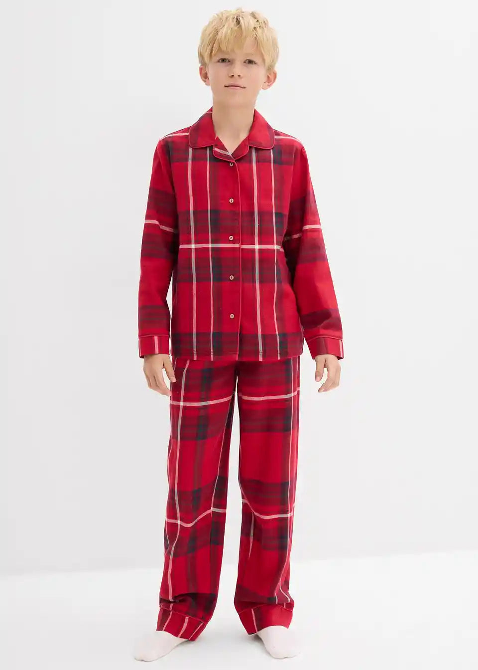 Udobna pidžama s blagdanskim karo uzorkom. Pidžama je od mekog pamuka. Gornji dio na kopčanje gumbima.
