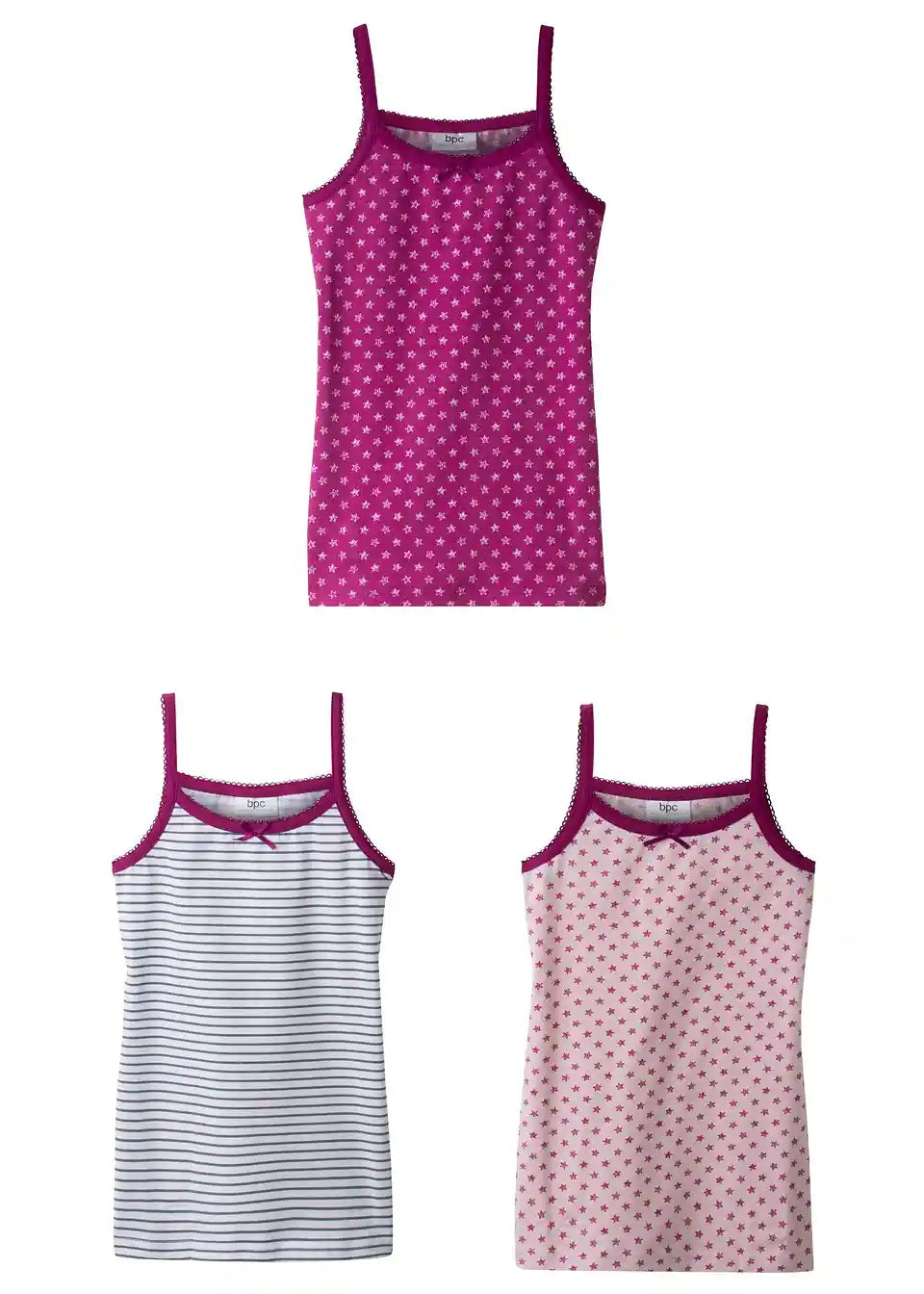 Ovaj set od 3 komada sastoji se od tri prekrasne potkošulje s tankim naramenicama. Zahvaljujući lijepom uzorku zvjezdica i pruga, ove slatke potkošulje u tri svježe boje pravi su ukras. Kontrastne završne obrube i mala mašnica dodatno uljepšavaju dizajn. Izrađene su od ugodnog organski uzgojenog pamuka i savršeno se kombiniraju s gaćicama iz iste serije.
