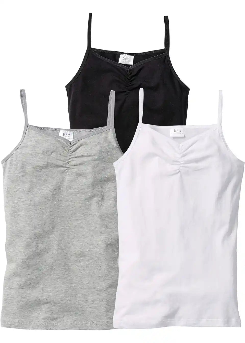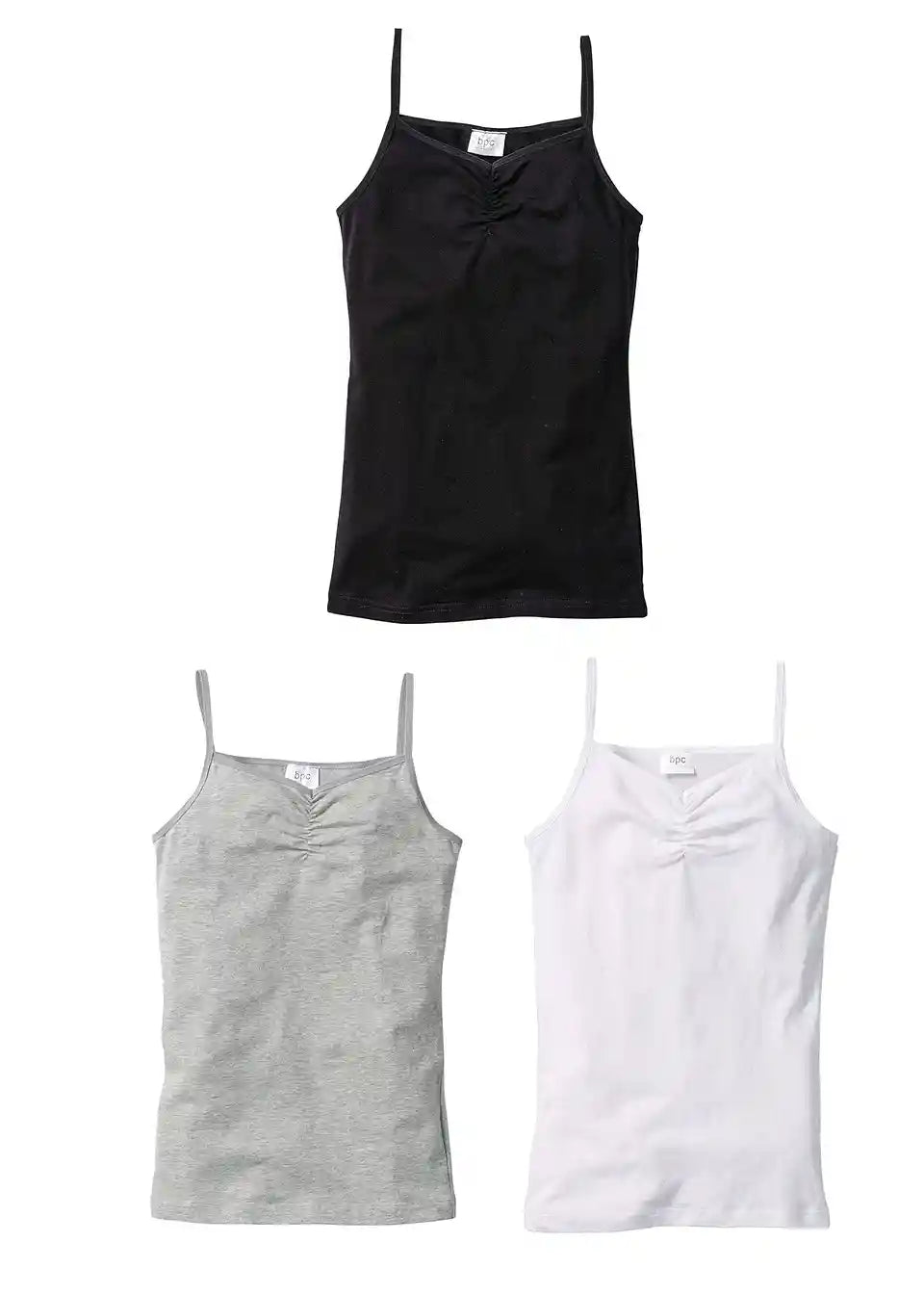 Uz ovo povoljno višestruko pakiranje, djevojčice dobivaju lijepe osnovne komade donjeg rublja u obliku tri topa marke bpc. Uske i elastične naramenice kao i rastezljivi otvori za ruke pružaju ugodno pristajanje, a mekani materijal osigurava ukupan osjećaj udobnosti prilikom nošenja. Topovi su sprijeda u sredini izreza blago nabrani. Topovi u pakiranju od tri komada dolaze u različitim bojama.