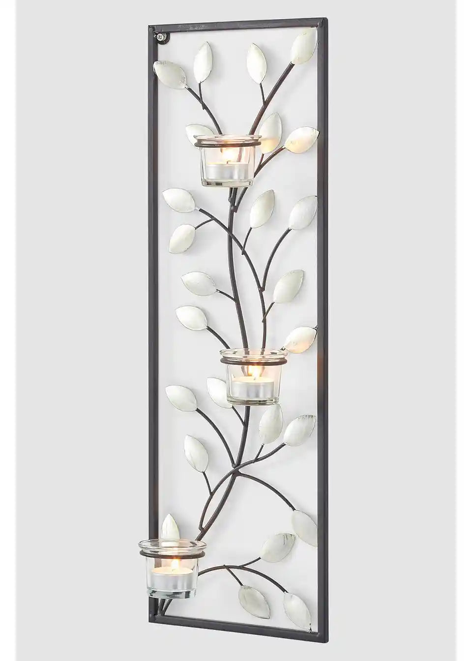 Ovaj elegantni držač za zidne svijeće uljepšava zid u trenu. Držač za svijeće izrađen je od metala, a njegov crni lakirani završetak ostavlja dojam profinjenosti. Dolazi s 3 prozirne čaše za čajne svijeće, isporučuje se bez čajnih svijeća.
