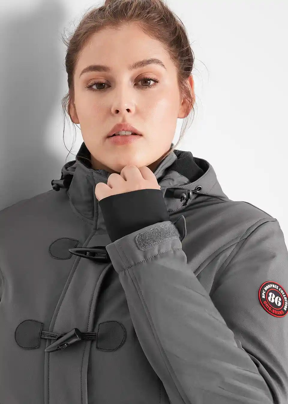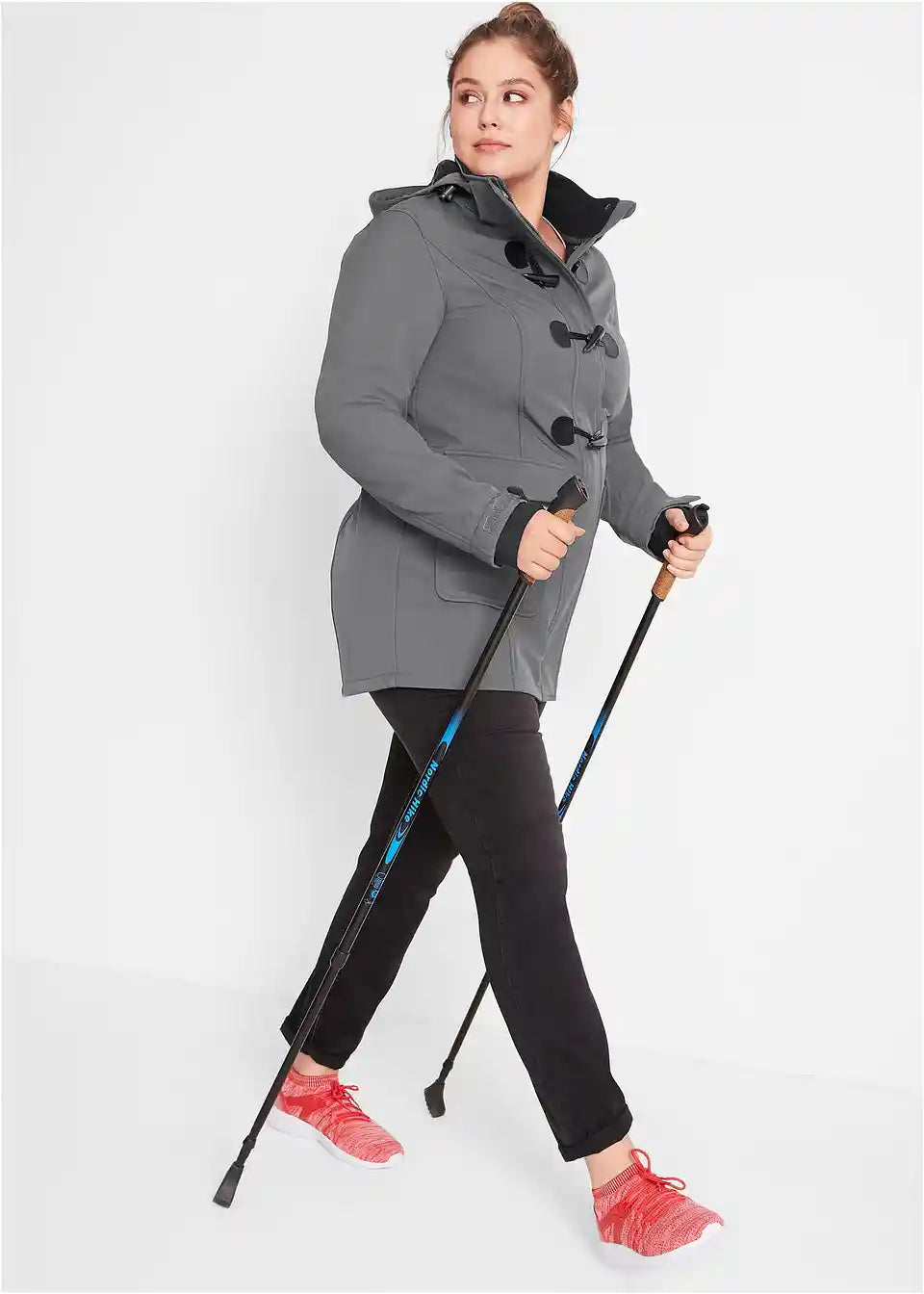 odvojiva kapuljača, zaobljeni rub, stražnji dio malo duži od prednjeg, otvori za palčeve, dvosmjerni patentni zatvarač i kopče, unutrašnjost jakne intenzivno brušena, duljina u veličini 42 cca. 78 cm.