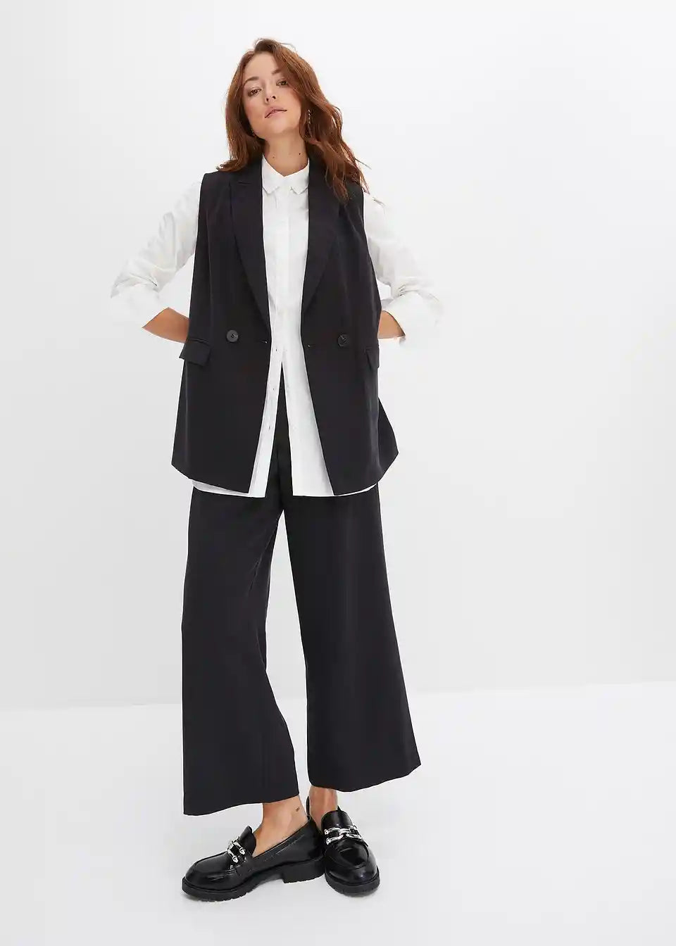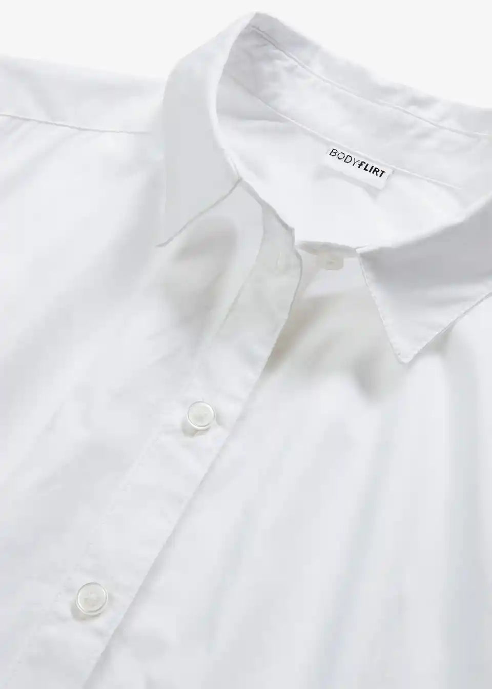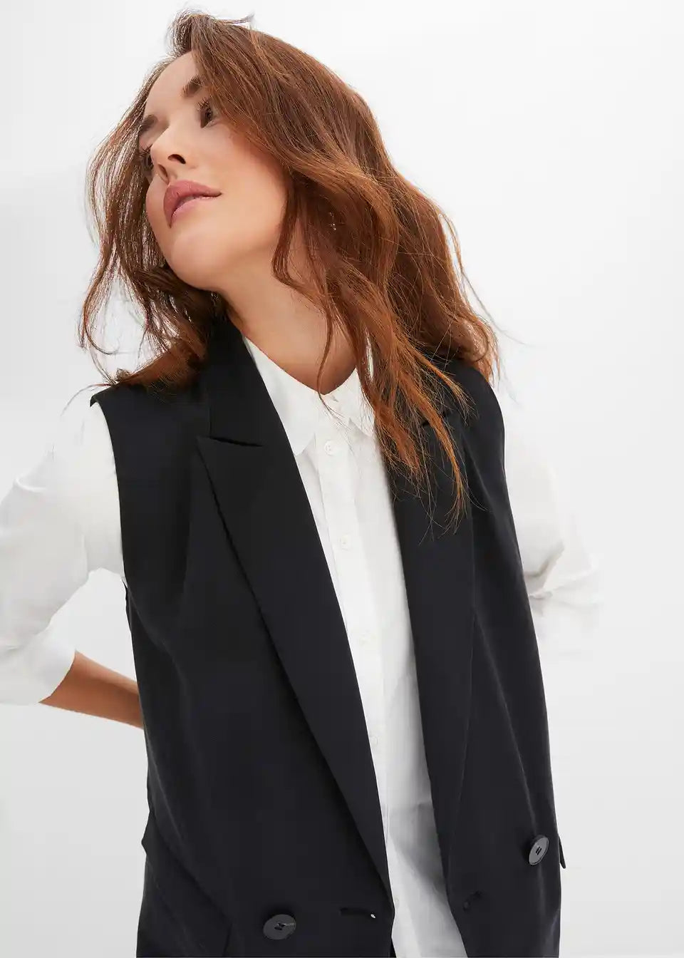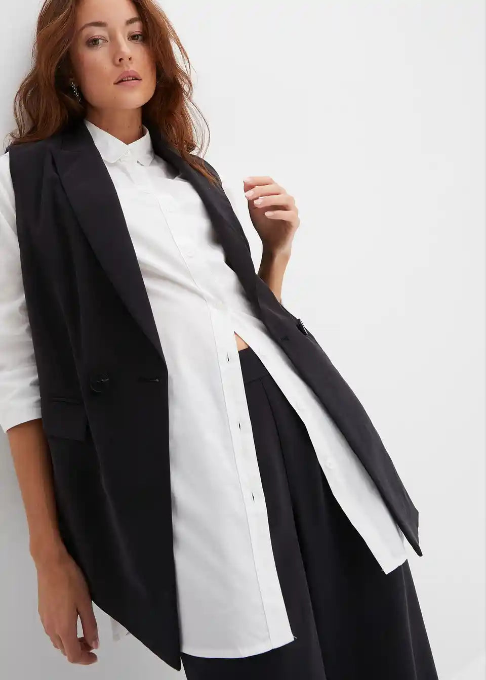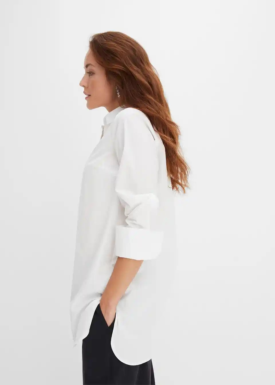 Duga bluza s zaobljenim rubom, ukrasnom dugmadi i klasičnim stajaćim ovratnikom. Duljina u veličini 38 približno 80 cm.