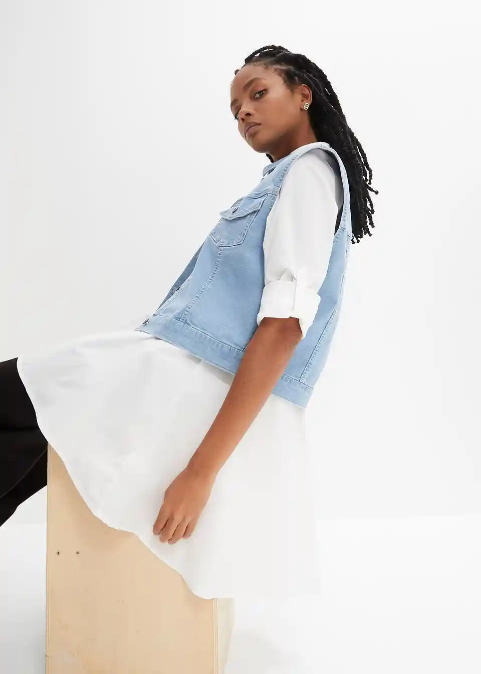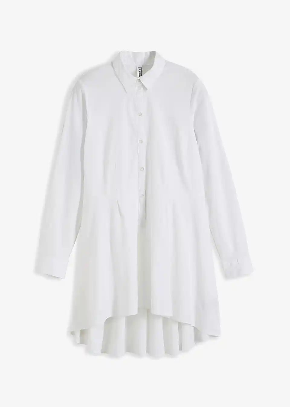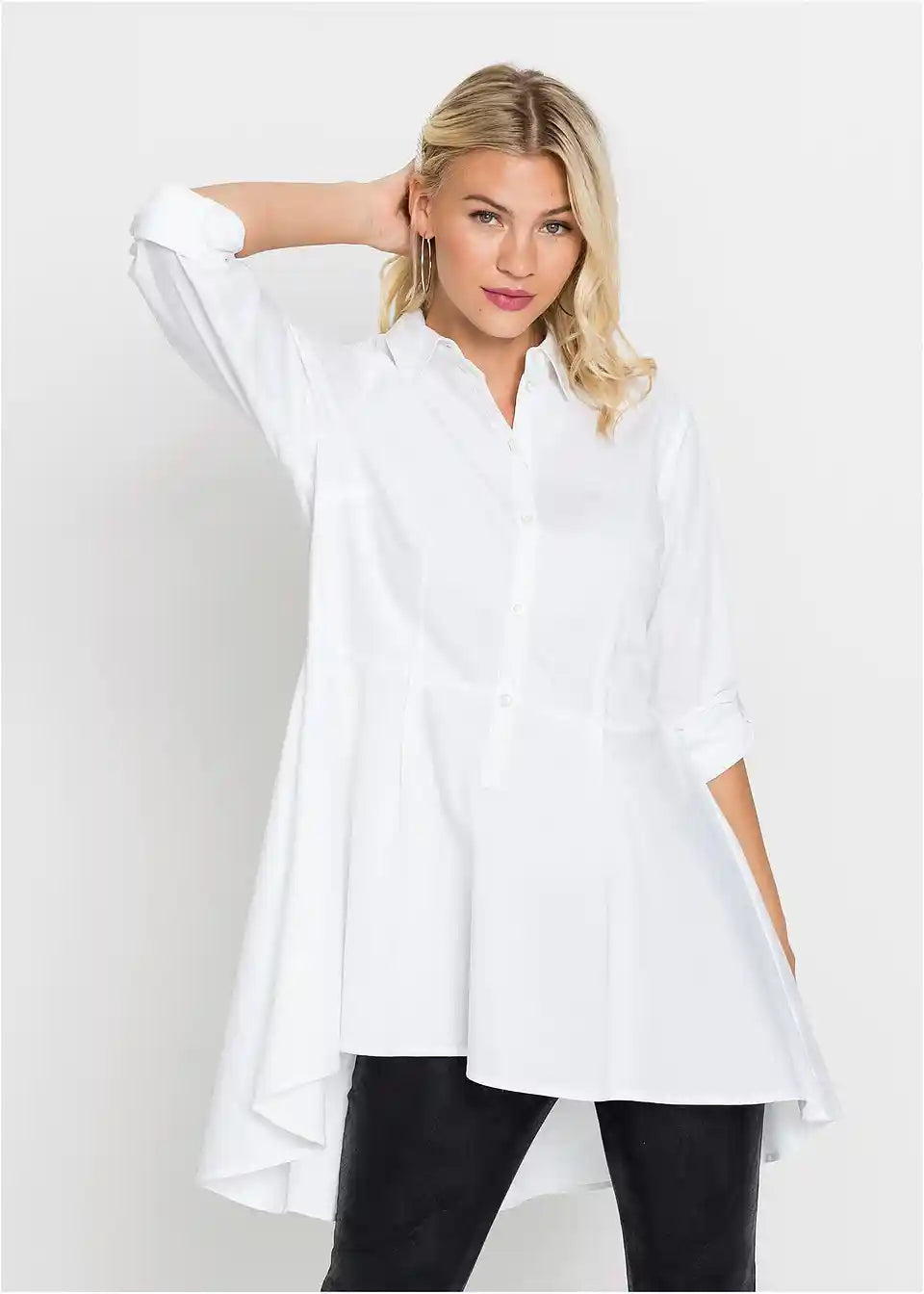 Ova trendovska duga bluza savršeno se ističe. Impresivan dizajn privlači pažnju zahvaljujući širokoj A-liniji. Volan s dužim stražnjim dijelom stvara atraktivan efekt high-low izgleda. Posebno je moderan ovratnik. Široki rukavi s manžetama mogu se ležerno podvrnuti i fiksirati ukrasnim trakama. Kopčanje na gumbe na prednjem srednjem dijelu proteže se do struka i čini elegantan način zatvaranja.