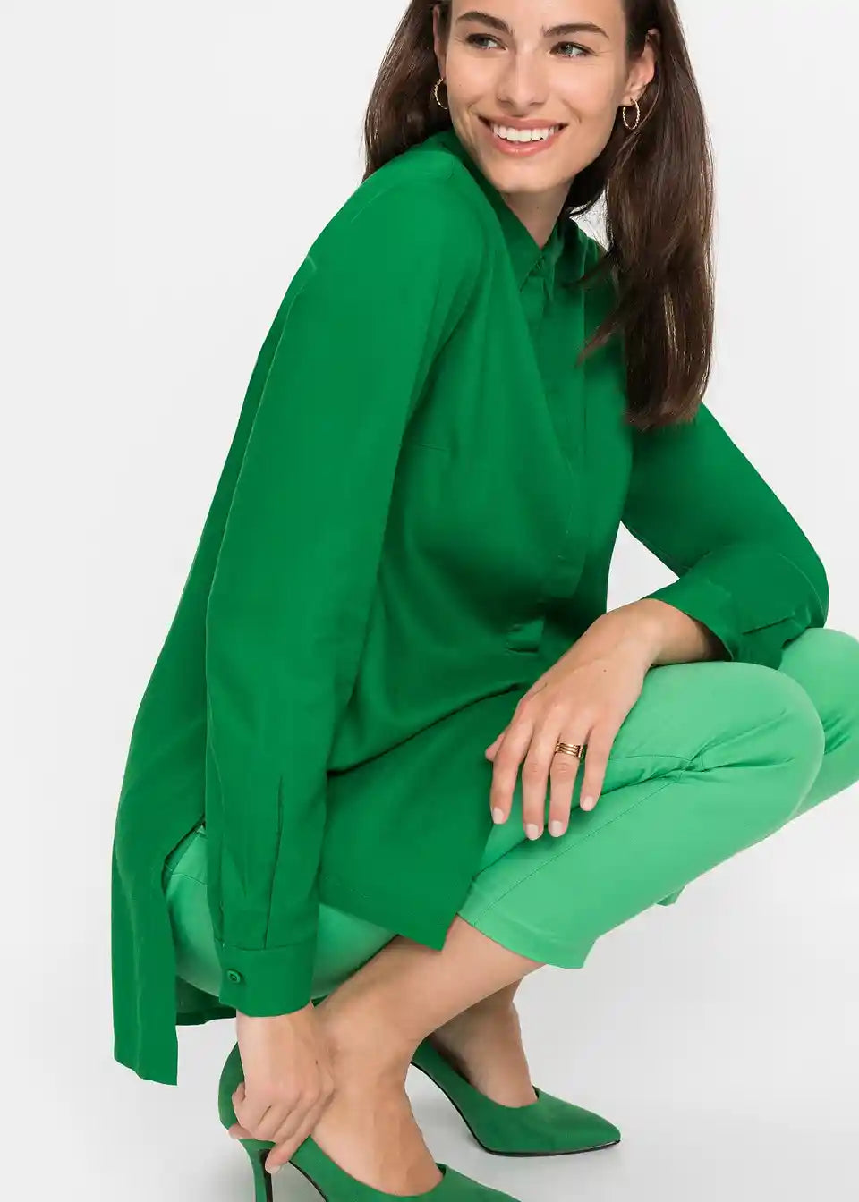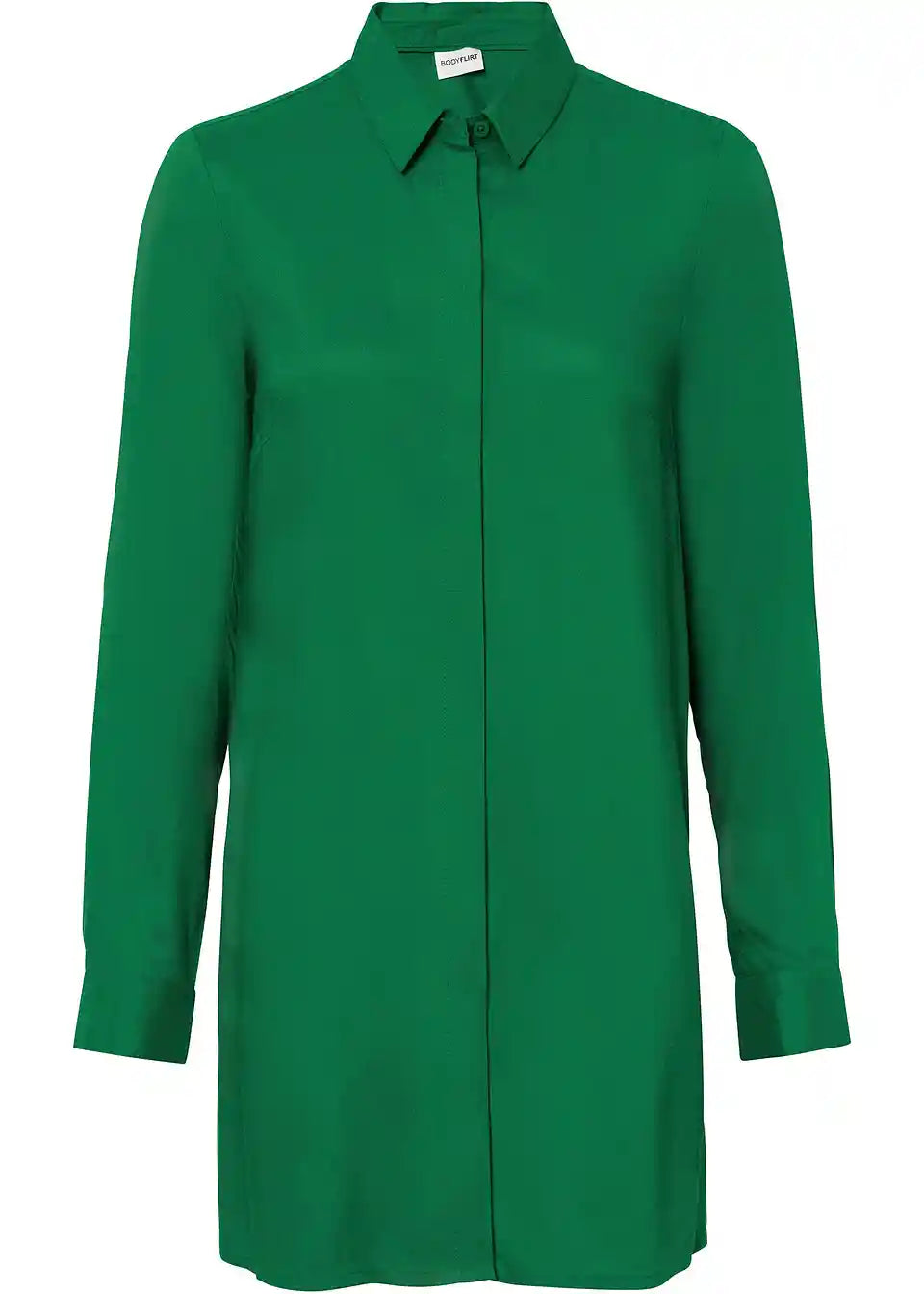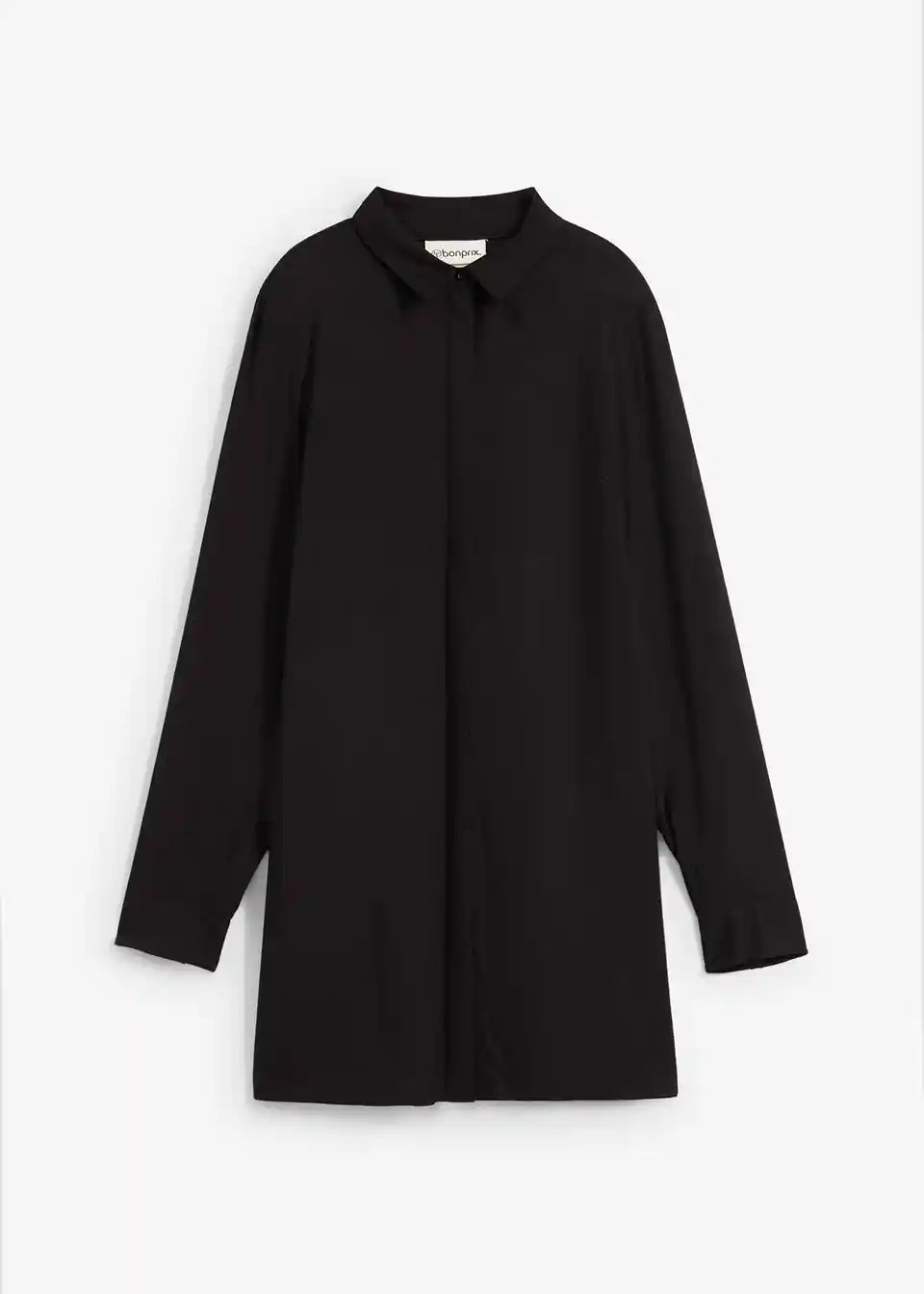 Moderna duga bluza s atraktivnim detaljem proreza i skrivenim kopčanjem na dugmad.