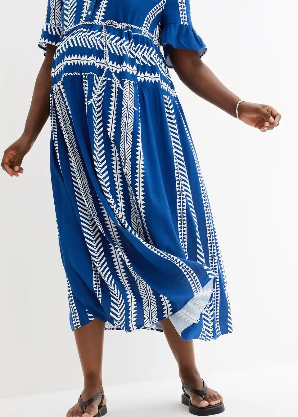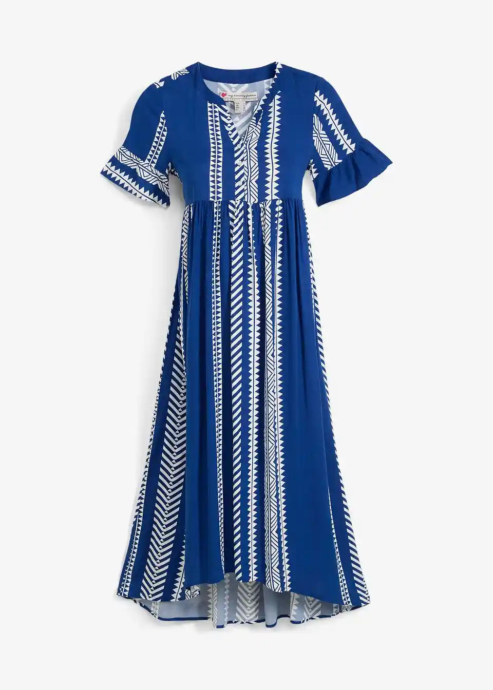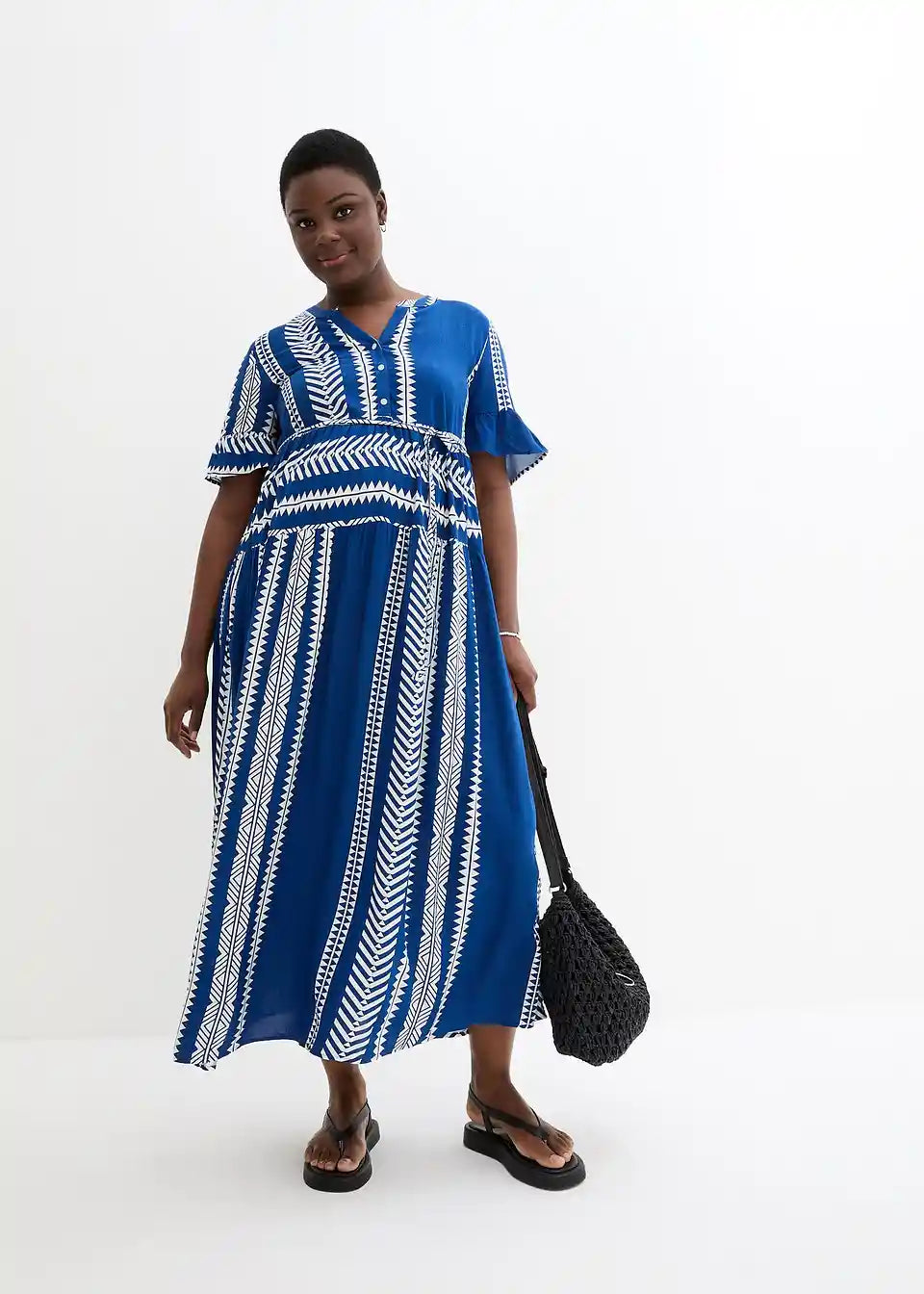 Duga haljina za trudnice s dovoljno prostora za rastući trbuh i praktičnim gumbima za dojenje.