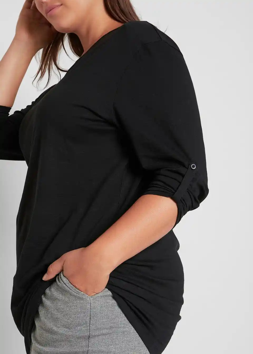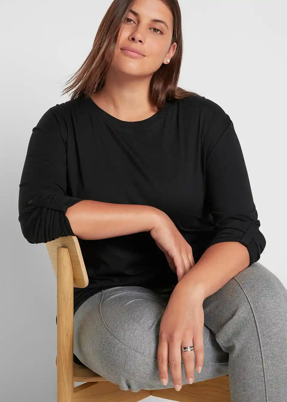 Široka dugih rukava - duga majica s decentnim okruglim izrezom, dugim rukavima s funkcijom motanja i ležernim krojem.