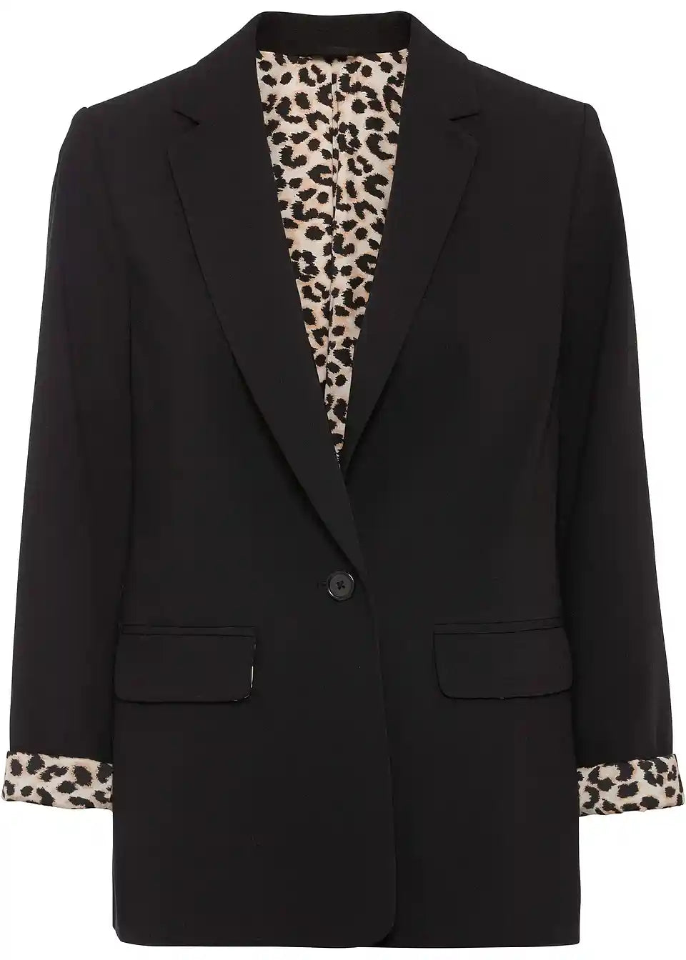 Moderan dugi blejzer s kopčanjem na gumb, zavrnutim rukavima i tiskanom podstavom