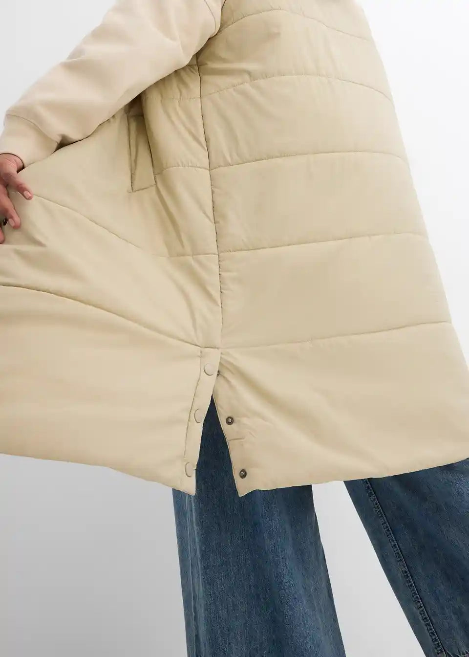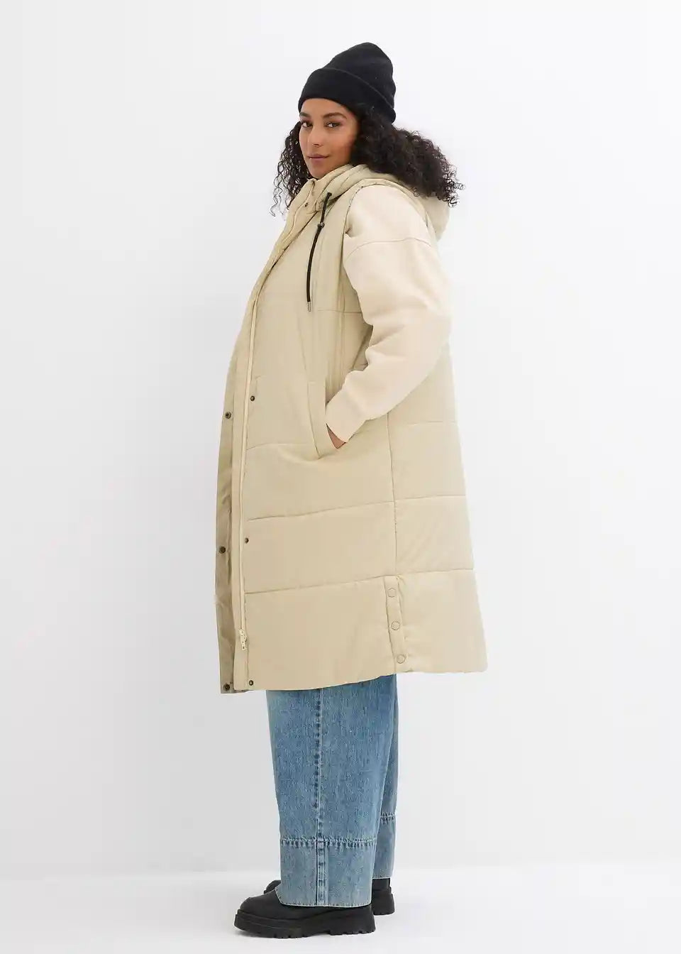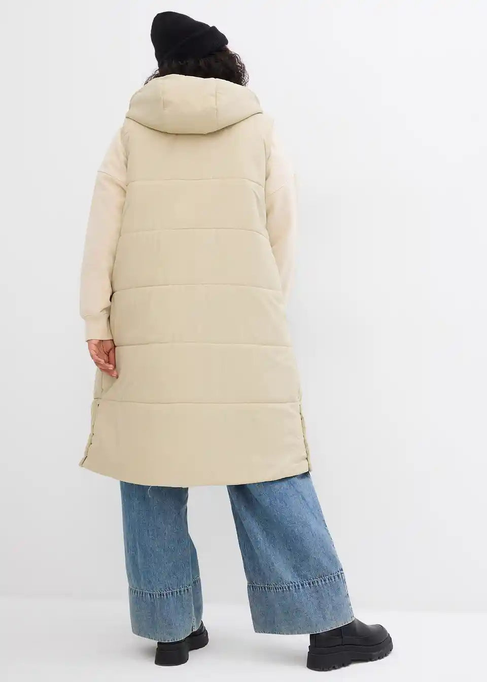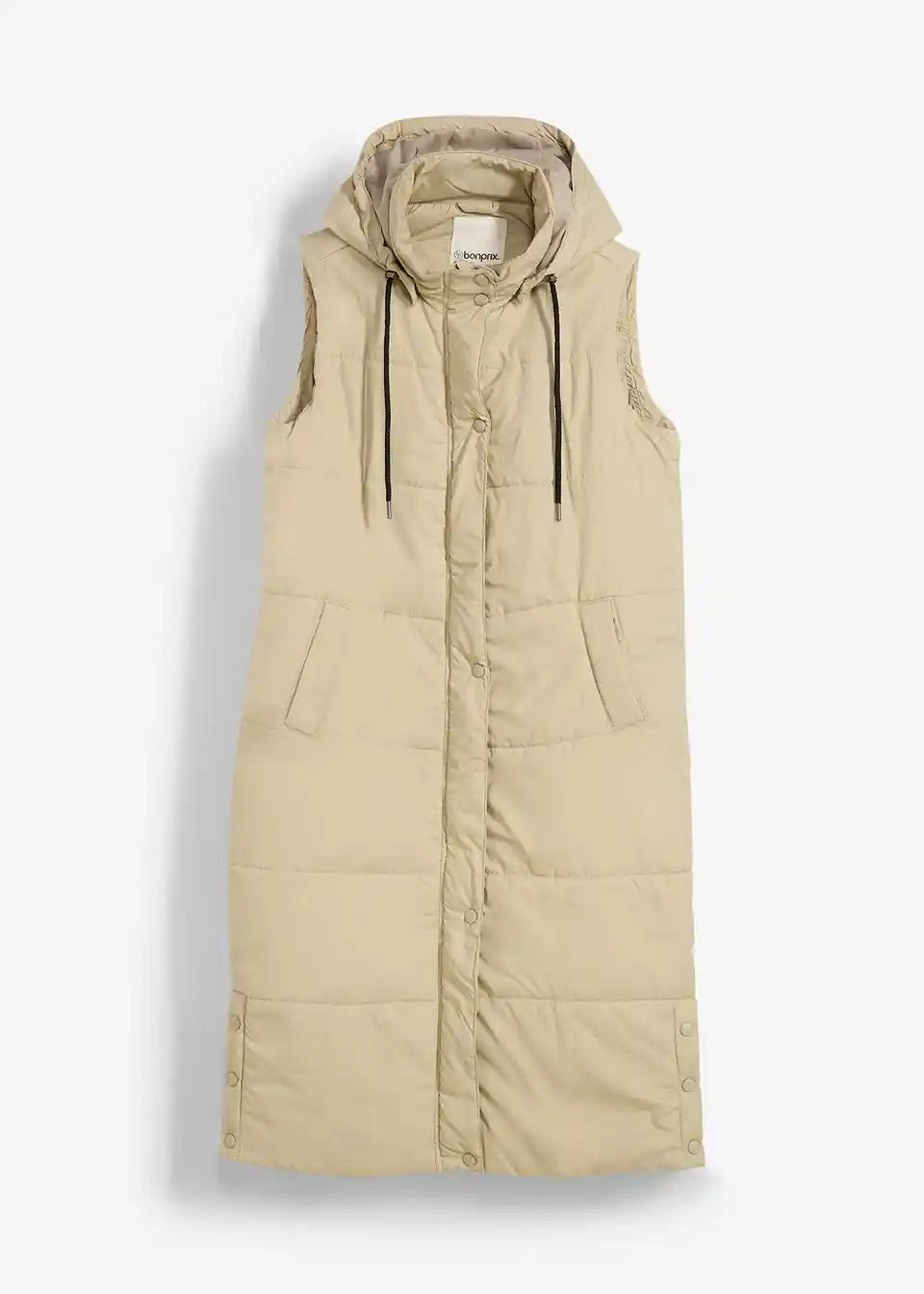 Dugi prošiveni prsluk s kapuljačom i prorezima sa strane