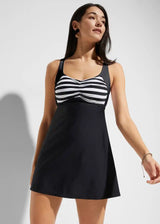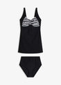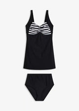 Ovaj vizualno privlačan dugi tankini oduševljava posebnim udobnostima nošenja. Tome pridonose duže rezani, široki gornji dio i hlače s visokim, lijepo oblikovanim strukom. Gornji dio s podesivim naramenicama naglašava privlačan kontrast boja. Podstava za grudi, uklonjivi mekani umetci i gumica ispod grudi osiguravaju dobru potporu i nježno oblikuju. Hlače s podstavom u području prepona upotpunjuju ovaj dugi tankini iz bpc kolekcije.
