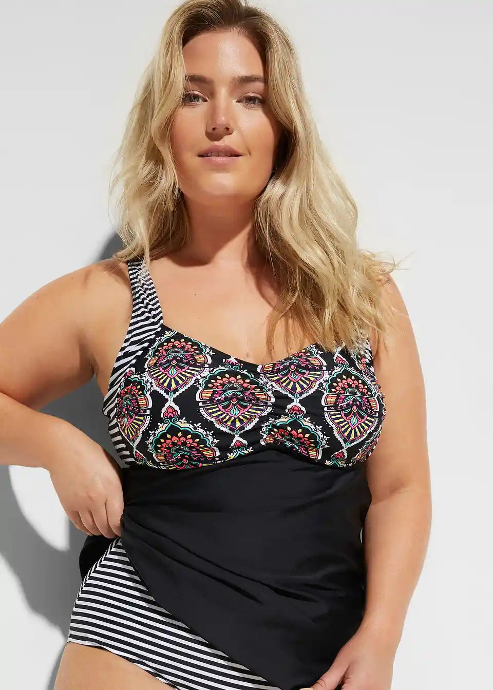 Dugi Tankini s visoko rezanim gaćicama. Podesive naramenice. Duži gornji dio s podstavom za grudi, uklonjivim Softcups-om i gumenom trakom ispod grudi. Bikini gaćice u struku.