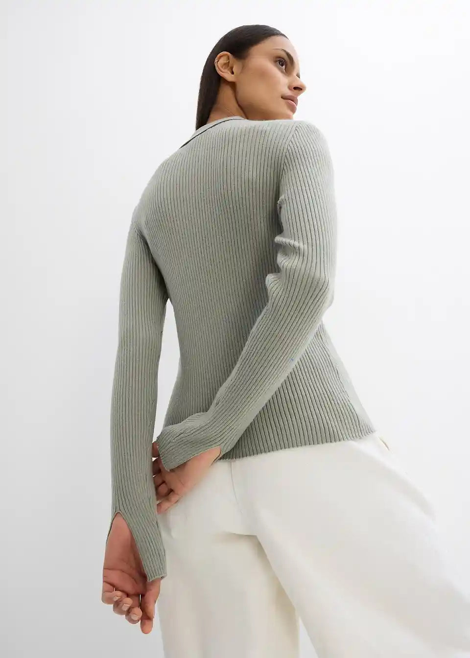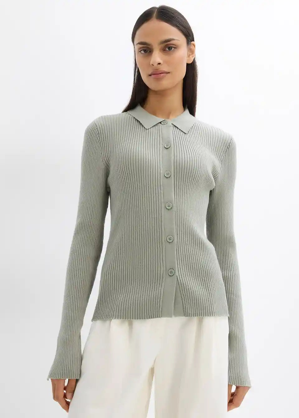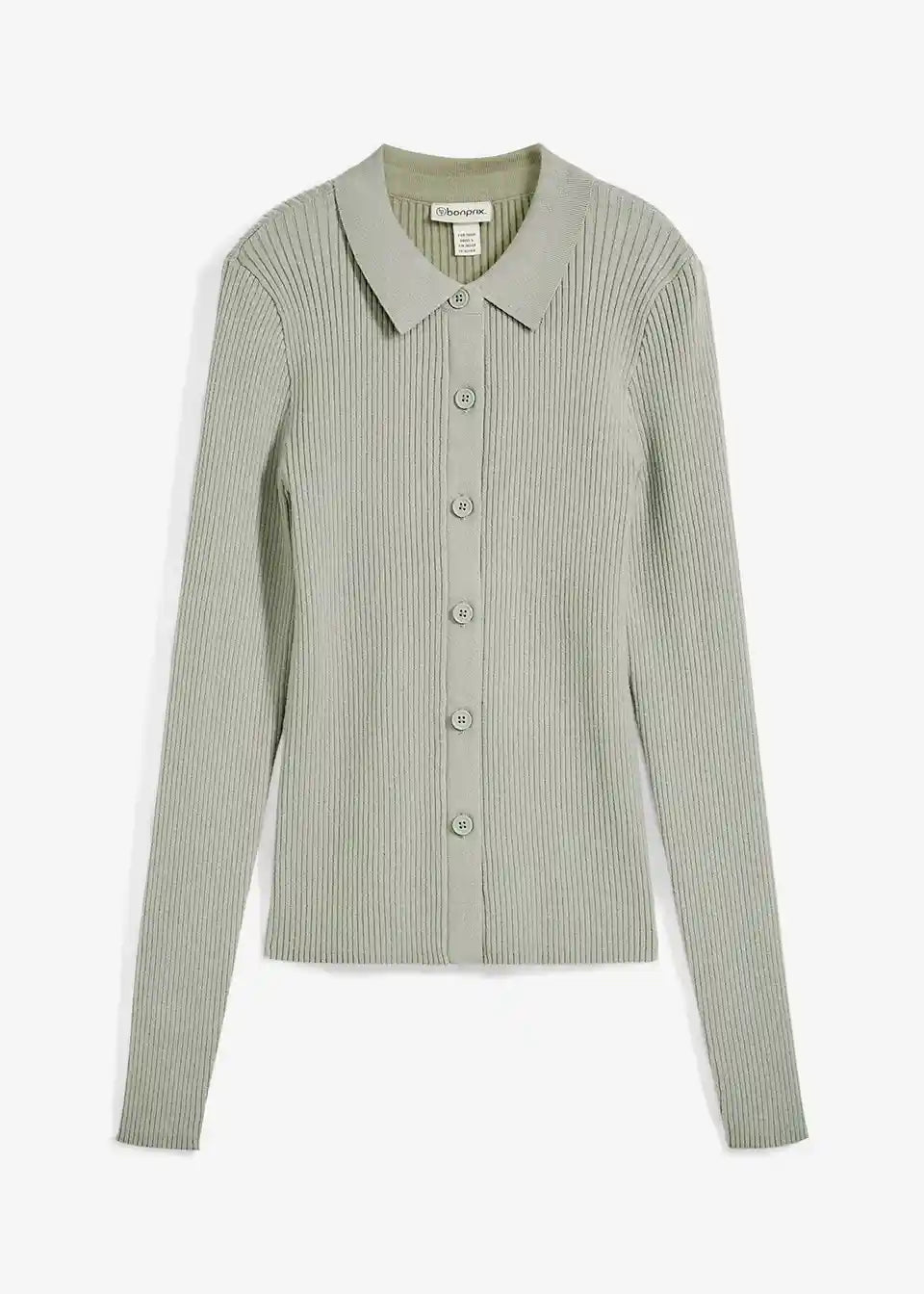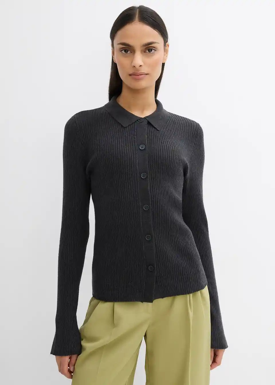 Rebrasta fina pletena jakna uskog kroja s šiljastim ovratnikom, gumbima u istoj boji i širokim prorezanim manšetama